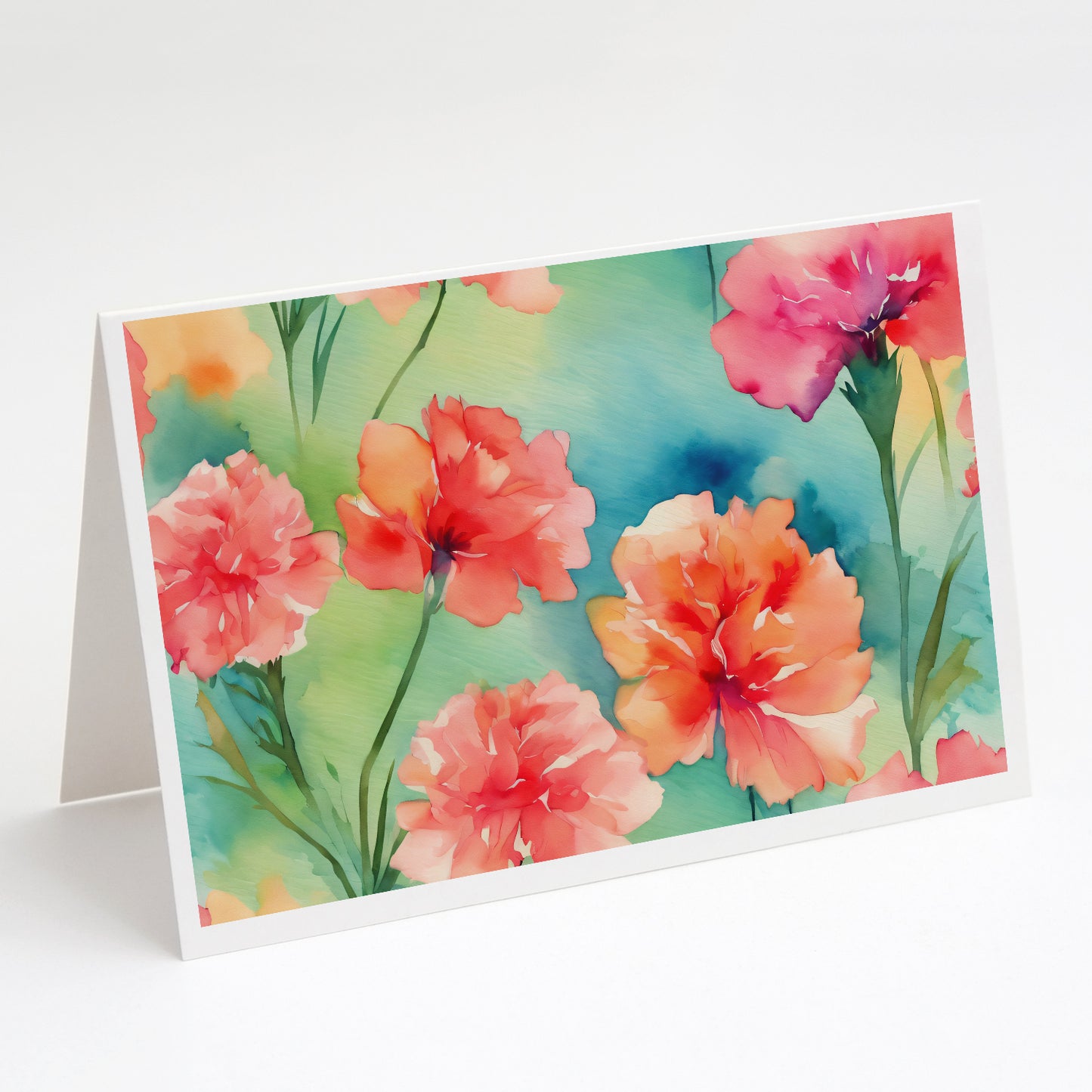 Greeting Cards Pack of 8 featuring breed specific Carnations artwork. Celebrate special moments with Caroline's Treasures Printed Greeting Card Pack. This pack includes eight beautifully folded 5x7 cards, accompanied by eight matching white envelopes. With blank interiors, these cards provide ample space for your personalized messages and heartfelt holiday greetings. Each card features captivating full-color artwork, meticulously printed in our facility on high-quality 80 lb cover stock or 216 GSM. The super smooth finish of the white cards enhances the visual impact of the artwork, creating a truly stunning presentation. Designed by our talented in-house artists or licensed artists, the artwork on these cards showcases their creativity and attention to detail. From vibrant illustrations to captivating designs, each card tells its own unique story. Whether it's for birthdays, anniversaries, holidays, or any special occasion, Caroline's Treasures Greeting Card Pack is the perfect way to convey your heartfelt sentiments. Share joy, love, and warm wishes with these exquisite cards and make every moment unforgettable.