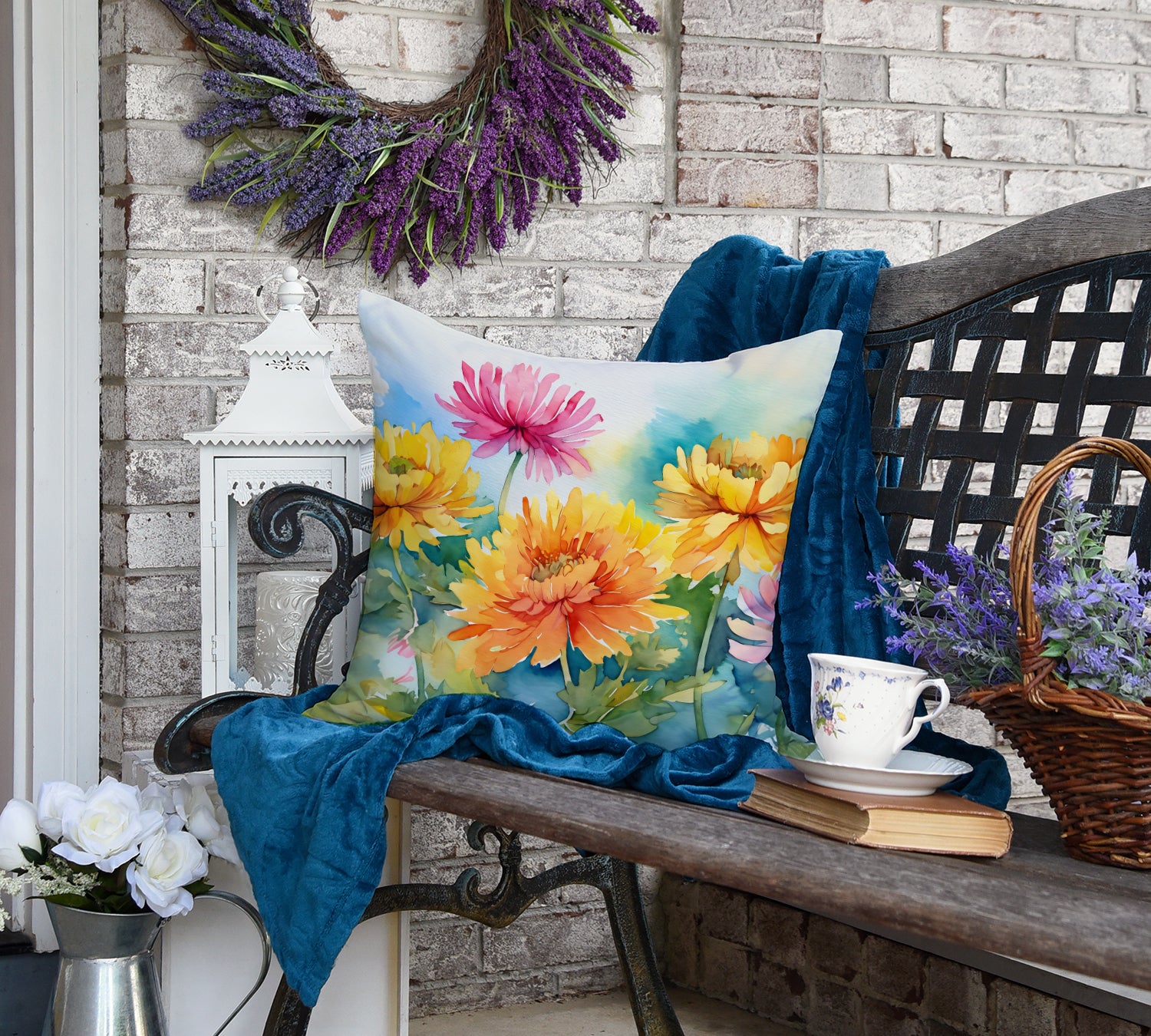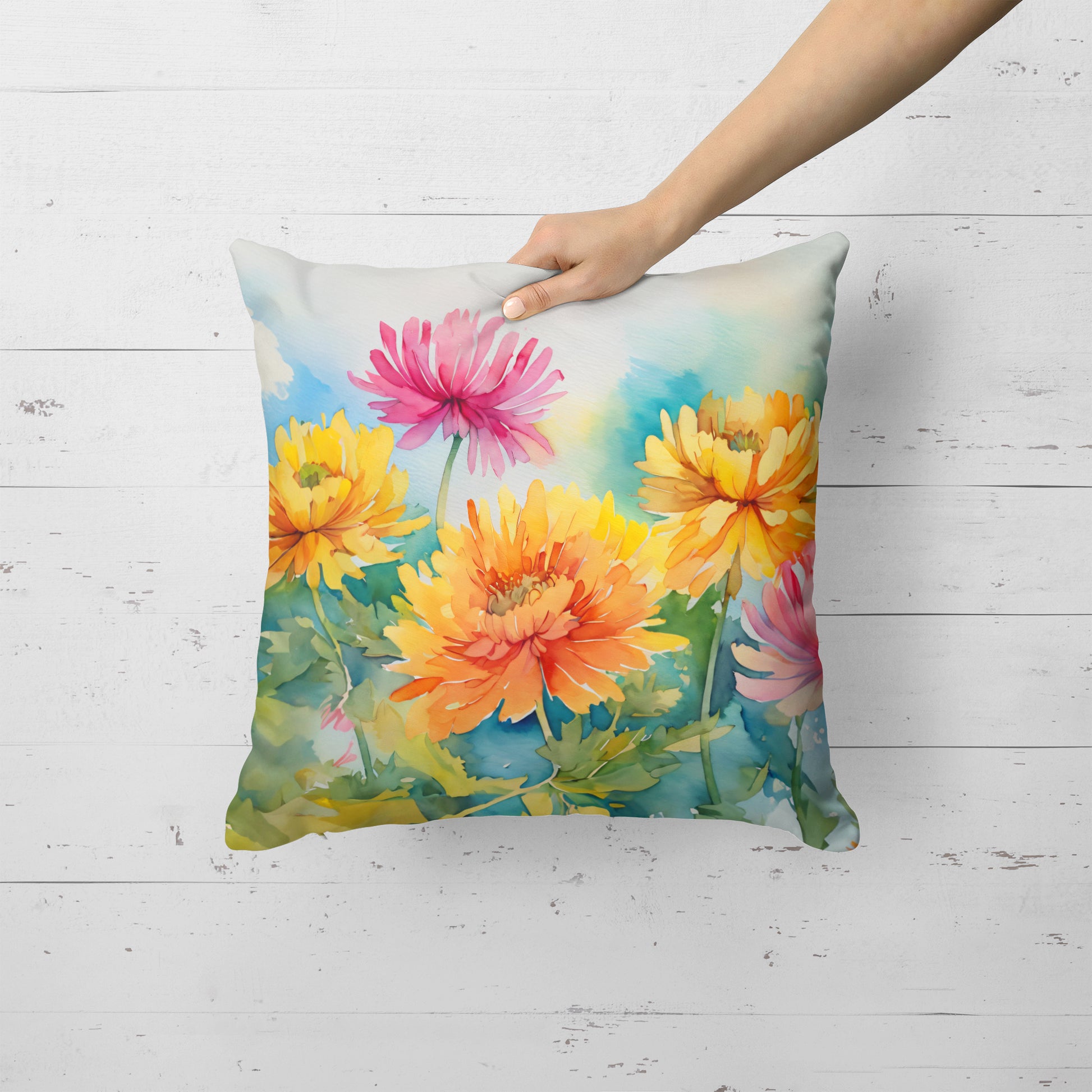 Throw Pillow featuring breed specific Chrysanthemums artwork. Revitalize your outdoor or indoor living space with Caroline's Treasures 18x18 Fabric Decorative Pillow. With a generously sized dimension of approximately 18 inches by 18 inches, this pillow makes a comfortable and aesthetic addition to any seating area. Made from a unique, water-resistant material developed by Caroline's Treasures, the pillow sham is 100% polyester fabric that's durable and ready to weather any condition. Its vibrant, full-color artwork will not fade over time as it is dyed with color-fast dyes. Whether you place it on your patio furniture, porch, veranda, or indoor couch, its soft canvas fabric ensures a cozy experience. The pillow is handcrafted in the United States, featuring a sham created from three pieces of fabric and a polyester insert for enduring shape and overstuffed comfort. Despite being robustly built to endure the outdoors, it is as soft and snug as your favorite indoor cushions. Please note, as all our pillows are handmade, sizes may vary slightly, adding to the charm of this unique decorative item.