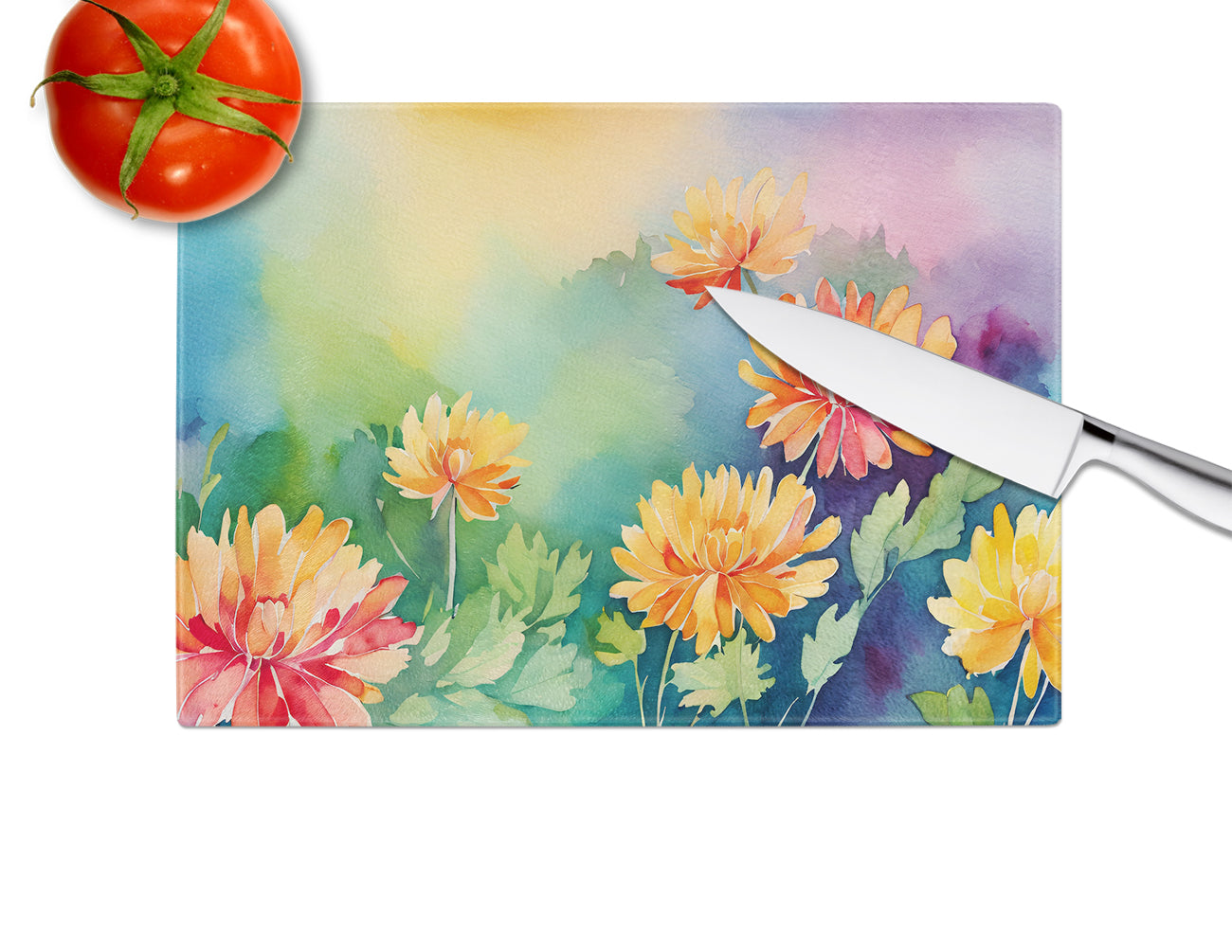 Glass Cutting Board featuring breed specific Chrysanthemums artwork. Introduce your kitchen to the vibrant, large Decorative Glass Cutting Board from Caroline's Treasures. Crafted from resilient tempered glass, this board is not only a utilitarian necessity but also a colorful art piece. With its generous dimensions of 15 inches in height and 12 inches in length, it offers ample space for all your cutting needs. Every piece showcases captivating artwork from distinguished artists, bringing an aesthetic edge to your kitchen. Beyond its attractive design, this cutting board ensures your countertop stays pristine and unscathed, owing to its heat-resistant properties. Engineered with user convenience in mind, it features non-skid feet for stability, and rounded corners for additional safety. Its robust construction renders it virtually unbreakable, guaranteeing longevity. The board comes with protective feet bumpers, maintaining its position during use. This product is recommended to be hand washed only. Proudly printed and assembled in the United States, this cutting board exemplifies superior craftsmanship. With Caroline's Treasures' Decorative Glass Cutting Board, you're investing in a blend of functionality and artistic flair.