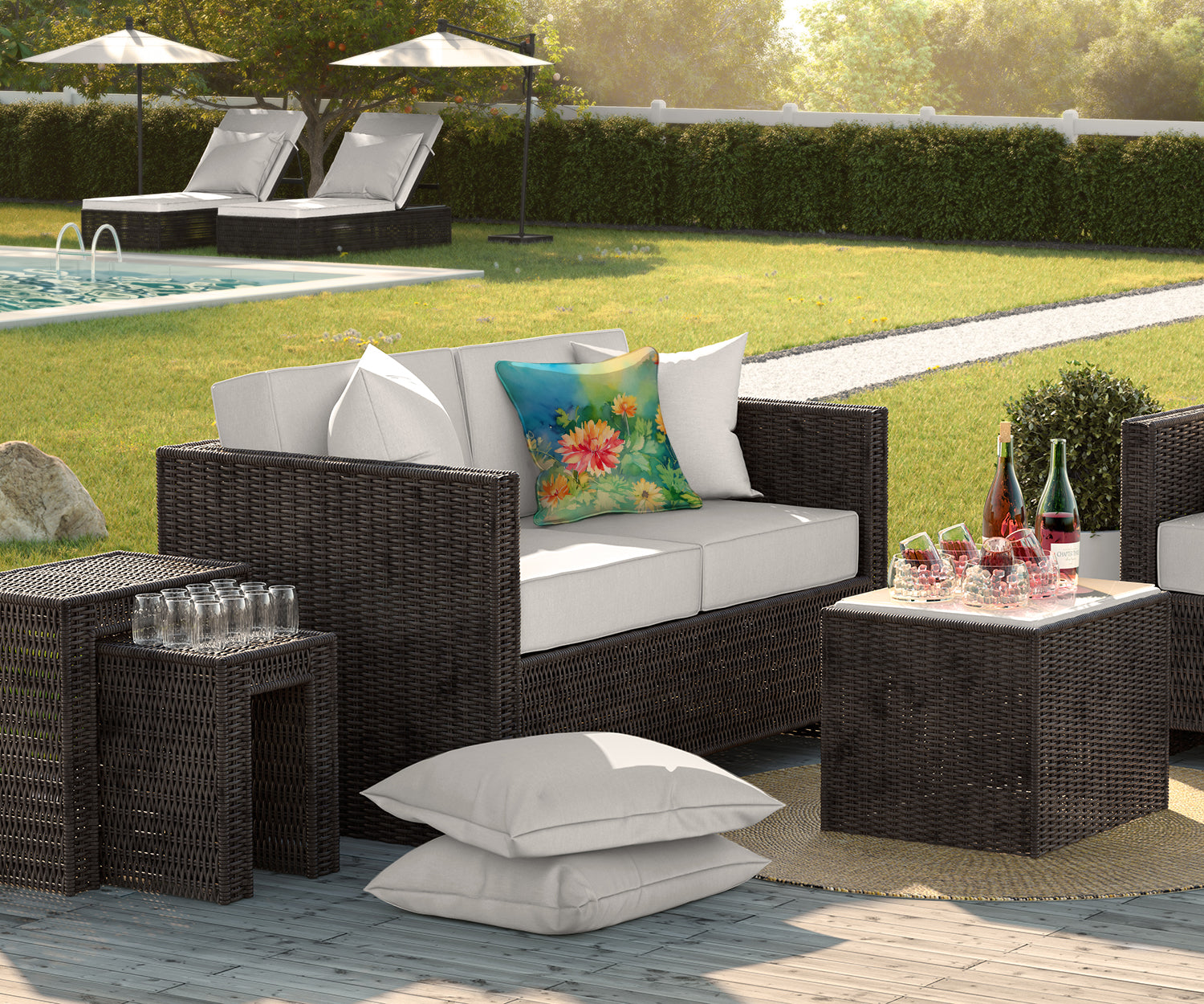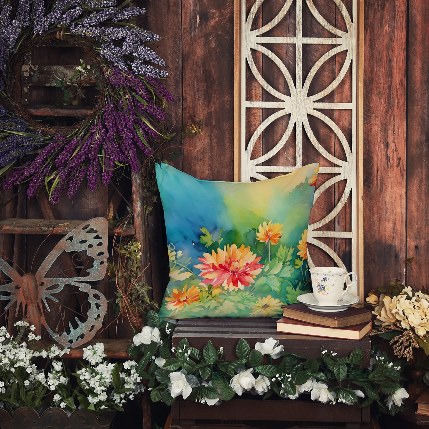 Throw Pillow featuring breed specific Chrysanthemums artwork. Revitalize your outdoor or indoor living space with Caroline's Treasures 18x18 Fabric Decorative Pillow. With a generously sized dimension of approximately 18 inches by 18 inches, this pillow makes a comfortable and aesthetic addition to any seating area. Made from a unique, water-resistant material developed by Caroline's Treasures, the pillow sham is 100% polyester fabric that's durable and ready to weather any condition. Its vibrant, full-color artwork will not fade over time as it is dyed with color-fast dyes. Whether you place it on your patio furniture, porch, veranda, or indoor couch, its soft canvas fabric ensures a cozy experience. The pillow is handcrafted in the United States, featuring a sham created from three pieces of fabric and a polyester insert for enduring shape and overstuffed comfort. Despite being robustly built to endure the outdoors, it is as soft and snug as your favorite indoor cushions. Please note, as all our pillows are handmade, sizes may vary slightly, adding to the charm of this unique decorative item.