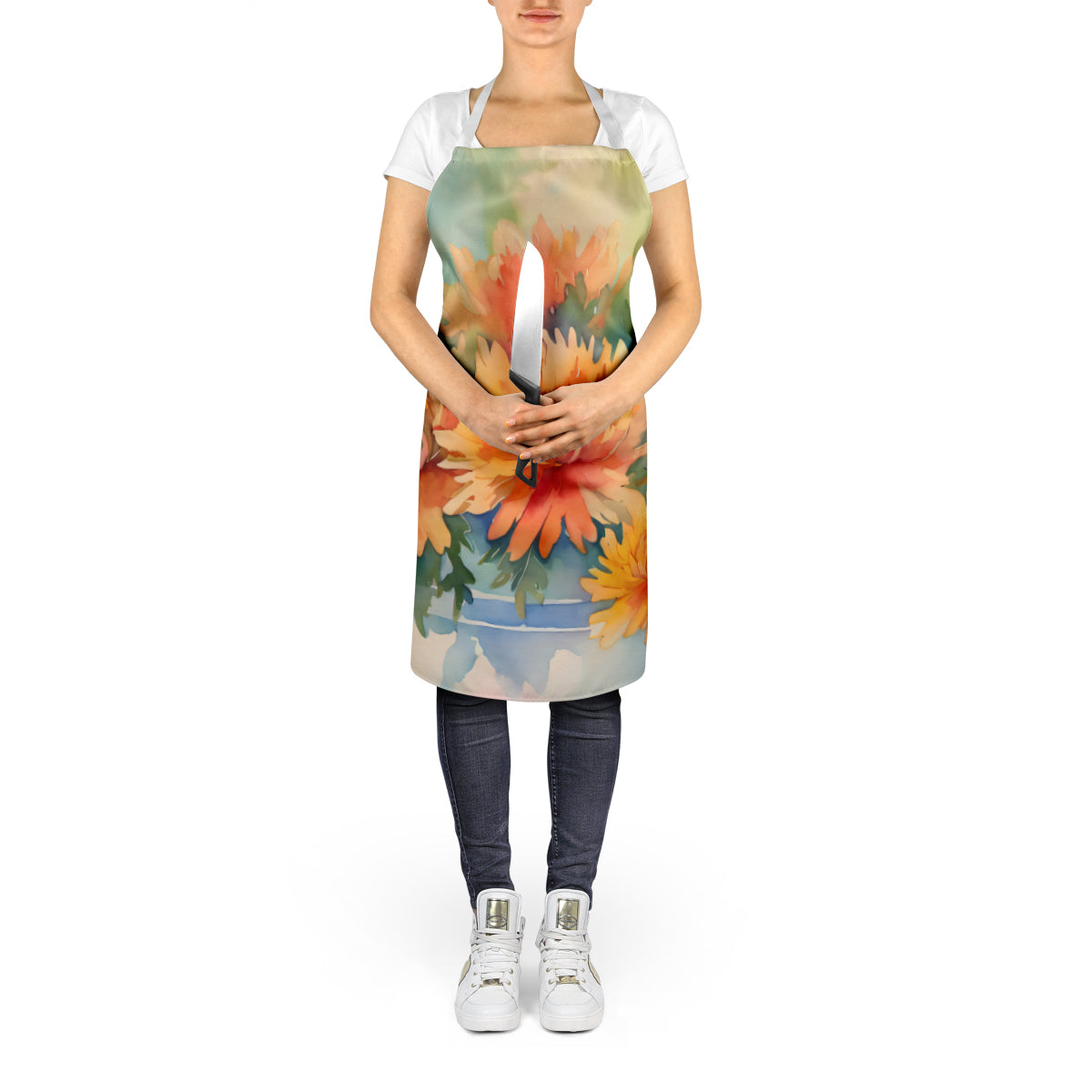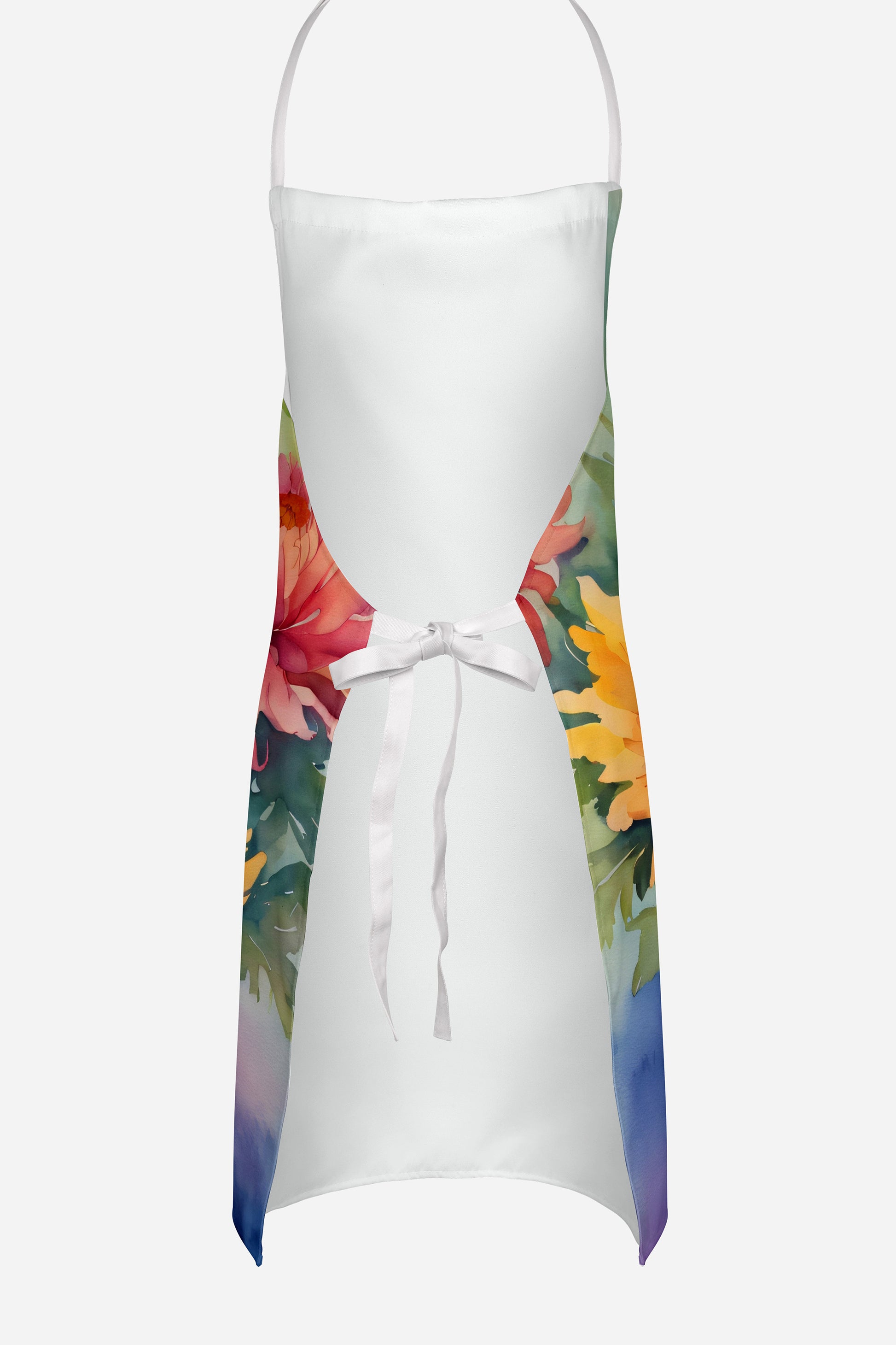 Apron featuring breed specific Chrysanthemums artwork. Elevate your cooking, baking, and grilling experiences with our versatile Kitchen or BBQ Apron. This Bib Style apron isn't just limited to culinary activities - it also serves as an excellent baking apron, artist apron, server apron, gardening apron, or even a dog grooming apron. The apron showcases vibrant full-color artwork contributed by one of our talented artists, bringing a dash of style to your daily tasks. With dimensions of approximately 27"W x 30"H, it provides ample coverage to protect your clothing from spills and splashes. Our apron is meticulously crafted from 100% Ultra Spun Polyester, known for its durability and lightweight nature. The apron comes with white tie straps, ensuring a comfortable and adjustable fit for all. It's a perfect choice for kitchen apron enthusiasts, whether you are a woman or a man. Designed for easy maintenance, this apron is fully machine washable. The quick-drying polyester material actively reduces staining, keeping your apron looking fresh and new for longer. Our beautifully designed apron isn't just a functional kitchen accessory - it's a fashion statement in the culinary world!