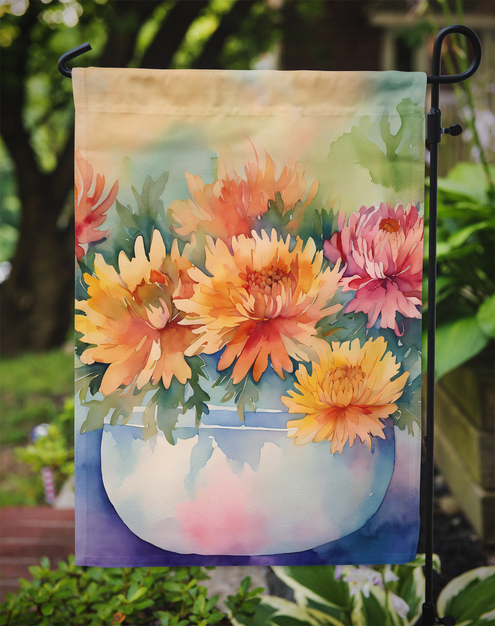 Garden Flag featuring breed specific Chrysanthemums artwork. Enhance the beauty of your garden, patio, or yard with Caroline's Treasures Decorative Garden Flag, proudly made in the USA. Crafted from two pieces of thick, double-sided polyester fabric, this 2-ply garden flag is designed to withstand various weather conditions, making it water-resistant and weatherproof. Featuring correctly readable words on both sides, this garden flag offers a delightful visual experience from any angle. With its heavier weight, it stands out among other garden flags, ensuring stability and durability even in wind, rain, and snow. Measuring approximately 11 1/4 inches by 15 1/2 inches, this flag allows you to personalize your outdoor decor. It comes with a 1 1/2-inch sleeve sewn in, allowing easy attachment to any standard garden flag stand or garden size porch hanger (sold separately). Make a statement in your outdoor space with Caroline's Treasures Decorative Garden Flag, a vibrant and high-quality flag that adds color and personality to your surroundings. Proudly made in the USA, it's a symbol of quality craftsmanship and attention to detail.