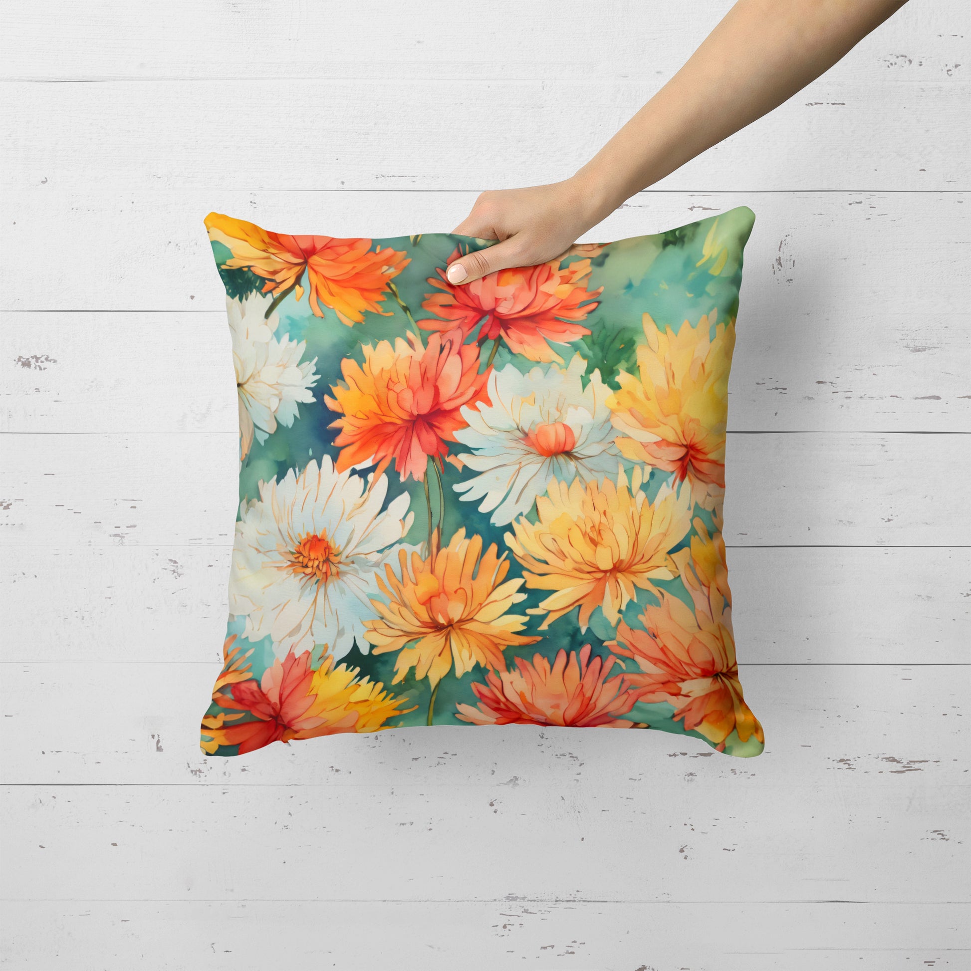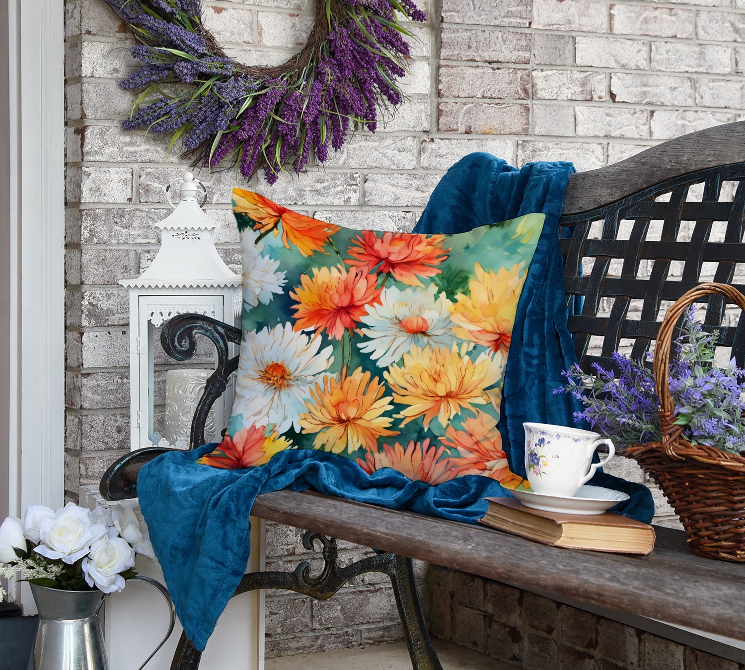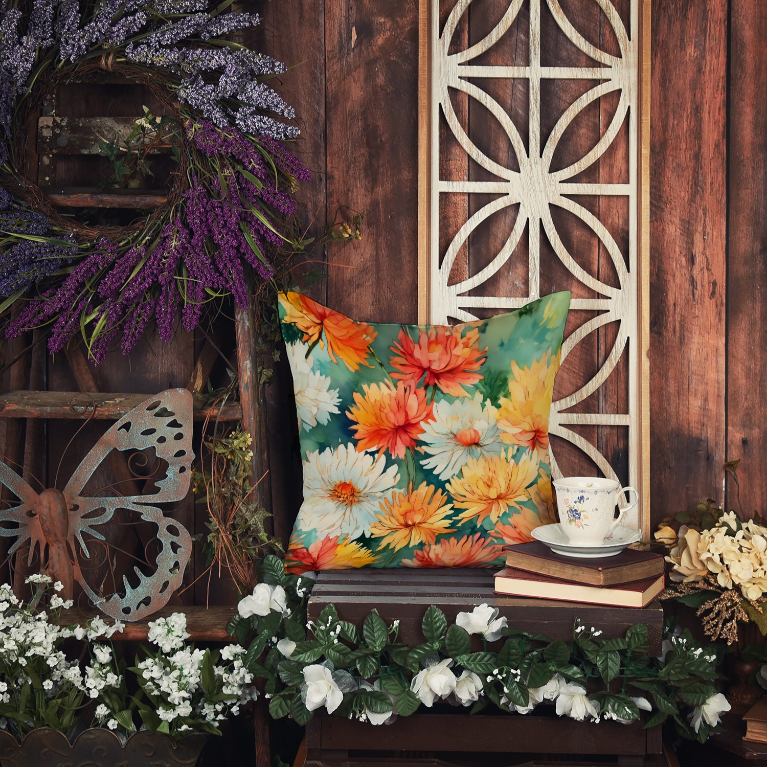 Throw Pillow featuring breed specific Chrysanthemums artwork. Revitalize your outdoor or indoor living space with Caroline's Treasures 18x18 Fabric Decorative Pillow. With a generously sized dimension of approximately 18 inches by 18 inches, this pillow makes a comfortable and aesthetic addition to any seating area. Made from a unique, water-resistant material developed by Caroline's Treasures, the pillow sham is 100% polyester fabric that's durable and ready to weather any condition. Its vibrant, full-color artwork will not fade over time as it is dyed with color-fast dyes. Whether you place it on your patio furniture, porch, veranda, or indoor couch, its soft canvas fabric ensures a cozy experience. The pillow is handcrafted in the United States, featuring a sham created from three pieces of fabric and a polyester insert for enduring shape and overstuffed comfort. Despite being robustly built to endure the outdoors, it is as soft and snug as your favorite indoor cushions. Please note, as all our pillows are handmade, sizes may vary slightly, adding to the charm of this unique decorative item.