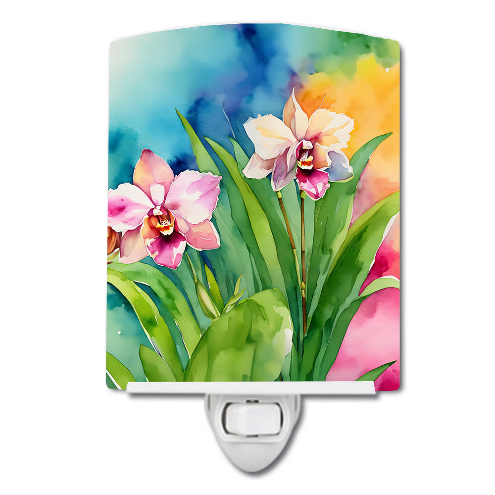 Ceramic Night Light featuring breed specific Orchids artwork. Introduce a splash of artistic flair and subtle illumination to your space with the Decorative Ceramic Night Light from Caroline's Treasures. Perfect for any room, this night light seamlessly blends functionality with an aesthetic appeal, offering a stylish solution to brighten up dark corners of your home or office. Boasting a six-inch high by four-inch wide ceramic tile at the front, it showcases vivid, full-color artwork from distinguished artists, transforming a simple utility into a vibrant art piece. The artwork is securely encased in a robust metal holder, ensuring durability and longevity. Two screws are provided to firmly affix the tile into the holder. The holder extends three inches deep, housing an included bulb that emits a soft, welcoming glow. This product meets all safety standards, as evidenced by its UL approval. Proudly made in the United States from imported components, this Decorative Ceramic Night Light is not just a functional device; it's a statement piece that enhances the ambiance of your surroundings.