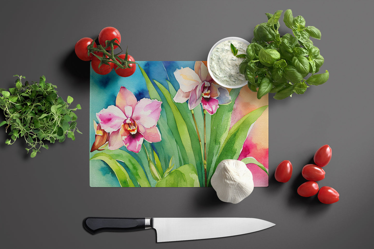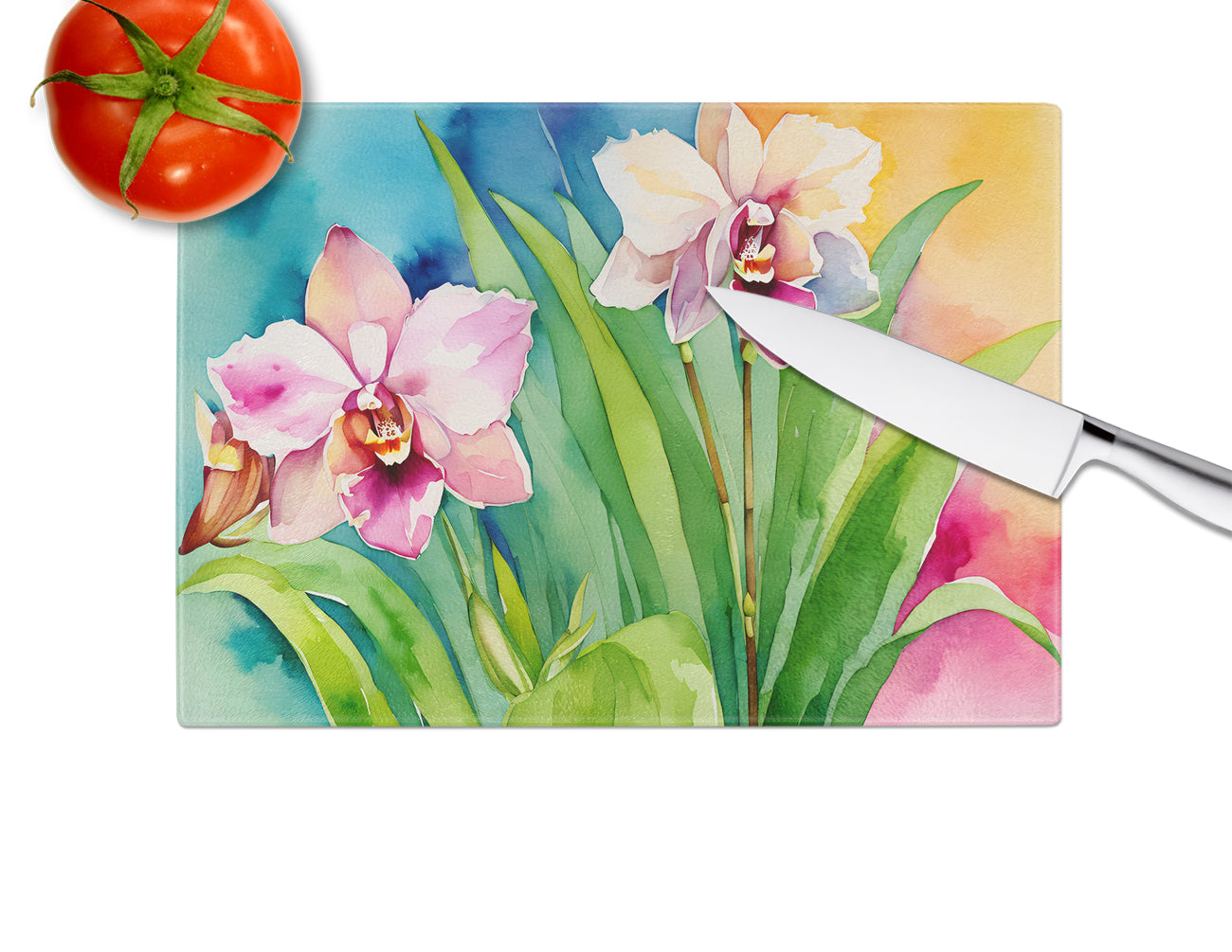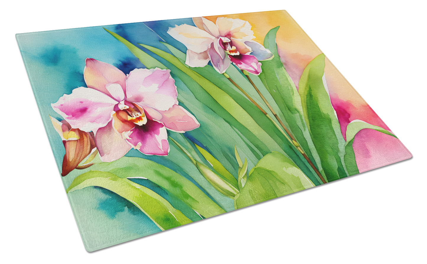Glass Cutting Board featuring breed specific Orchids artwork. Introduce your kitchen to the vibrant, large Decorative Glass Cutting Board from Caroline's Treasures. Crafted from resilient tempered glass, this board is not only a utilitarian necessity but also a colorful art piece. With its generous dimensions of 15 inches in height and 12 inches in length, it offers ample space for all your cutting needs. Every piece showcases captivating artwork from distinguished artists, bringing an aesthetic edge to your kitchen. Beyond its attractive design, this cutting board ensures your countertop stays pristine and unscathed, owing to its heat-resistant properties. Engineered with user convenience in mind, it features non-skid feet for stability, and rounded corners for additional safety. Its robust construction renders it virtually unbreakable, guaranteeing longevity. The board comes with protective feet bumpers, maintaining its position during use. This product is recommended to be hand washed only. Proudly printed and assembled in the United States, this cutting board exemplifies superior craftsmanship. With Caroline's Treasures' Decorative Glass Cutting Board, you're investing in a blend of functionality and artistic flair.