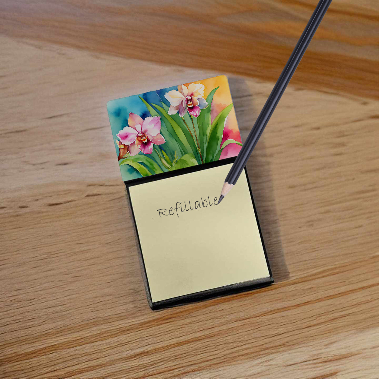 Sticky Note Holder featuring breed specific Orchids artwork. Add a touch of creativity and flair to your desk with the Decorative Sticky Note Holder from Caroline's Treasures. This uniquely designed sticky note dispenser will not only keep your notes in one place but also add an artistic element to your workspace. The top of the holder features beautiful artwork that is sure to catch the eye. Crafted for convenience, this sticky note holder comes with a small pad of 3-inch x 3-inch sticky notes at the bottom. The holder is designed for easy refilling; simply remove the last sheet of a new sticky note pad and stick it onto the board. This feature ensures you will always have sticky notes at your disposal. This Sticky Note Holder makes a perfect gift. Be it for your colleagues at work, your Facebook friends, or even your dog groomer or hairdresser, this versatile product fits the bill. You can use it for making grocery lists, leaving notes for loved ones, or for jotting down important reminders. The bottom board is rigid and can be magnetized by adding a business card size magnet to the back (sold separately). This makes it even more versatile, allowing you to place it on a refrigerator or any other magnetic surface. With this Sticky Note Holder, you're not only organizing your notes, but also personalizing your space.