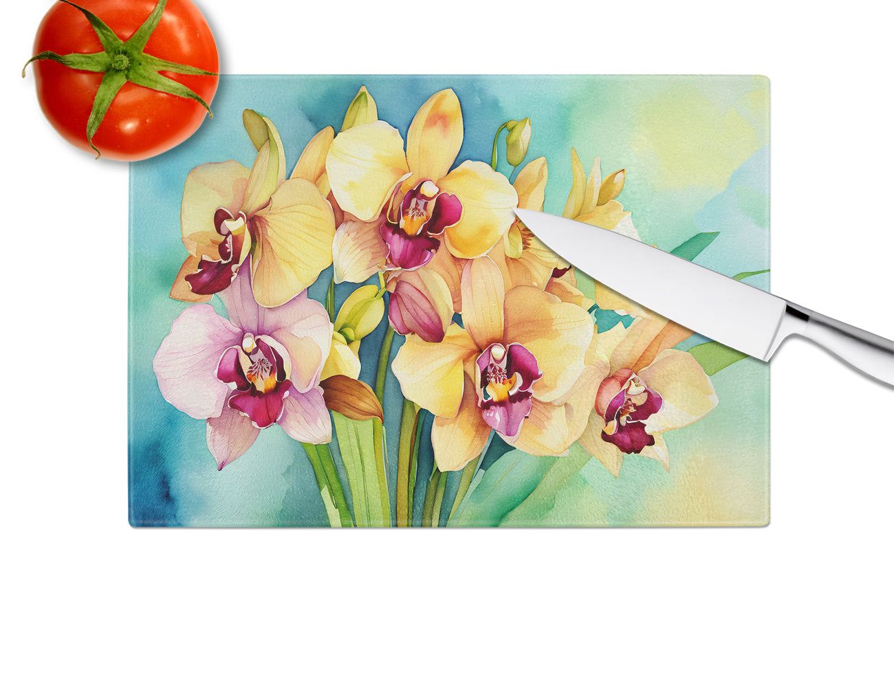Glass Cutting Board featuring breed specific Orchids artwork. Introduce your kitchen to the vibrant, large Decorative Glass Cutting Board from Caroline's Treasures. Crafted from resilient tempered glass, this board is not only a utilitarian necessity but also a colorful art piece. With its generous dimensions of 15 inches in height and 12 inches in length, it offers ample space for all your cutting needs. Every piece showcases captivating artwork from distinguished artists, bringing an aesthetic edge to your kitchen. Beyond its attractive design, this cutting board ensures your countertop stays pristine and unscathed, owing to its heat-resistant properties. Engineered with user convenience in mind, it features non-skid feet for stability, and rounded corners for additional safety. Its robust construction renders it virtually unbreakable, guaranteeing longevity. The board comes with protective feet bumpers, maintaining its position during use. This product is recommended to be hand washed only. Proudly printed and assembled in the United States, this cutting board exemplifies superior craftsmanship. With Caroline's Treasures' Decorative Glass Cutting Board, you're investing in a blend of functionality and artistic flair.