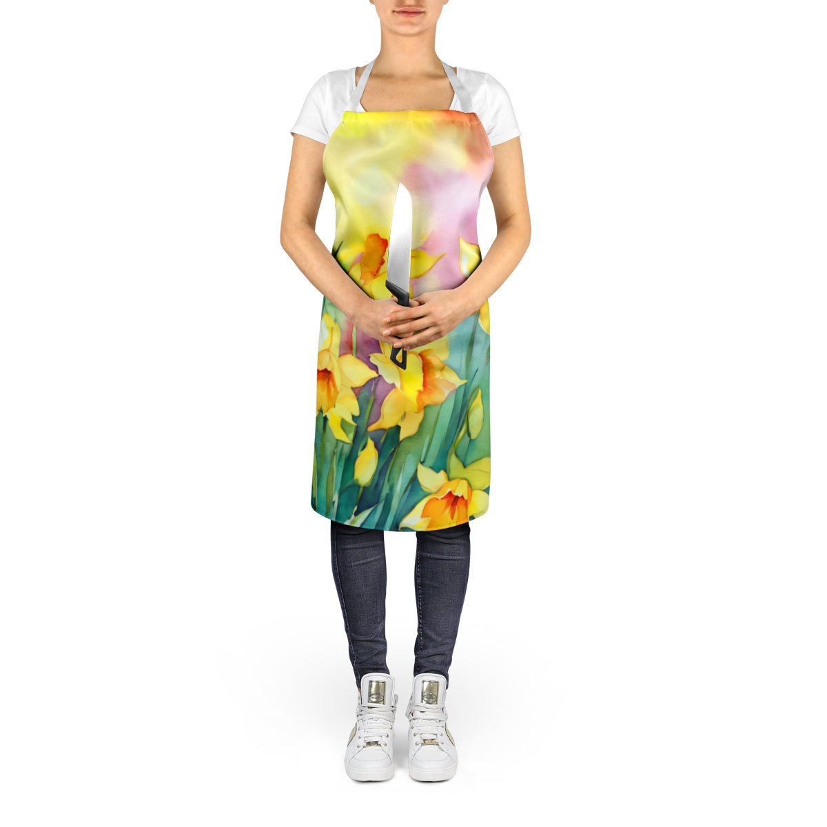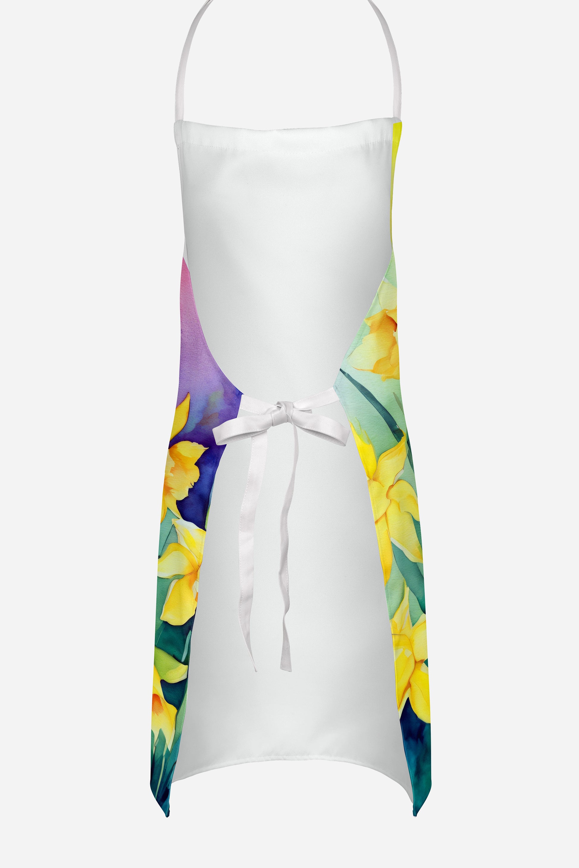 Apron featuring breed specific Daffodils artwork. Elevate your cooking, baking, and grilling experiences with our versatile Kitchen or BBQ Apron. This Bib Style apron isn't just limited to culinary activities - it also serves as an excellent baking apron, artist apron, server apron, gardening apron, or even a dog grooming apron. The apron showcases vibrant full-color artwork contributed by one of our talented artists, bringing a dash of style to your daily tasks. With dimensions of approximately 27"W x 30"H, it provides ample coverage to protect your clothing from spills and splashes. Our apron is meticulously crafted from 100% Ultra Spun Polyester, known for its durability and lightweight nature. The apron comes with white tie straps, ensuring a comfortable and adjustable fit for all. It's a perfect choice for kitchen apron enthusiasts, whether you are a woman or a man. Designed for easy maintenance, this apron is fully machine washable. The quick-drying polyester material actively reduces staining, keeping your apron looking fresh and new for longer. Our beautifully designed apron isn't just a functional kitchen accessory - it's a fashion statement in the culinary world!
