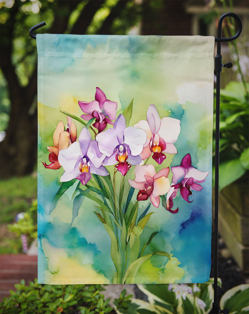 Garden Flag featuring breed specific Orchids artwork. Enhance the beauty of your garden, patio, or yard with Caroline's Treasures Decorative Garden Flag, proudly made in the USA. Crafted from two pieces of thick, double-sided polyester fabric, this 2-ply garden flag is designed to withstand various weather conditions, making it water-resistant and weatherproof. Featuring correctly readable words on both sides, this garden flag offers a delightful visual experience from any angle. With its heavier weight, it stands out among other garden flags, ensuring stability and durability even in wind, rain, and snow. Measuring approximately 11 1/4 inches by 15 1/2 inches, this flag allows you to personalize your outdoor decor. It comes with a 1 1/2-inch sleeve sewn in, allowing easy attachment to any standard garden flag stand or garden size porch hanger (sold separately). Make a statement in your outdoor space with Caroline's Treasures Decorative Garden Flag, a vibrant and high-quality flag that adds color and personality to your surroundings. Proudly made in the USA, it's a symbol of quality craftsmanship and attention to detail.