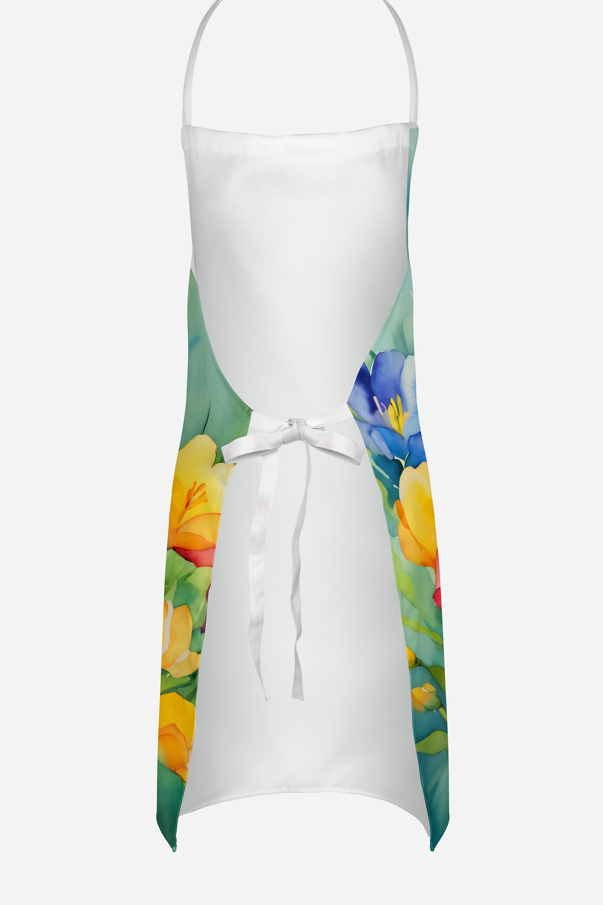 Apron featuring breed specific Freesias artwork. Elevate your cooking, baking, and grilling experiences with our versatile Kitchen or BBQ Apron. This Bib Style apron isn't just limited to culinary activities - it also serves as an excellent baking apron, artist apron, server apron, gardening apron, or even a dog grooming apron. The apron showcases vibrant full-color artwork contributed by one of our talented artists, bringing a dash of style to your daily tasks. With dimensions of approximately 27"W x 30"H, it provides ample coverage to protect your clothing from spills and splashes. Our apron is meticulously crafted from 100% Ultra Spun Polyester, known for its durability and lightweight nature. The apron comes with white tie straps, ensuring a comfortable and adjustable fit for all. It's a perfect choice for kitchen apron enthusiasts, whether you are a woman or a man. Designed for easy maintenance, this apron is fully machine washable. The quick-drying polyester material actively reduces staining, keeping your apron looking fresh and new for longer. Our beautifully designed apron isn't just a functional kitchen accessory - it's a fashion statement in the culinary world!