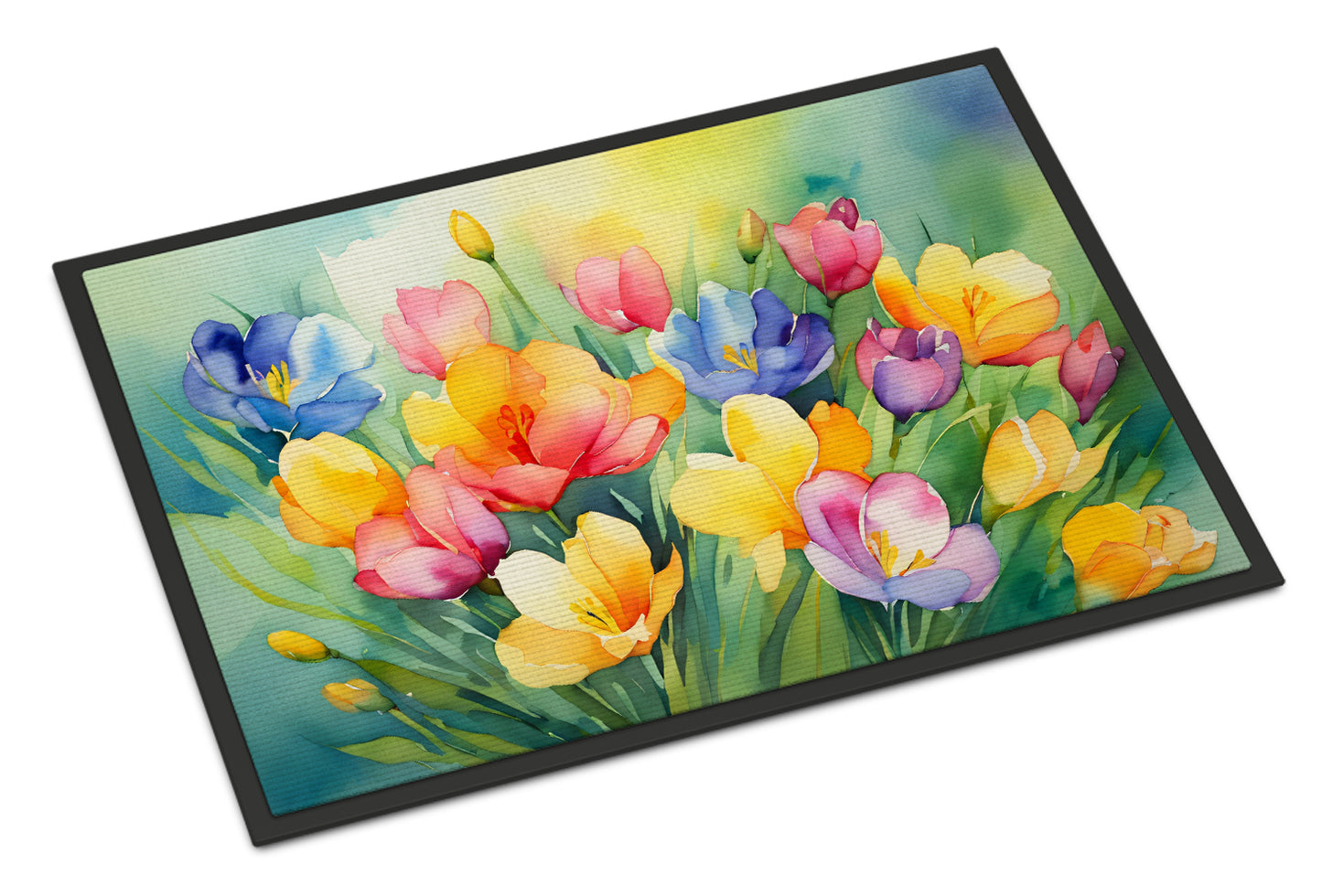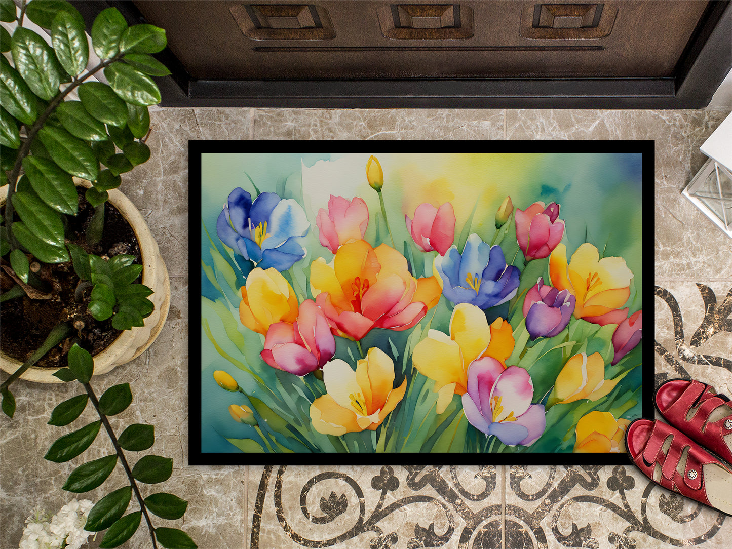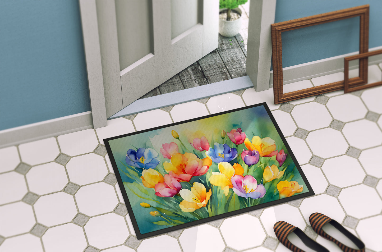 Doormat featuring breed specific Freesias artwork. Welcome your guests in style with our Artwork Door Mat, designed to withstand almost any weather condition. This mat, measuring approximately 24 by 36 inches, is held together by durable black binding tape. Its top layer, composed of polyester felt, is dyed with the eye-catching image you see on the mat. A few layers below provide the mat with stability, while its rubber bottom is stamped to help prevent slipping and ensures safety. Our mat works wonderfully as both an indoor or outdoor door mat. For cleaning, simply hose it off with water or use a power washer - no need for any cleaner that produces suds. Avoid scrubbing with a brush, instead, opt for the vacuum on floor setting. Designed manufactured and printed in the USA, this mat is a perfect addition to your porch, outdoor kitchen, entryway, or any indoor space. Its unique design makes it a charming decorative rug that greets your guests and adds a stylish touch to your home decor.