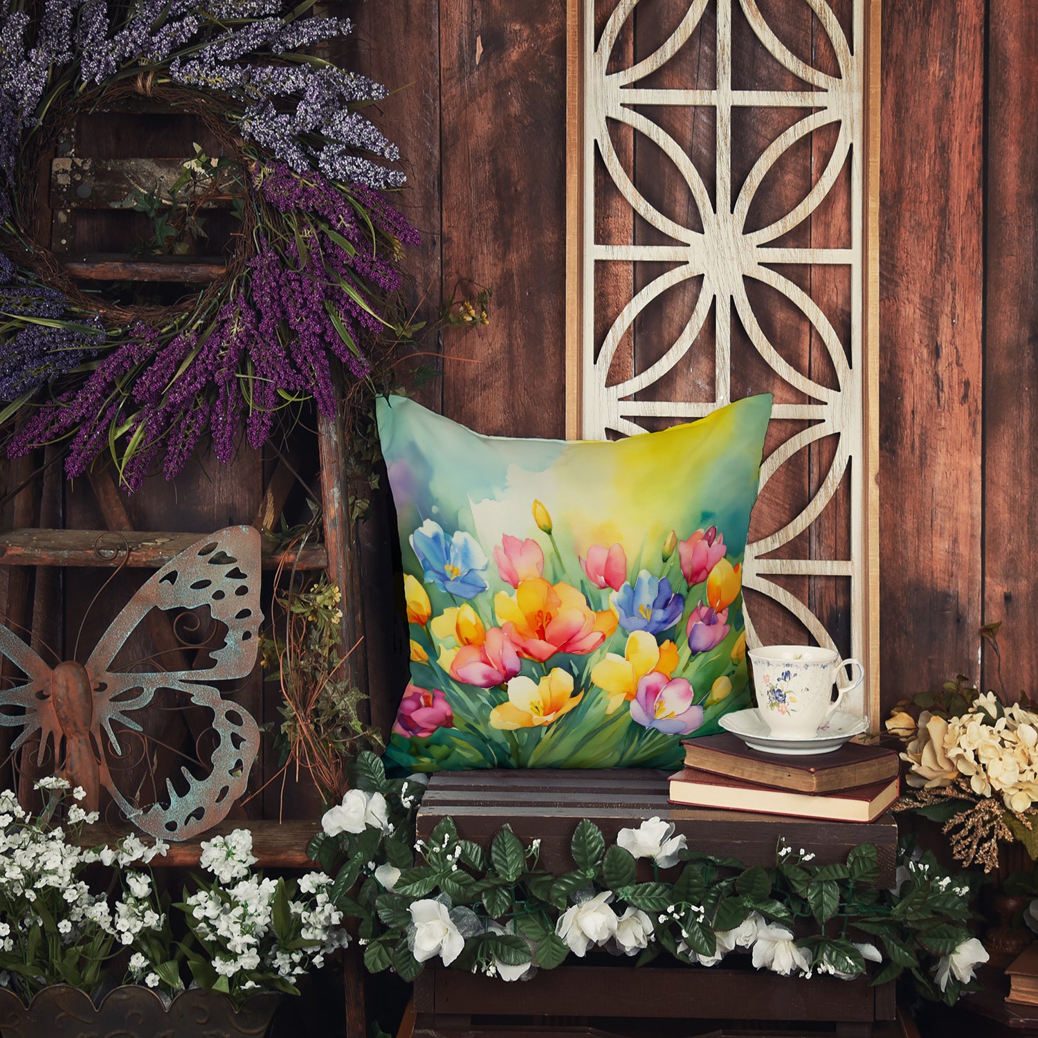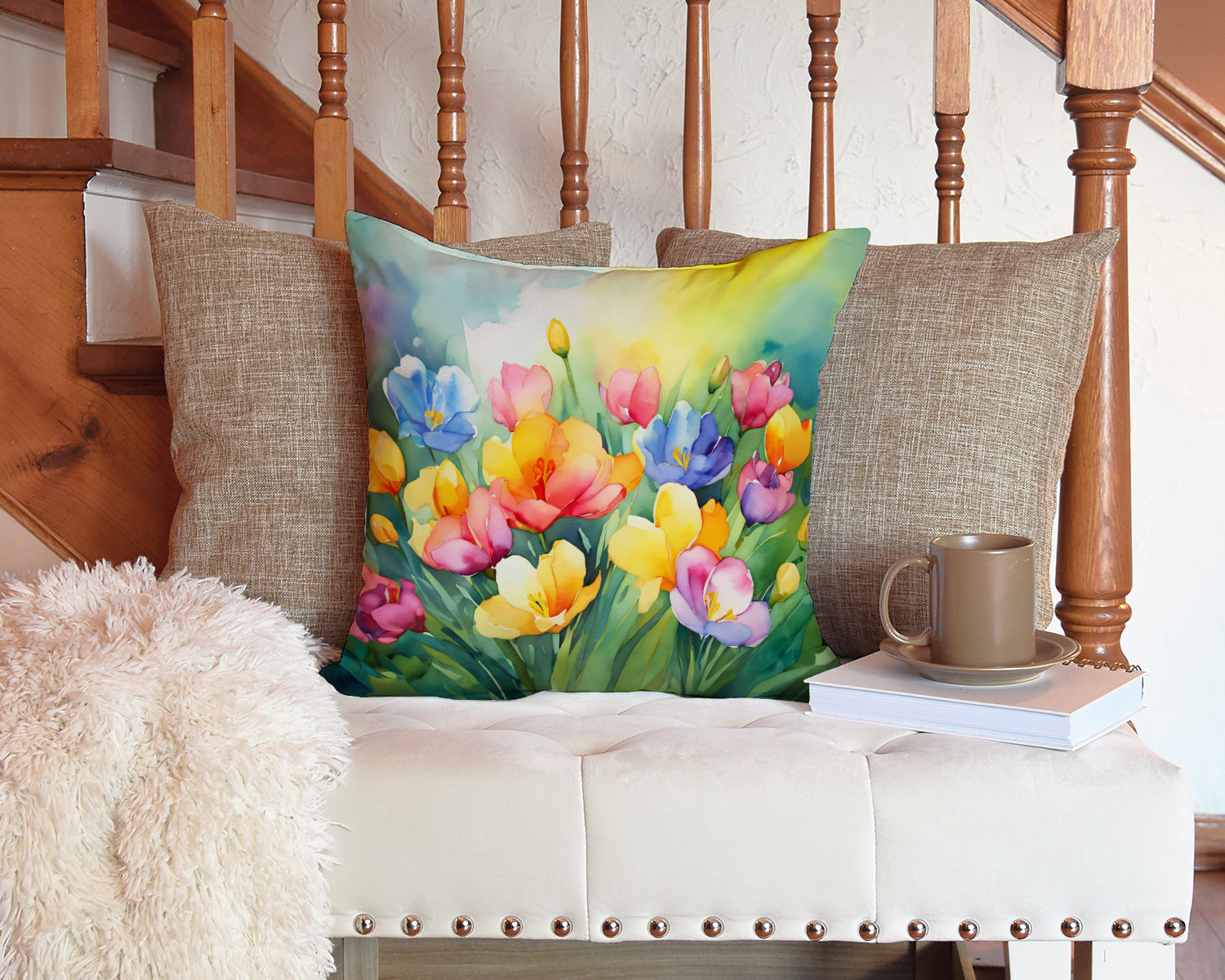Throw Pillow featuring breed specific Freesias artwork. Add a touch of vibrancy and comfort to your outdoor seating with Caroline's Treasures Fabric Decorative Pillow. Measuring approximately 14 inches by 14 inches, this outdoor pillow is crafted to elevate the appeal of your patio furniture, infusing it with vivid color and artistic flair. The pillow includes a 100% Polyester Fabric sham filled with a quality pillow form to provide superior comfort. Innovatively made from our brand new material, specifically woven for its water resistance, this pillow is designed for durability. The soft canvas fabric offers versatility in use, fit for your indoor couch or your outdoor patio, porch, or veranda. The fabric is dyed with colorfast dyes built for resilience against weather conditions, ensuring the pillow retains its beauty over time. Constructed by sewing three fabric pieces to create a sham, the polyester insert is then nestled inside to form the pillow, resulting in an overstuffed pillow that maintains its shape. Both the sham and the pillow insert are proudly made in the United States. As the pillows are handcrafted, there may be minor variations in size, further enhancing their unique charm. Experience comfort in style with Caroline's Treasures Fabric Decorative Pillow.