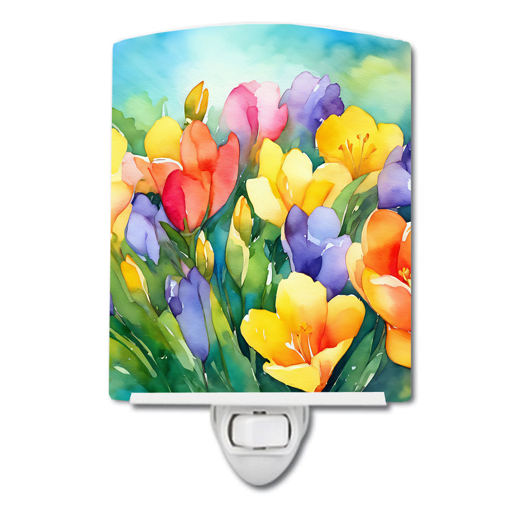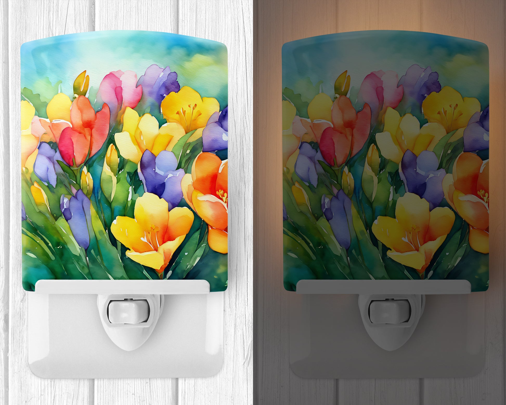 Ceramic Night Light featuring breed specific Freesias artwork. Introduce a splash of artistic flair and subtle illumination to your space with the Decorative Ceramic Night Light from Caroline's Treasures. Perfect for any room, this night light seamlessly blends functionality with an aesthetic appeal, offering a stylish solution to brighten up dark corners of your home or office. Boasting a six-inch high by four-inch wide ceramic tile at the front, it showcases vivid, full-color artwork from distinguished artists, transforming a simple utility into a vibrant art piece. The artwork is securely encased in a robust metal holder, ensuring durability and longevity. Two screws are provided to firmly affix the tile into the holder. The holder extends three inches deep, housing an included bulb that emits a soft, welcoming glow. This product meets all safety standards, as evidenced by its UL approval. Proudly made in the United States from imported components, this Decorative Ceramic Night Light is not just a functional device; it's a statement piece that enhances the ambiance of your surroundings.