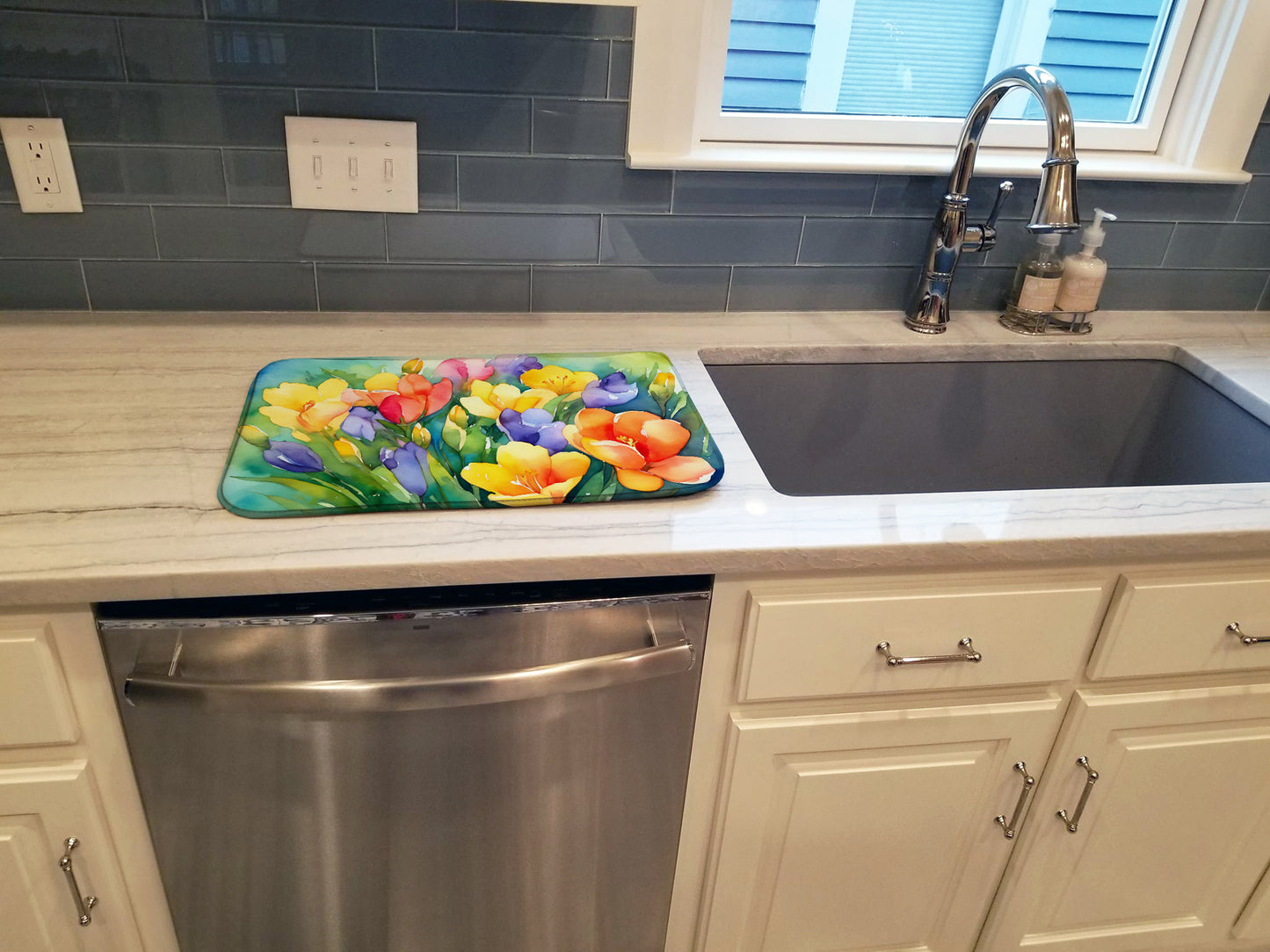 Dish Drying Mat featuring breed specific Freesias artwork. Say goodbye to messy countertops and soggy dish towels with our innovative dish drying mat. Our high-quality dish drying pad is designed to keep your countertops dry while offering a stylish and efficient solution. Whether you're air drying dishes, glasses, stemware, silverware, pots, pans, bottles, or even fruits and vegetables, our dish mat is the perfect choice. The 14 inches x 22 inches size fits most counters and dish drying racks, and the non-slip design ensures stability. Made with water-absorbent polyester and a polyurethane foam insert, our dish drying mat is not only functional but also durable. It's machine washable and printed in the USA for long-lasting use. The beautiful artwork adds flair to your kitchen decor, making it a perfect housewarming gift or present for any occasion. Upgrade your kitchen experience with our absorbent and versatile dish drying mat.