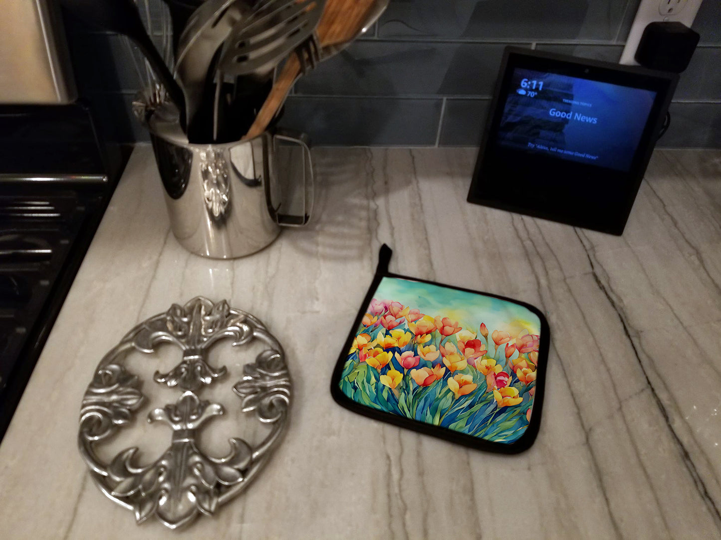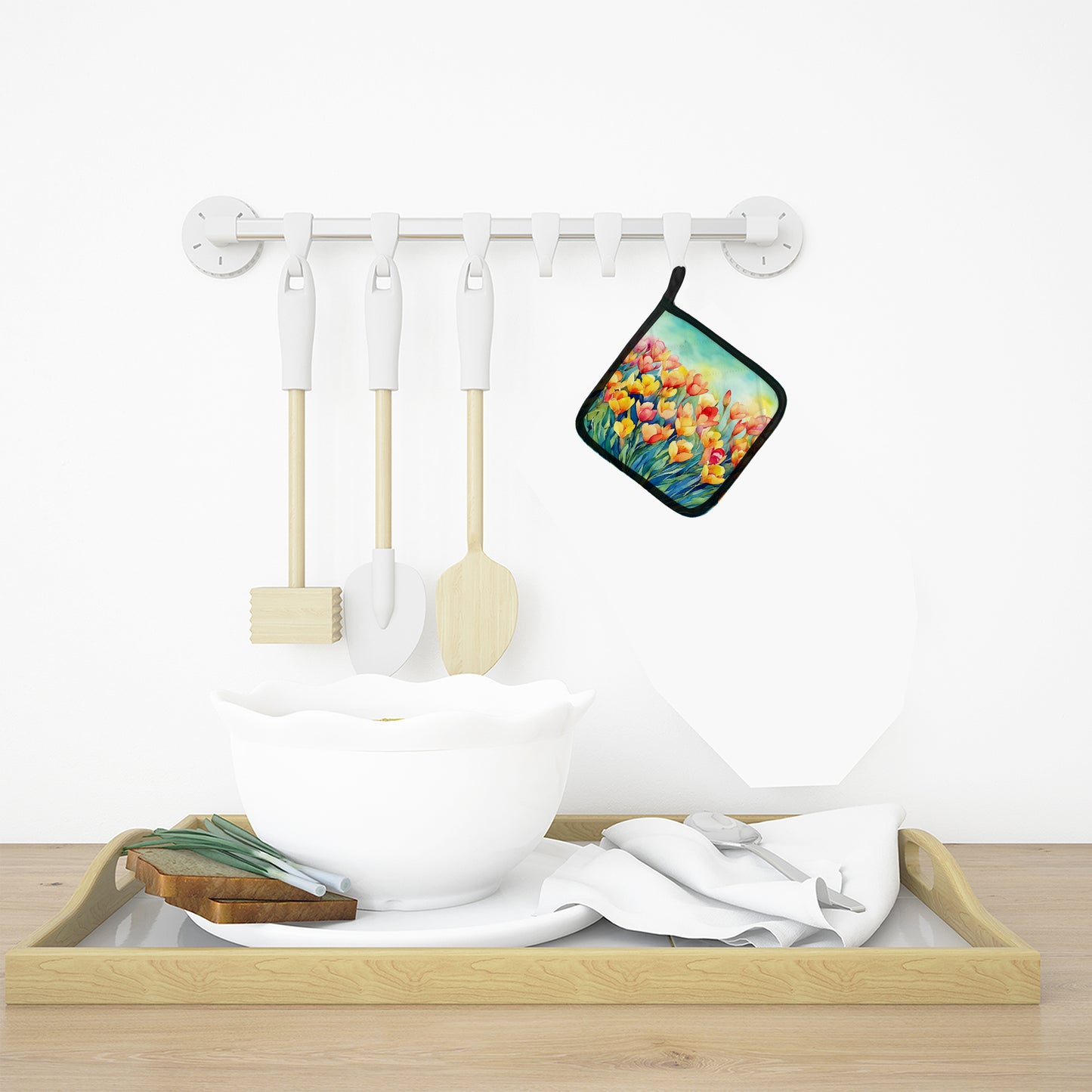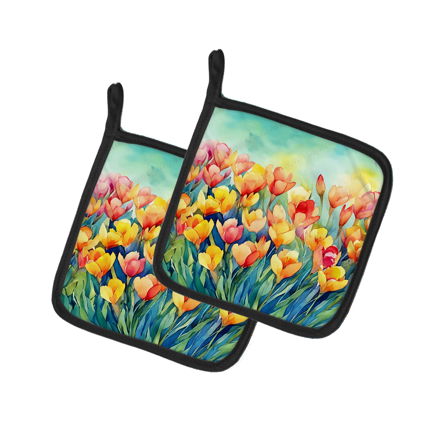 Pair of Pot Holders featuring breed specific Freesias artwork. A Pair of Pot Holders to match your kitchen decor. Made in the USA these are thick and functional. Full color artwork decorates the front polyester fabric of the hot pad and accented by a black trim. Use these at as a trivet for your Thanksgiving or Christmas tablescape. Filled with insulated fabric and quilted for durability. These colorful pot holders will make a great gift for your favorite home cook or executive chef. Each pot holder measures approximately 7 1/2 inches by 7 1/2 inches. A hanging tab is included.