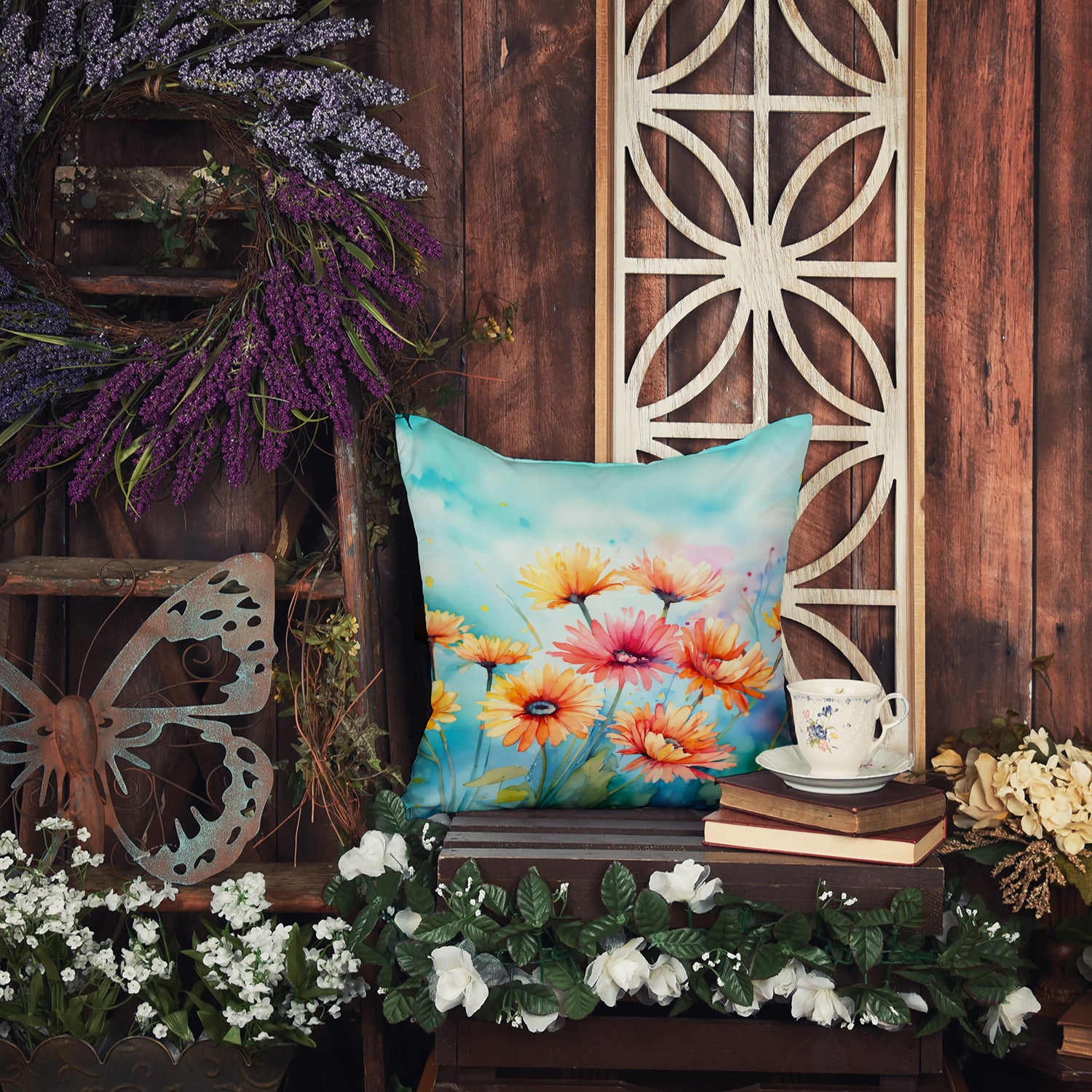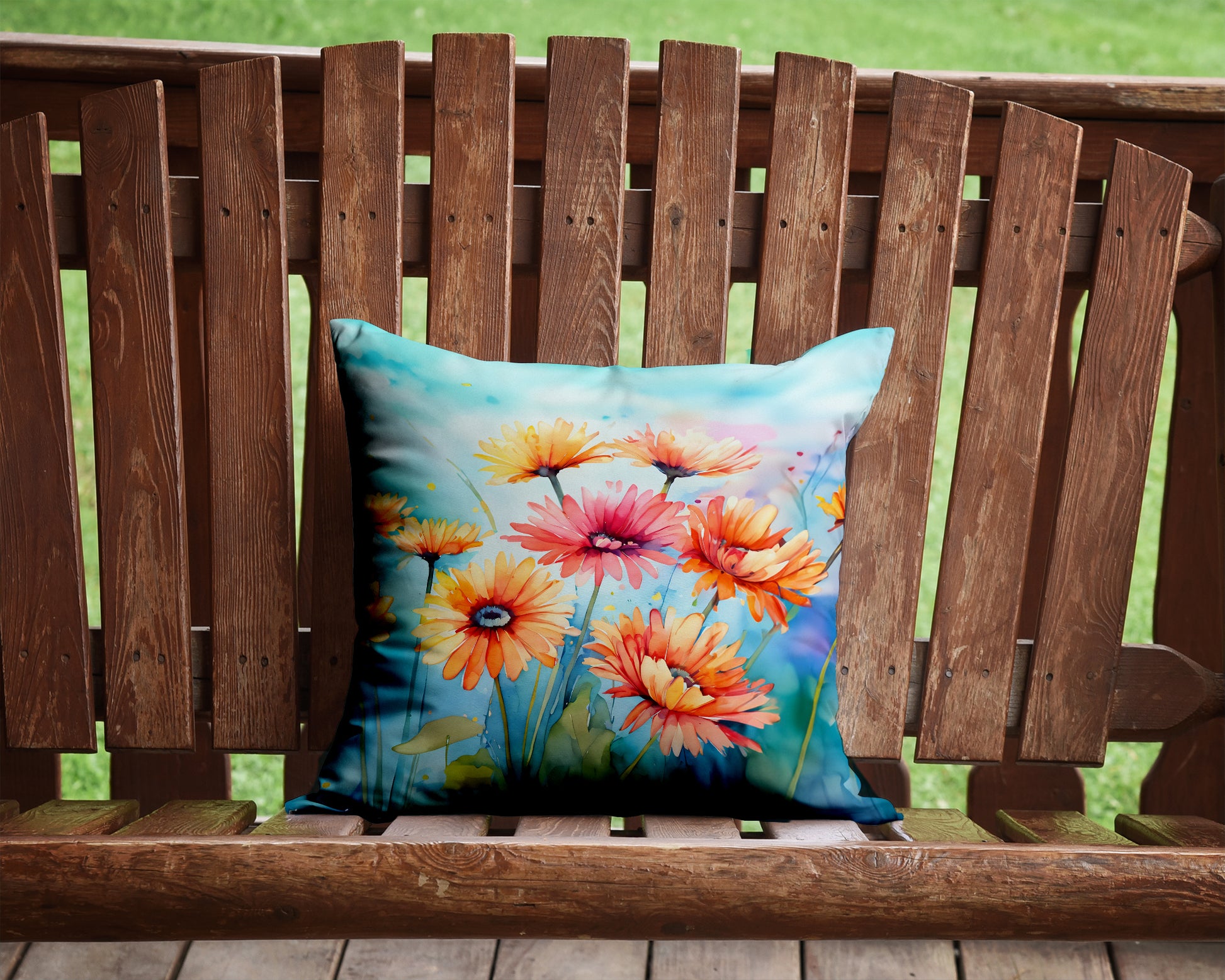 Throw Pillow featuring breed specific Gerbera Daisies artwork. Add a touch of vibrancy and comfort to your outdoor seating with Caroline's Treasures Fabric Decorative Pillow. Measuring approximately 14 inches by 14 inches, this outdoor pillow is crafted to elevate the appeal of your patio furniture, infusing it with vivid color and artistic flair. The pillow includes a 100% Polyester Fabric sham filled with a quality pillow form to provide superior comfort. Innovatively made from our brand new material, specifically woven for its water resistance, this pillow is designed for durability. The soft canvas fabric offers versatility in use, fit for your indoor couch or your outdoor patio, porch, or veranda. The fabric is dyed with colorfast dyes built for resilience against weather conditions, ensuring the pillow retains its beauty over time. Constructed by sewing three fabric pieces to create a sham, the polyester insert is then nestled inside to form the pillow, resulting in an overstuffed pillow that maintains its shape. Both the sham and the pillow insert are proudly made in the United States. As the pillows are handcrafted, there may be minor variations in size, further enhancing their unique charm. Experience comfort in style with Caroline's Treasures Fabric Decorative Pillow.