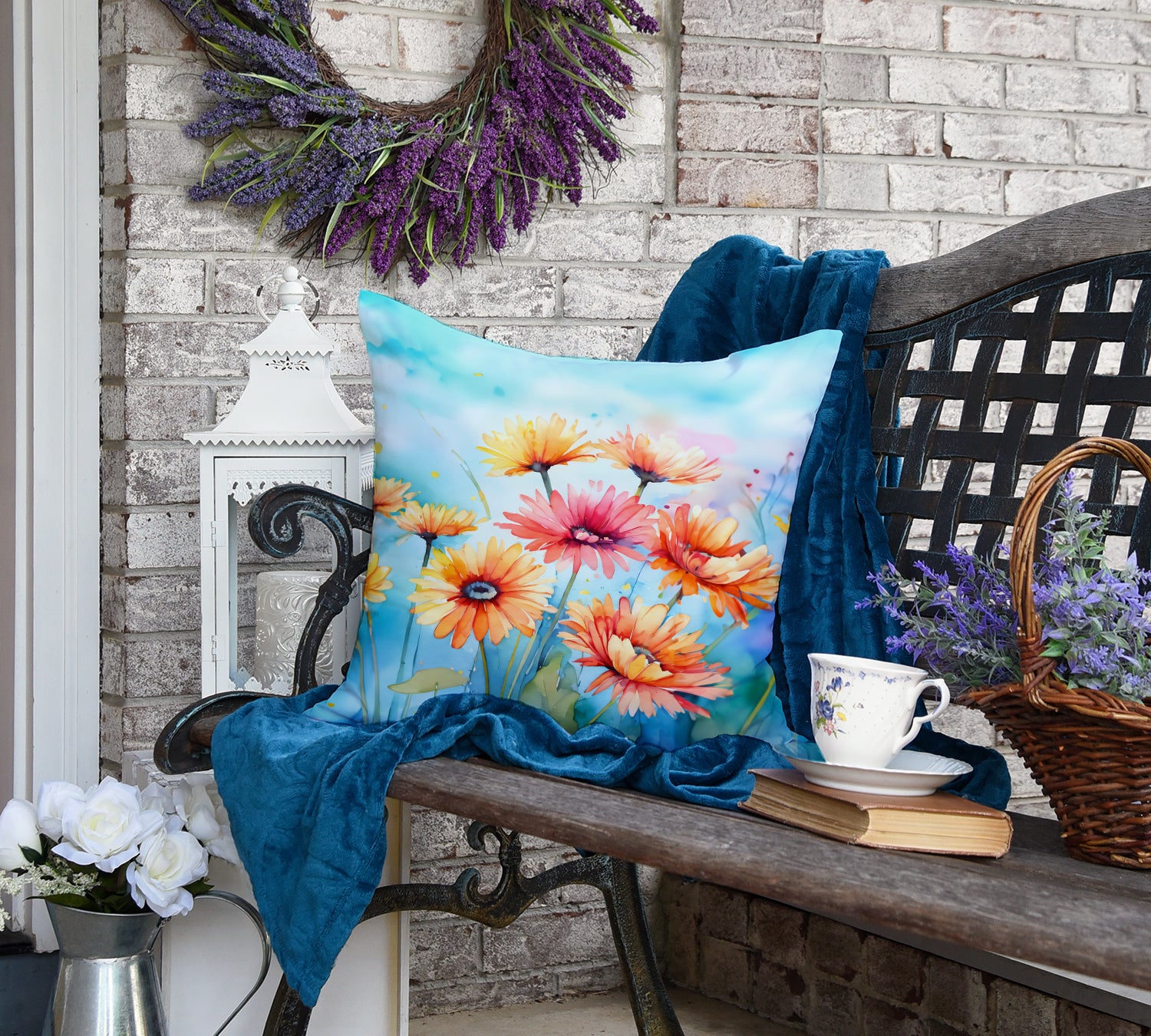 Throw Pillow featuring breed specific Gerbera Daisies artwork. Revitalize your outdoor or indoor living space with Caroline's Treasures 18x18 Fabric Decorative Pillow. With a generously sized dimension of approximately 18 inches by 18 inches, this pillow makes a comfortable and aesthetic addition to any seating area. Made from a unique, water-resistant material developed by Caroline's Treasures, the pillow sham is 100% polyester fabric that's durable and ready to weather any condition. Its vibrant, full-color artwork will not fade over time as it is dyed with color-fast dyes. Whether you place it on your patio furniture, porch, veranda, or indoor couch, its soft canvas fabric ensures a cozy experience. The pillow is handcrafted in the United States, featuring a sham created from three pieces of fabric and a polyester insert for enduring shape and overstuffed comfort. Despite being robustly built to endure the outdoors, it is as soft and snug as your favorite indoor cushions. Please note, as all our pillows are handmade, sizes may vary slightly, adding to the charm of this unique decorative item.