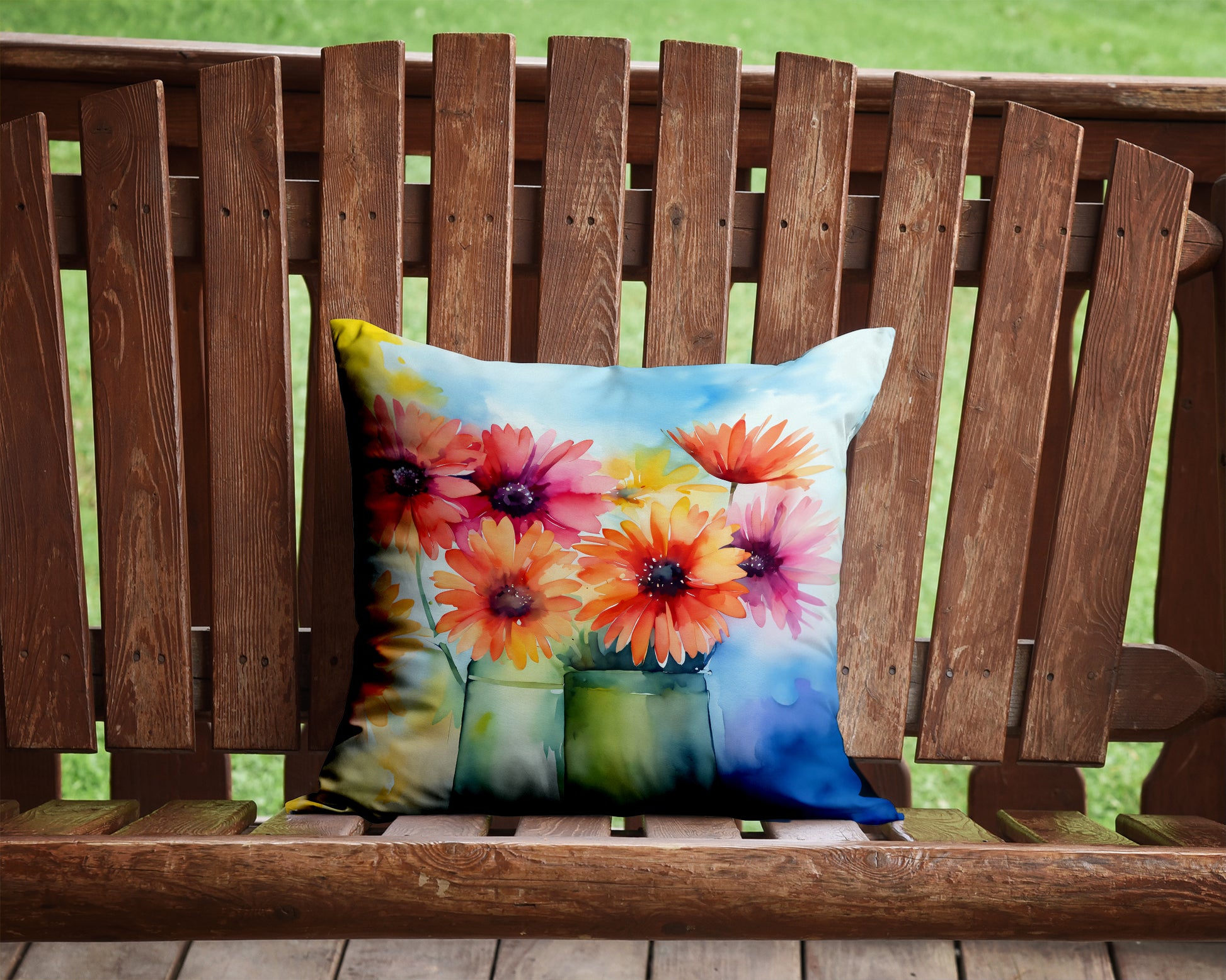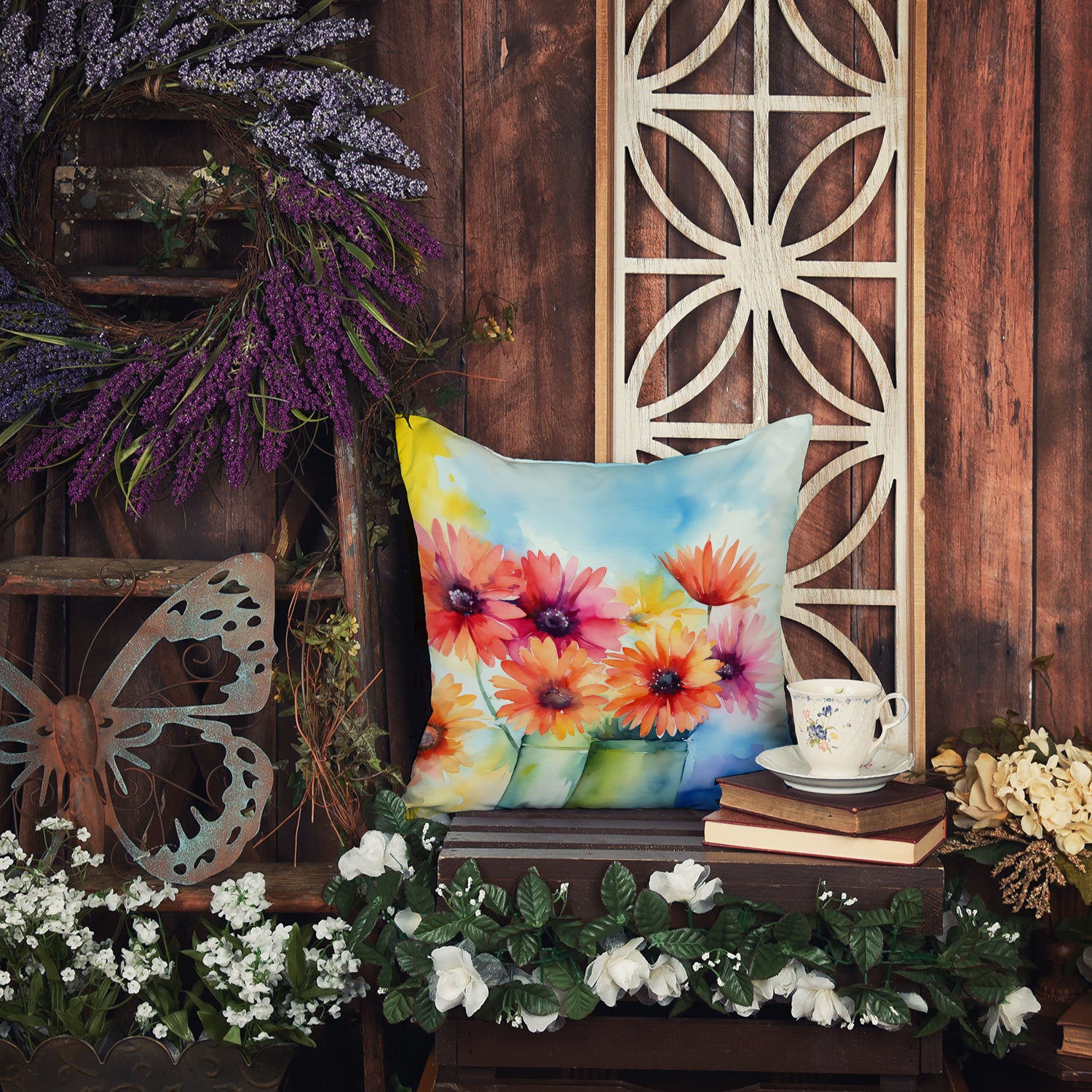 Throw Pillow featuring breed specific Gerbera Daisies artwork. Add a touch of vibrancy and comfort to your outdoor seating with Caroline's Treasures Fabric Decorative Pillow. Measuring approximately 14 inches by 14 inches, this outdoor pillow is crafted to elevate the appeal of your patio furniture, infusing it with vivid color and artistic flair. The pillow includes a 100% Polyester Fabric sham filled with a quality pillow form to provide superior comfort. Innovatively made from our brand new material, specifically woven for its water resistance, this pillow is designed for durability. The soft canvas fabric offers versatility in use, fit for your indoor couch or your outdoor patio, porch, or veranda. The fabric is dyed with colorfast dyes built for resilience against weather conditions, ensuring the pillow retains its beauty over time. Constructed by sewing three fabric pieces to create a sham, the polyester insert is then nestled inside to form the pillow, resulting in an overstuffed pillow that maintains its shape. Both the sham and the pillow insert are proudly made in the United States. As the pillows are handcrafted, there may be minor variations in size, further enhancing their unique charm. Experience comfort in style with Caroline's Treasures Fabric Decorative Pillow.
