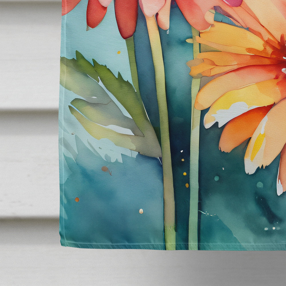 House Flag featuring breed specific Gerbera Daisies artwork. Presenting our Heavy Duty Polyester House Size Decorative Sleeve Pole Flag, a vibrant addition to enhance the aesthetic appeal of your home. This large decorative flag, measuring approximately 28 x 40 inches, offers ample coverage and visibility. Each flag is meticulously sewn and made individually, ensuring a unique piece that may slightly vary in size. It's a sleeve pole flag, designed to fit a standard decorative flag pole effortlessly. Please note that the flag pole and bracket are not included and should be purchased separately. What sets our flag apart is its dual-sided print. The design is mirrored on both sides of the fabric, allowing for uniform visibility regardless of the angle. Printed in full color, our flag showcases vibrant hues that truly stand out. To ensure lasting vibrancy and durability, the dyes are heat-set into the fabric. This ensures your flag remains bright and captivating through various weather conditions. Elevate the look of your home with our Heavy Duty Polyester House Size Decorative Sleeve Pole Flag!
