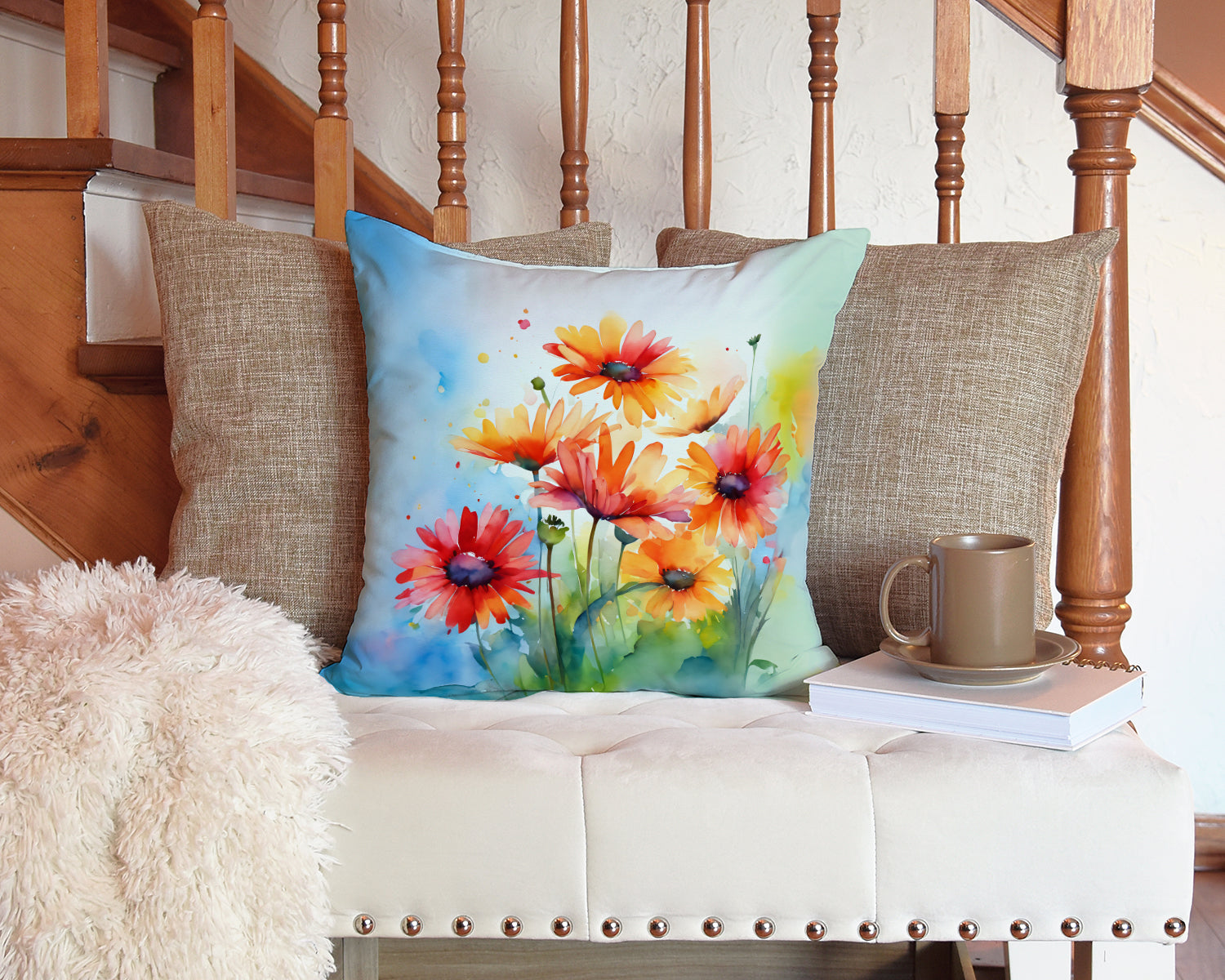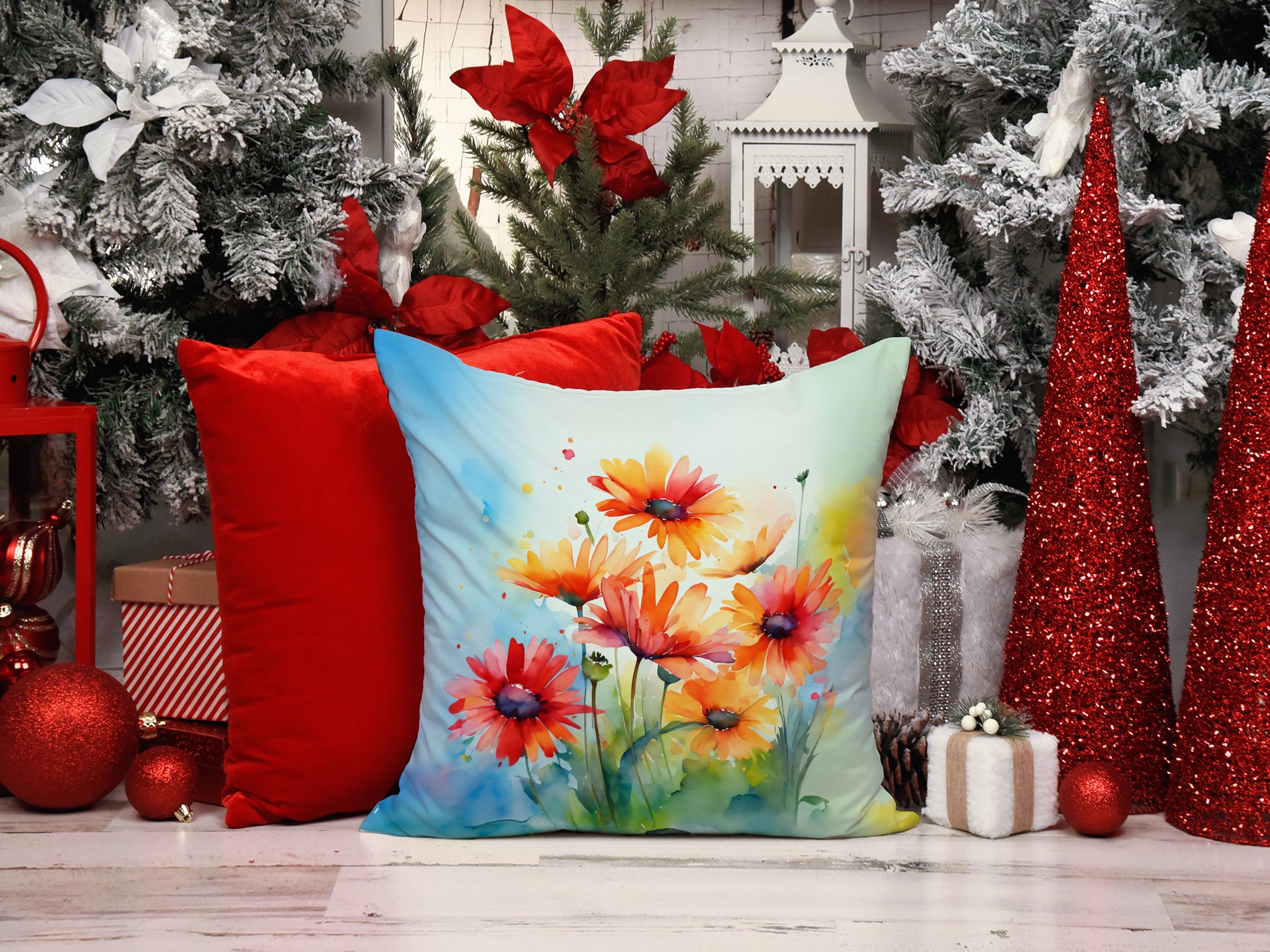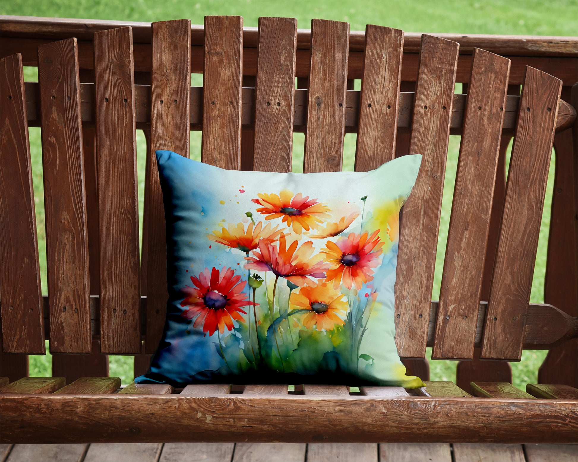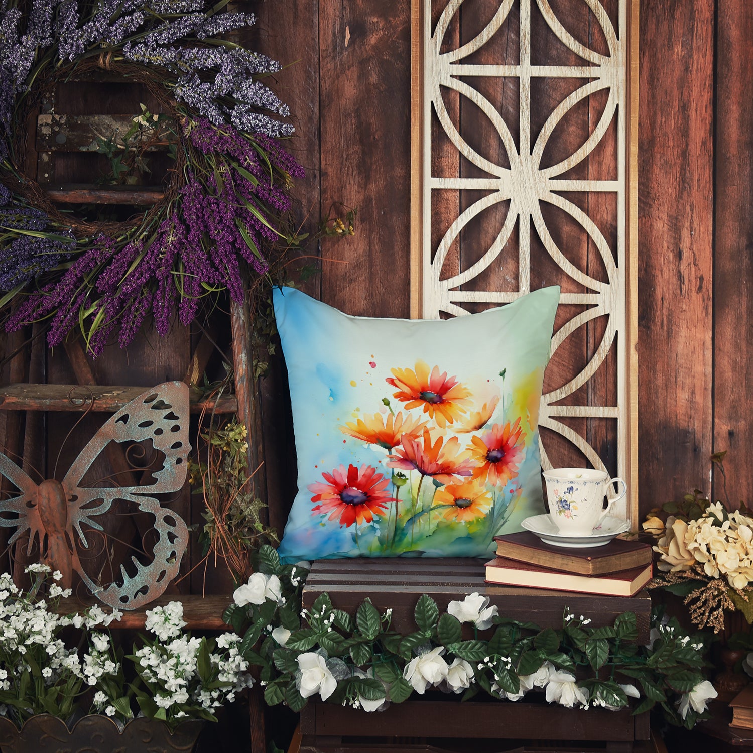 Throw Pillow featuring breed specific Gerbera Daisies artwork. Add a touch of vibrancy and comfort to your outdoor seating with Caroline's Treasures Fabric Decorative Pillow. Measuring approximately 14 inches by 14 inches, this outdoor pillow is crafted to elevate the appeal of your patio furniture, infusing it with vivid color and artistic flair. The pillow includes a 100% Polyester Fabric sham filled with a quality pillow form to provide superior comfort. Innovatively made from our brand new material, specifically woven for its water resistance, this pillow is designed for durability. The soft canvas fabric offers versatility in use, fit for your indoor couch or your outdoor patio, porch, or veranda. The fabric is dyed with colorfast dyes built for resilience against weather conditions, ensuring the pillow retains its beauty over time. Constructed by sewing three fabric pieces to create a sham, the polyester insert is then nestled inside to form the pillow, resulting in an overstuffed pillow that maintains its shape. Both the sham and the pillow insert are proudly made in the United States. As the pillows are handcrafted, there may be minor variations in size, further enhancing their unique charm. Experience comfort in style with Caroline's Treasures Fabric Decorative Pillow.