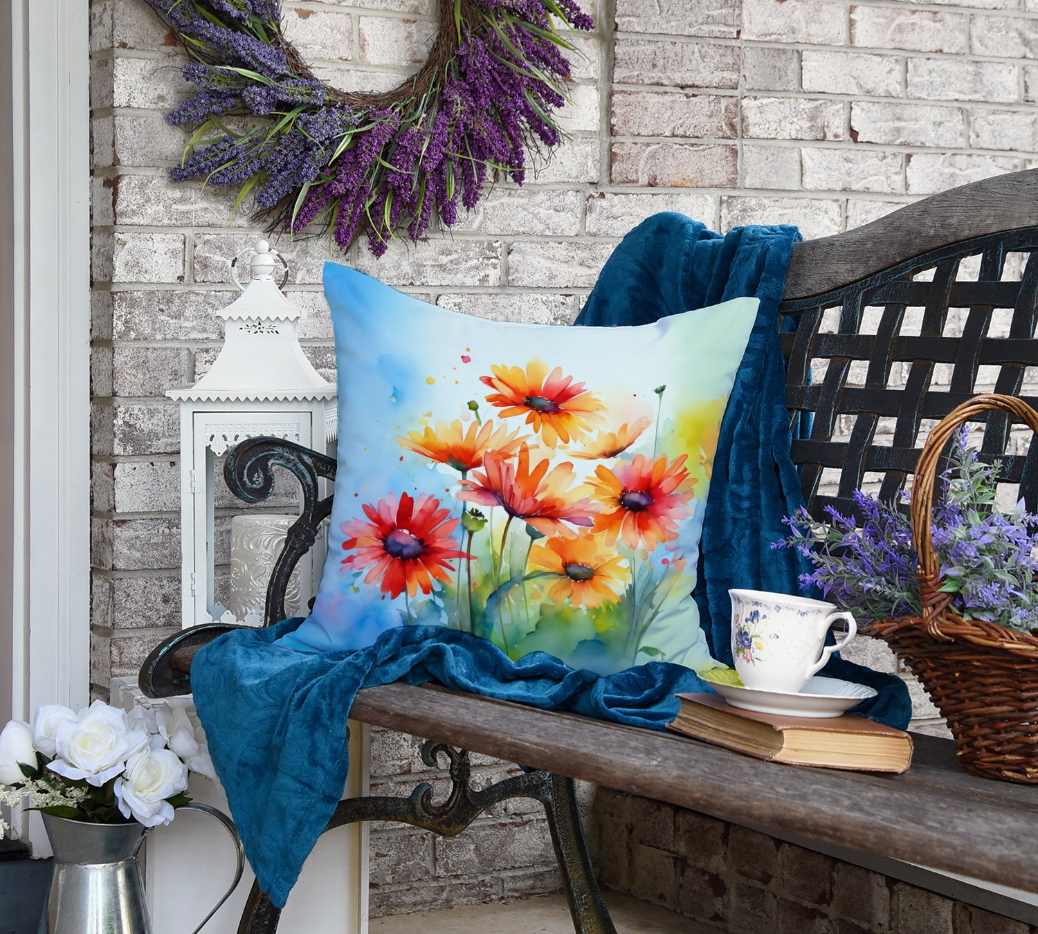 Throw Pillow featuring breed specific Gerbera Daisies artwork. Revitalize your outdoor or indoor living space with Caroline's Treasures 18x18 Fabric Decorative Pillow. With a generously sized dimension of approximately 18 inches by 18 inches, this pillow makes a comfortable and aesthetic addition to any seating area. Made from a unique, water-resistant material developed by Caroline's Treasures, the pillow sham is 100% polyester fabric that's durable and ready to weather any condition. Its vibrant, full-color artwork will not fade over time as it is dyed with color-fast dyes. Whether you place it on your patio furniture, porch, veranda, or indoor couch, its soft canvas fabric ensures a cozy experience. The pillow is handcrafted in the United States, featuring a sham created from three pieces of fabric and a polyester insert for enduring shape and overstuffed comfort. Despite being robustly built to endure the outdoors, it is as soft and snug as your favorite indoor cushions. Please note, as all our pillows are handmade, sizes may vary slightly, adding to the charm of this unique decorative item.