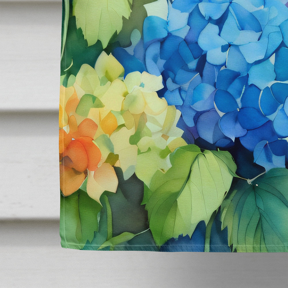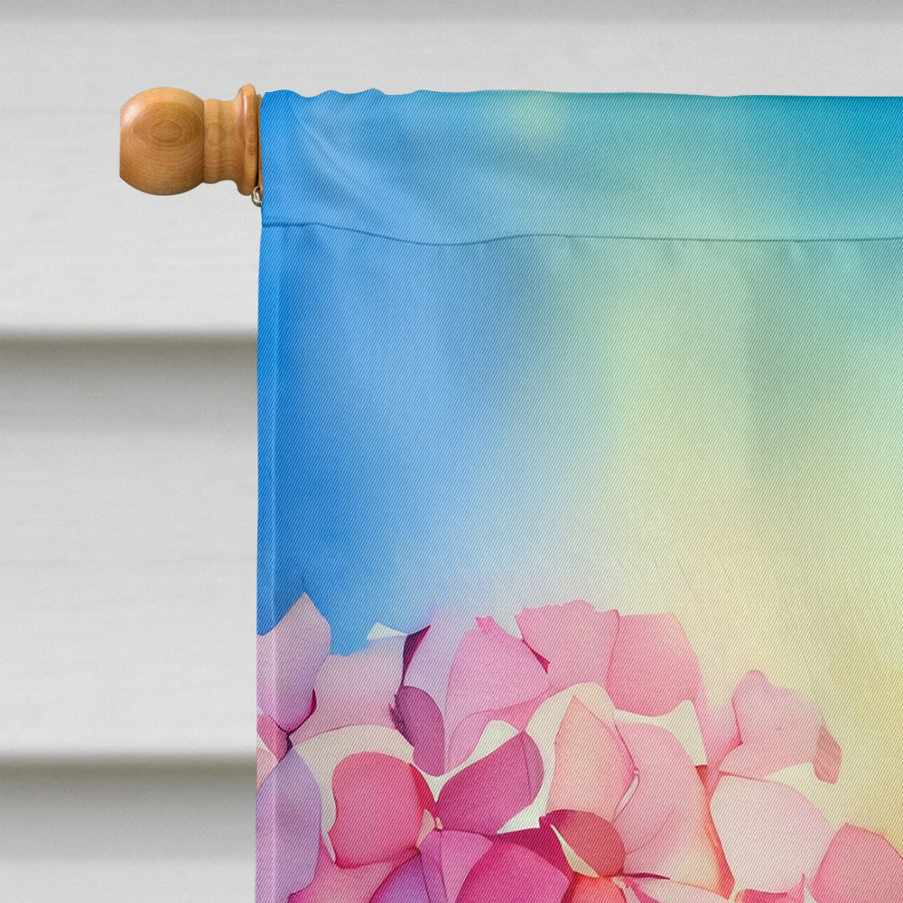 House Flag featuring breed specific Hydrangeas artwork. Presenting our Heavy Duty Polyester House Size Decorative Sleeve Pole Flag, a vibrant addition to enhance the aesthetic appeal of your home. This large decorative flag, measuring approximately 28 x 40 inches, offers ample coverage and visibility. Each flag is meticulously sewn and made individually, ensuring a unique piece that may slightly vary in size. It's a sleeve pole flag, designed to fit a standard decorative flag pole effortlessly. Please note that the flag pole and bracket are not included and should be purchased separately. What sets our flag apart is its dual-sided print. The design is mirrored on both sides of the fabric, allowing for uniform visibility regardless of the angle. Printed in full color, our flag showcases vibrant hues that truly stand out. To ensure lasting vibrancy and durability, the dyes are heat-set into the fabric. This ensures your flag remains bright and captivating through various weather conditions. Elevate the look of your home with our Heavy Duty Polyester House Size Decorative Sleeve Pole Flag!