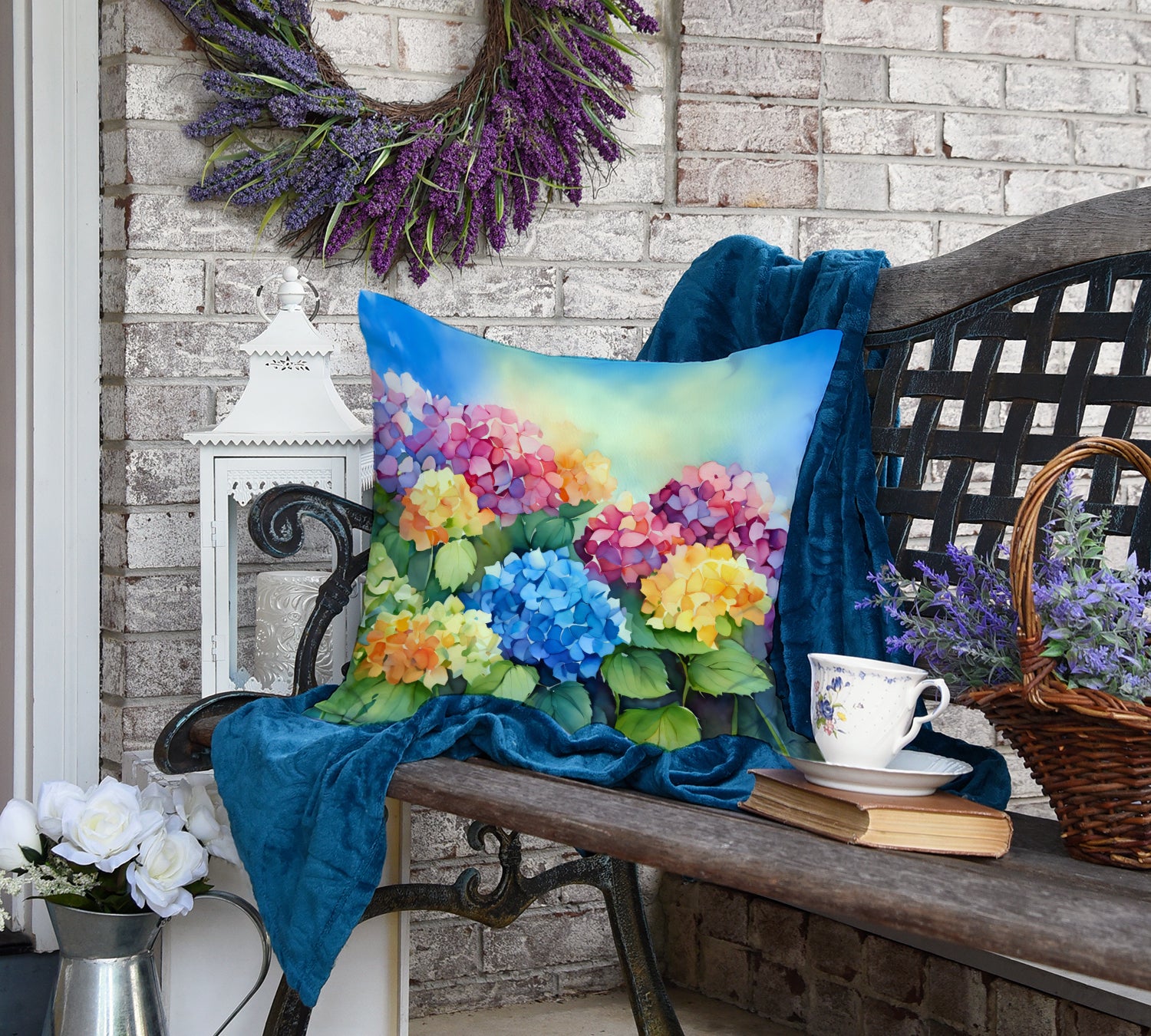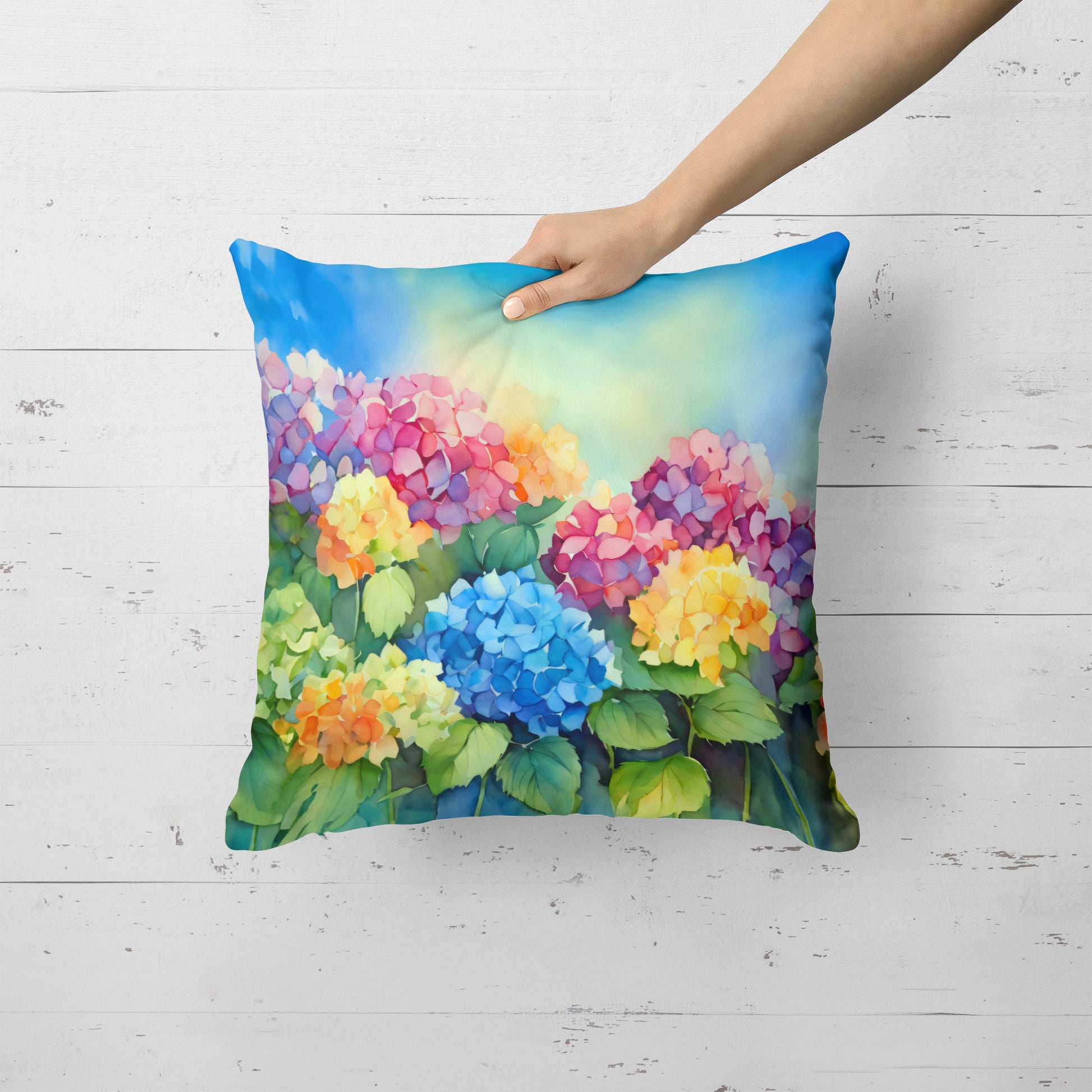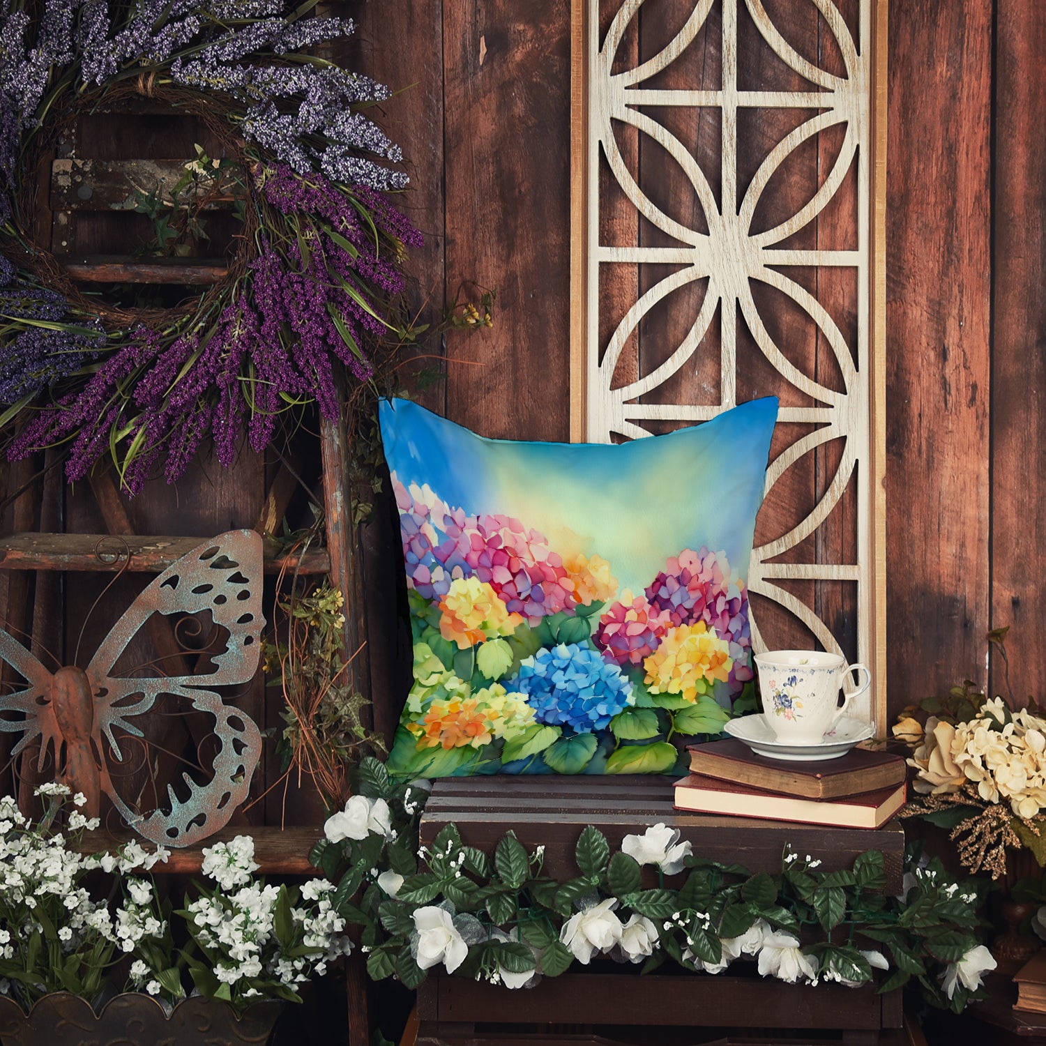 Throw Pillow featuring breed specific Hydrangeas artwork. Revitalize your outdoor or indoor living space with Caroline's Treasures 18x18 Fabric Decorative Pillow. With a generously sized dimension of approximately 18 inches by 18 inches, this pillow makes a comfortable and aesthetic addition to any seating area. Made from a unique, water-resistant material developed by Caroline's Treasures, the pillow sham is 100% polyester fabric that's durable and ready to weather any condition. Its vibrant, full-color artwork will not fade over time as it is dyed with color-fast dyes. Whether you place it on your patio furniture, porch, veranda, or indoor couch, its soft canvas fabric ensures a cozy experience. The pillow is handcrafted in the United States, featuring a sham created from three pieces of fabric and a polyester insert for enduring shape and overstuffed comfort. Despite being robustly built to endure the outdoors, it is as soft and snug as your favorite indoor cushions. Please note, as all our pillows are handmade, sizes may vary slightly, adding to the charm of this unique decorative item.