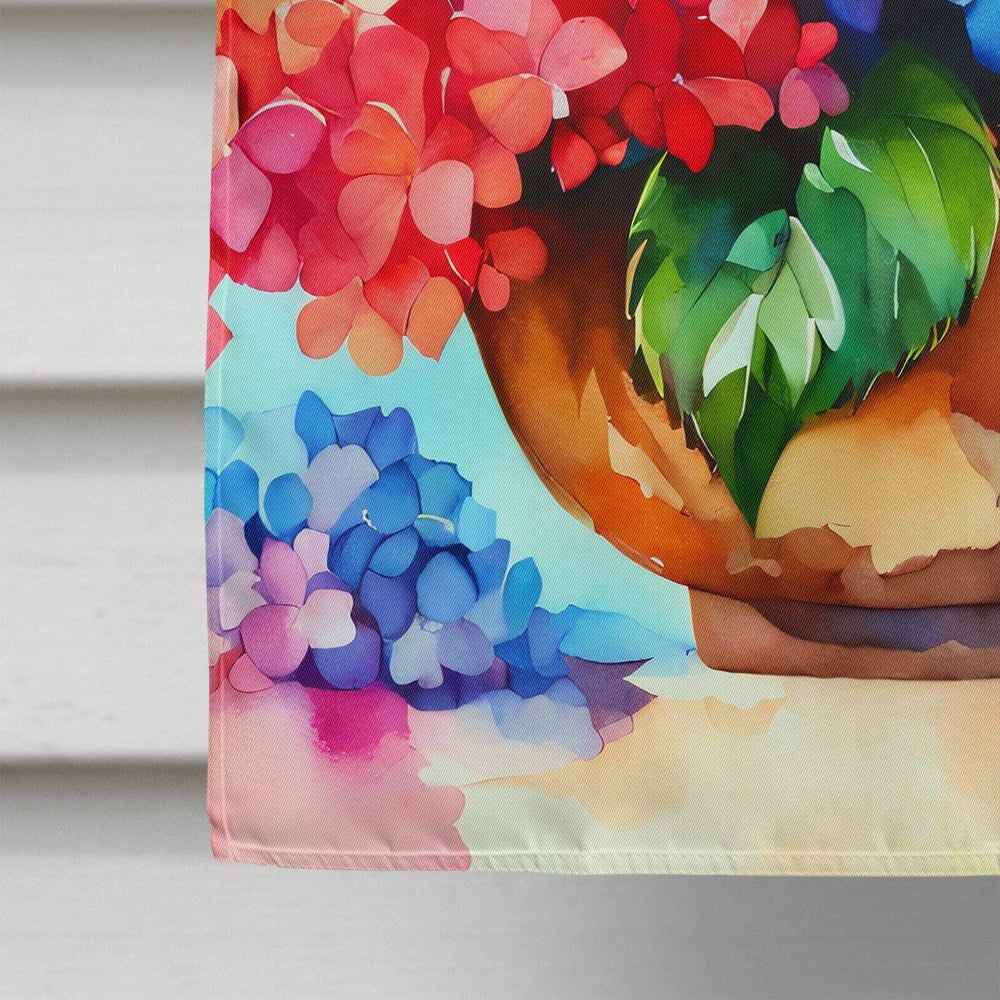 House Flag featuring breed specific Hydrangeas artwork. Presenting our Heavy Duty Polyester House Size Decorative Sleeve Pole Flag, a vibrant addition to enhance the aesthetic appeal of your home. This large decorative flag, measuring approximately 28 x 40 inches, offers ample coverage and visibility. Each flag is meticulously sewn and made individually, ensuring a unique piece that may slightly vary in size. It's a sleeve pole flag, designed to fit a standard decorative flag pole effortlessly. Please note that the flag pole and bracket are not included and should be purchased separately. What sets our flag apart is its dual-sided print. The design is mirrored on both sides of the fabric, allowing for uniform visibility regardless of the angle. Printed in full color, our flag showcases vibrant hues that truly stand out. To ensure lasting vibrancy and durability, the dyes are heat-set into the fabric. This ensures your flag remains bright and captivating through various weather conditions. Elevate the look of your home with our Heavy Duty Polyester House Size Decorative Sleeve Pole Flag!