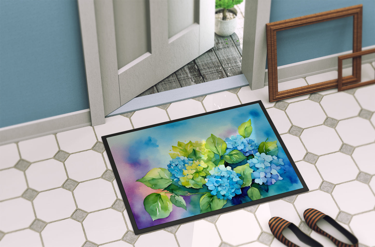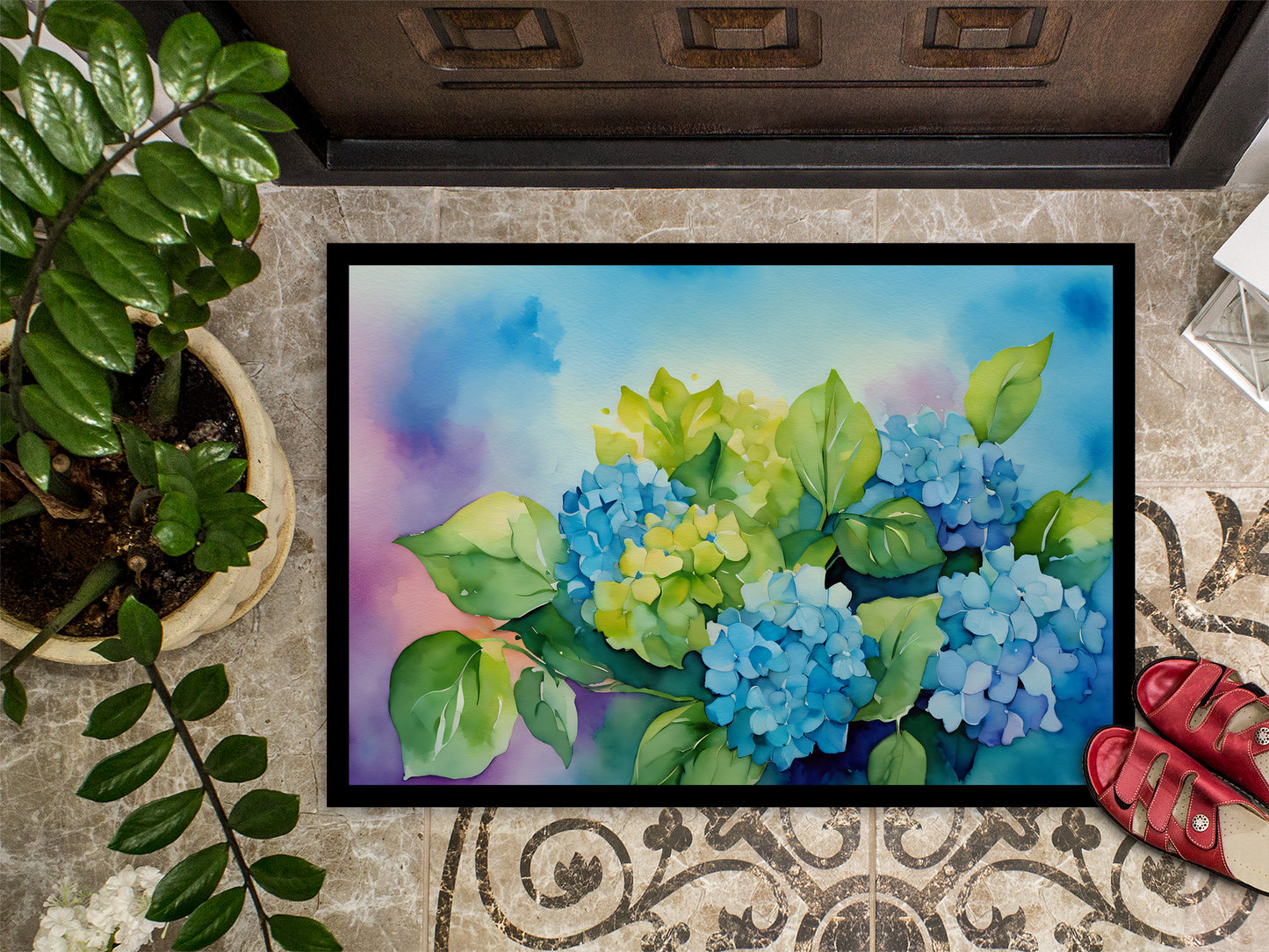 Doormat featuring breed specific Hydrangeas artwork. Welcome your guests in style with our Artwork Door Mat, designed to withstand almost any weather condition. This mat, measuring approximately 18 by 27 inches, is held together by durable black binding tape. Its top layer, composed of polyester felt, is dyed with the eye-catching image you see on the mat. A few layers below provide the mat with stability, while its rubber bottom is stamped to help prevent slipping and ensures safety. Our mat works wonderfully as both an indoor or outdoor door mat. For cleaning, simply hose it off with water or use a power washer - no need for any cleaner that produces suds. Avoid scrubbing with a brush, instead, opt for the vacuum on floor setting. Designed manufactured and printed in the USA, this mat is a perfect addition to your porch, outdoor kitchen, entryway, or any indoor space. Its unique design makes it a charming decorative rug that greets your guests and adds a stylish touch to your home decor.