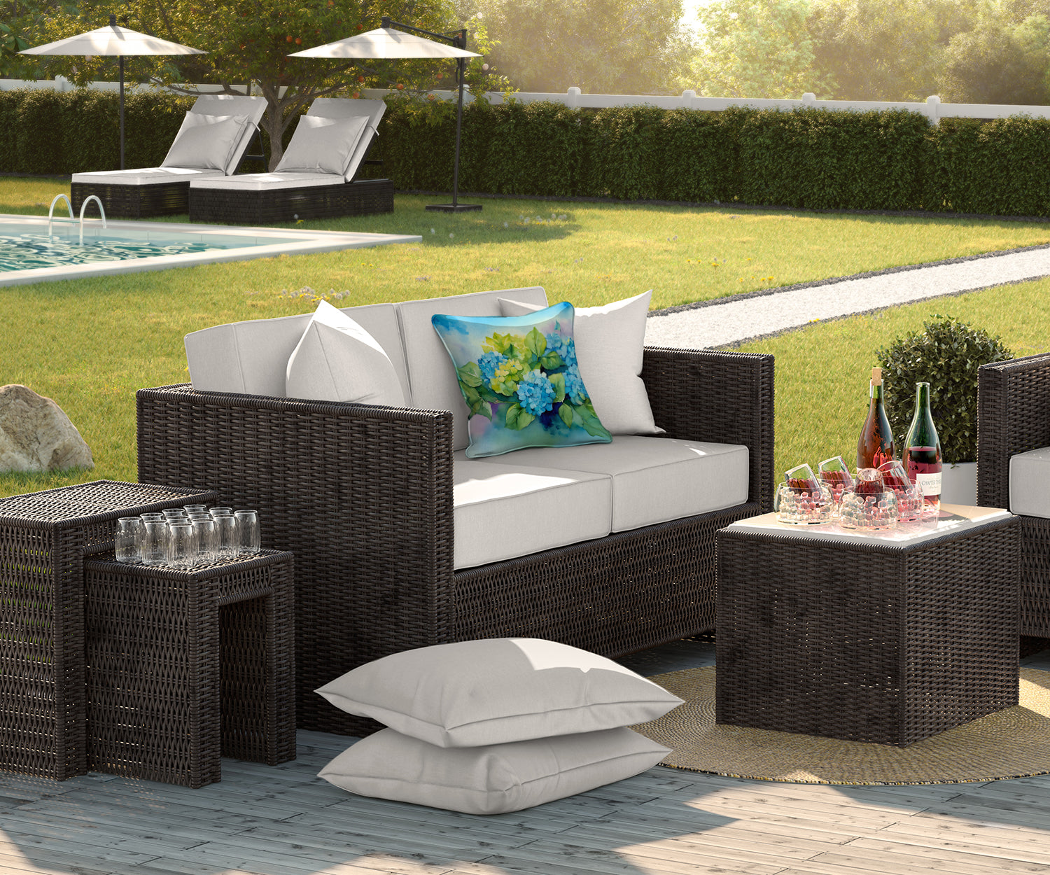 Throw Pillow featuring breed specific Hydrangeas artwork. Revitalize your outdoor or indoor living space with Caroline's Treasures 18x18 Fabric Decorative Pillow. With a generously sized dimension of approximately 18 inches by 18 inches, this pillow makes a comfortable and aesthetic addition to any seating area. Made from a unique, water-resistant material developed by Caroline's Treasures, the pillow sham is 100% polyester fabric that's durable and ready to weather any condition. Its vibrant, full-color artwork will not fade over time as it is dyed with color-fast dyes. Whether you place it on your patio furniture, porch, veranda, or indoor couch, its soft canvas fabric ensures a cozy experience. The pillow is handcrafted in the United States, featuring a sham created from three pieces of fabric and a polyester insert for enduring shape and overstuffed comfort. Despite being robustly built to endure the outdoors, it is as soft and snug as your favorite indoor cushions. Please note, as all our pillows are handmade, sizes may vary slightly, adding to the charm of this unique decorative item.