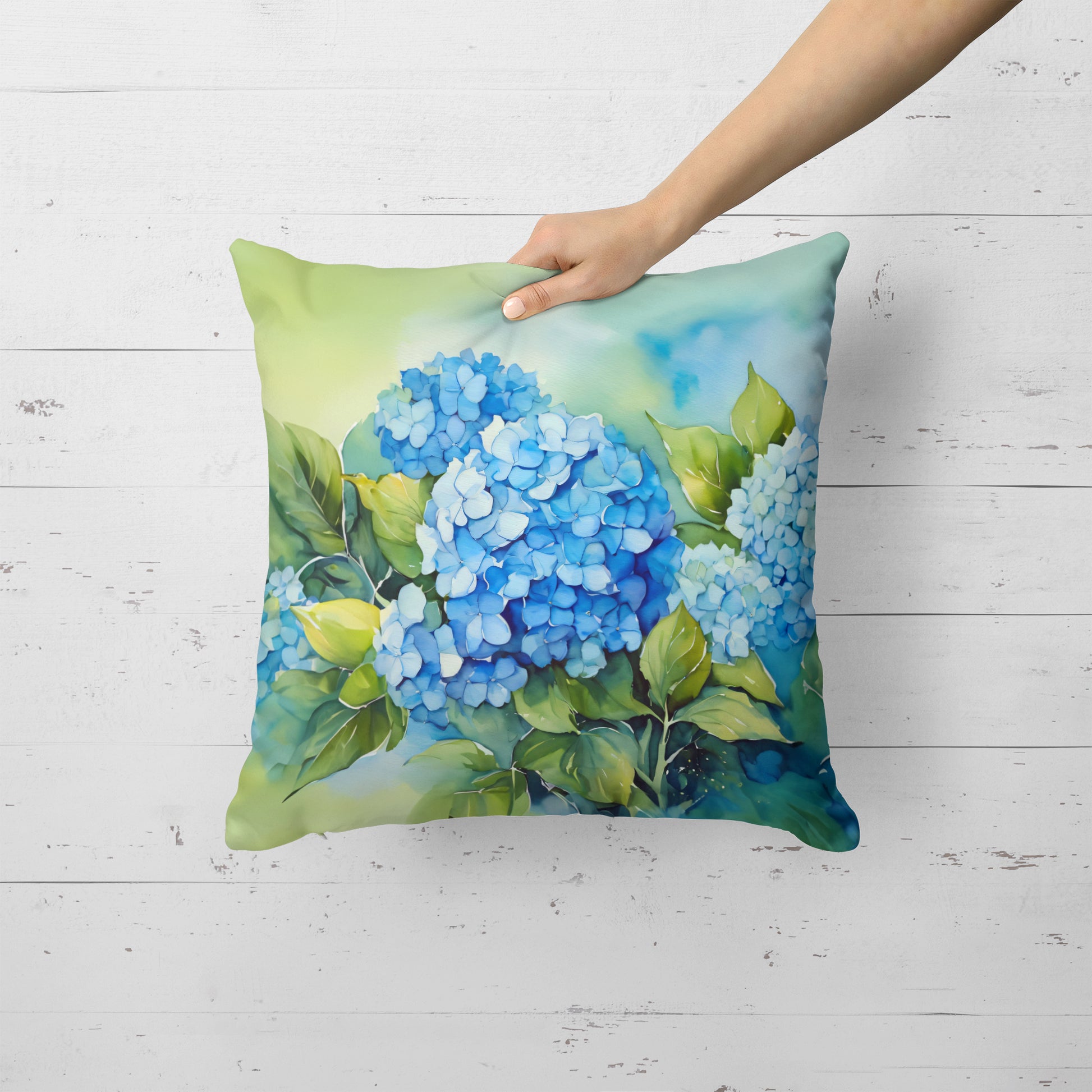 Throw Pillow featuring breed specific Hydrangeas artwork. Revitalize your outdoor or indoor living space with Caroline's Treasures 18x18 Fabric Decorative Pillow. With a generously sized dimension of approximately 18 inches by 18 inches, this pillow makes a comfortable and aesthetic addition to any seating area. Made from a unique, water-resistant material developed by Caroline's Treasures, the pillow sham is 100% polyester fabric that's durable and ready to weather any condition. Its vibrant, full-color artwork will not fade over time as it is dyed with color-fast dyes. Whether you place it on your patio furniture, porch, veranda, or indoor couch, its soft canvas fabric ensures a cozy experience. The pillow is handcrafted in the United States, featuring a sham created from three pieces of fabric and a polyester insert for enduring shape and overstuffed comfort. Despite being robustly built to endure the outdoors, it is as soft and snug as your favorite indoor cushions. Please note, as all our pillows are handmade, sizes may vary slightly, adding to the charm of this unique decorative item.