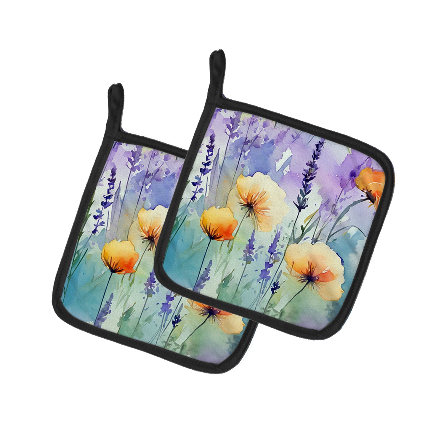Pair of Pot Holders featuring breed specific Lavender artwork. A Pair of Pot Holders to match your kitchen decor. Made in the USA these are thick and functional. Full color artwork decorates the front polyester fabric of the hot pad and accented by a black trim. Use these at as a trivet for your Thanksgiving or Christmas tablescape. Filled with insulated fabric and quilted for durability. These colorful pot holders will make a great gift for your favorite home cook or executive chef. Each pot holder measures approximately 7 1/2 inches by 7 1/2 inches. A hanging tab is included.