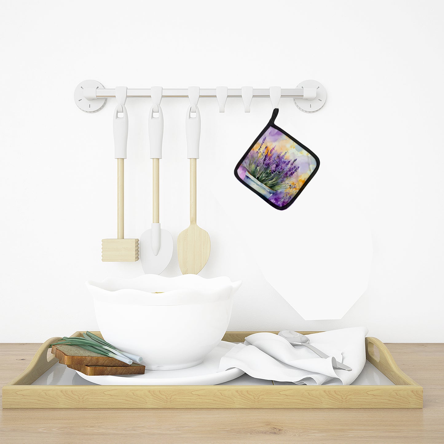Pair of Pot Holders featuring breed specific Lavender artwork. A Pair of Pot Holders to match your kitchen decor. Made in the USA these are thick and functional. Full color artwork decorates the front polyester fabric of the hot pad and accented by a black trim. Use these at as a trivet for your Thanksgiving or Christmas tablescape. Filled with insulated fabric and quilted for durability. These colorful pot holders will make a great gift for your favorite home cook or executive chef. Each pot holder measures approximately 7 1/2 inches by 7 1/2 inches. A hanging tab is included.