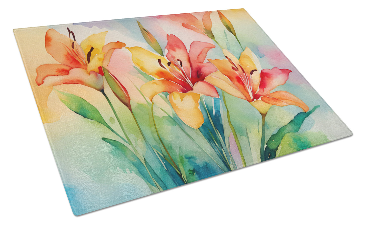 Glass Cutting Board featuring breed specific Lilies artwork. Introduce your kitchen to the vibrant, large Decorative Glass Cutting Board from Caroline's Treasures. Crafted from resilient tempered glass, this board is not only a utilitarian necessity but also a colorful art piece. With its generous dimensions of 15 inches in height and 12 inches in length, it offers ample space for all your cutting needs. Every piece showcases captivating artwork from distinguished artists, bringing an aesthetic edge to your kitchen. Beyond its attractive design, this cutting board ensures your countertop stays pristine and unscathed, owing to its heat-resistant properties. Engineered with user convenience in mind, it features non-skid feet for stability, and rounded corners for additional safety. Its robust construction renders it virtually unbreakable, guaranteeing longevity. The board comes with protective feet bumpers, maintaining its position during use. This product is recommended to be hand washed only. Proudly printed and assembled in the United States, this cutting board exemplifies superior craftsmanship. With Caroline's Treasures' Decorative Glass Cutting Board, you're investing in a blend of functionality and artistic flair.