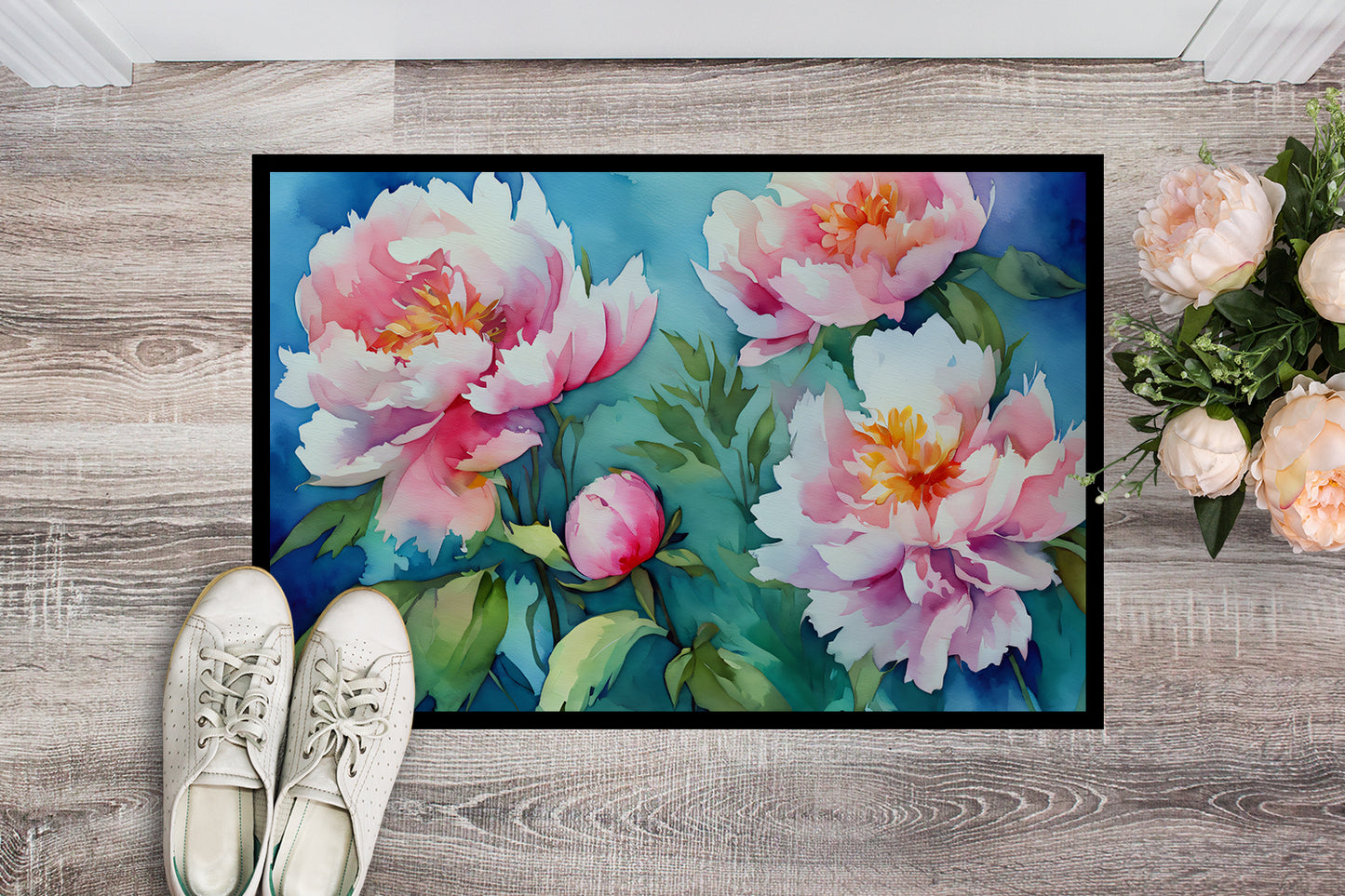 Doormat featuring breed specific Peonies artwork. Welcome your guests in style with our Artwork Door Mat, designed to withstand almost any weather condition. This mat, measuring approximately 24 by 36 inches, is held together by durable black binding tape. Its top layer, composed of polyester felt, is dyed with the eye-catching image you see on the mat. A few layers below provide the mat with stability, while its rubber bottom is stamped to help prevent slipping and ensures safety. Our mat works wonderfully as both an indoor or outdoor door mat. For cleaning, simply hose it off with water or use a power washer - no need for any cleaner that produces suds. Avoid scrubbing with a brush, instead, opt for the vacuum on floor setting. Designed manufactured and printed in the USA, this mat is a perfect addition to your porch, outdoor kitchen, entryway, or any indoor space. Its unique design makes it a charming decorative rug that greets your guests and adds a stylish touch to your home decor.