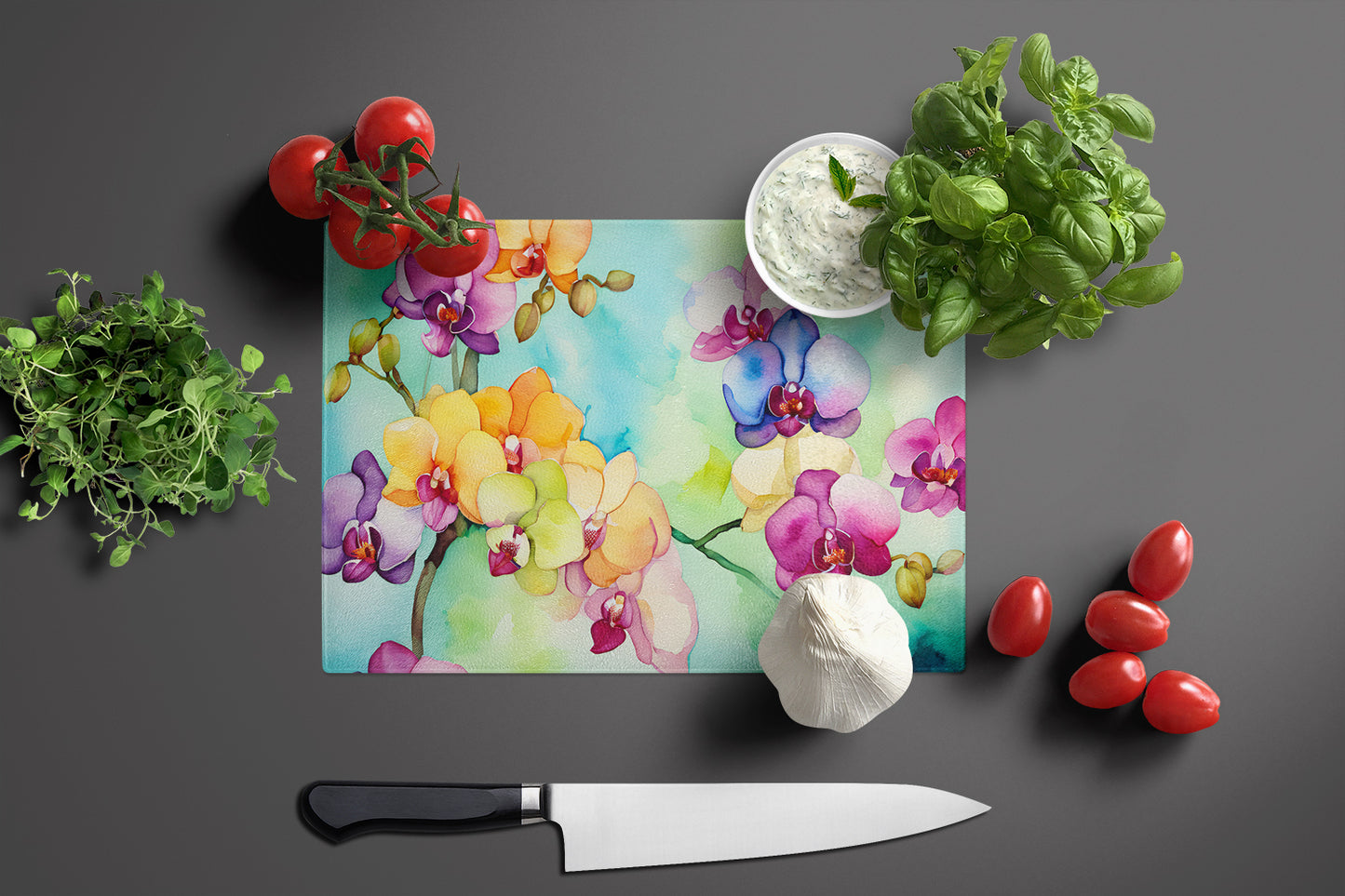 Glass Cutting Board featuring breed specific Orchids artwork. Introduce your kitchen to the vibrant, large Decorative Glass Cutting Board from Caroline's Treasures. Crafted from resilient tempered glass, this board is not only a utilitarian necessity but also a colorful art piece. With its generous dimensions of 15 inches in height and 12 inches in length, it offers ample space for all your cutting needs. Every piece showcases captivating artwork from distinguished artists, bringing an aesthetic edge to your kitchen. Beyond its attractive design, this cutting board ensures your countertop stays pristine and unscathed, owing to its heat-resistant properties. Engineered with user convenience in mind, it features non-skid feet for stability, and rounded corners for additional safety. Its robust construction renders it virtually unbreakable, guaranteeing longevity. The board comes with protective feet bumpers, maintaining its position during use. This product is recommended to be hand washed only. Proudly printed and assembled in the United States, this cutting board exemplifies superior craftsmanship. With Caroline's Treasures' Decorative Glass Cutting Board, you're investing in a blend of functionality and artistic flair.