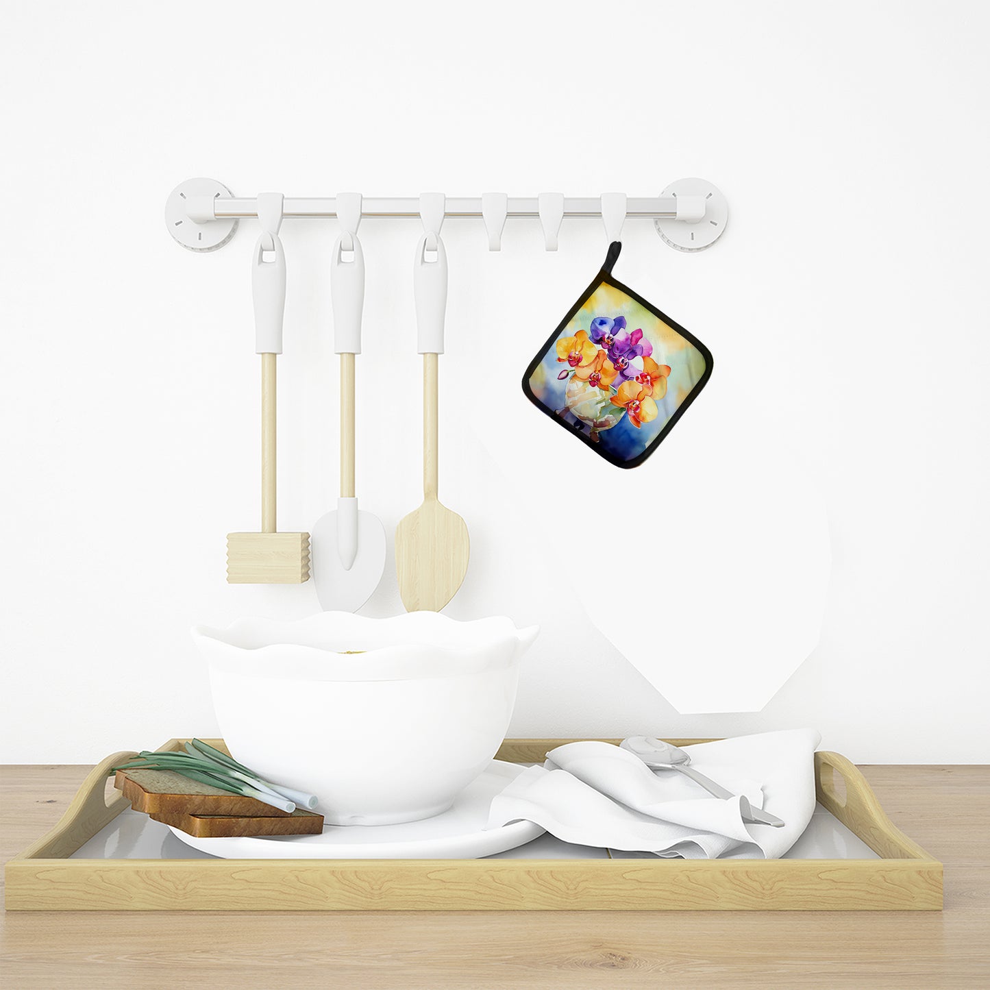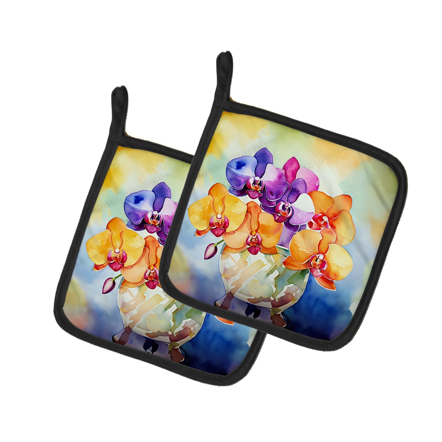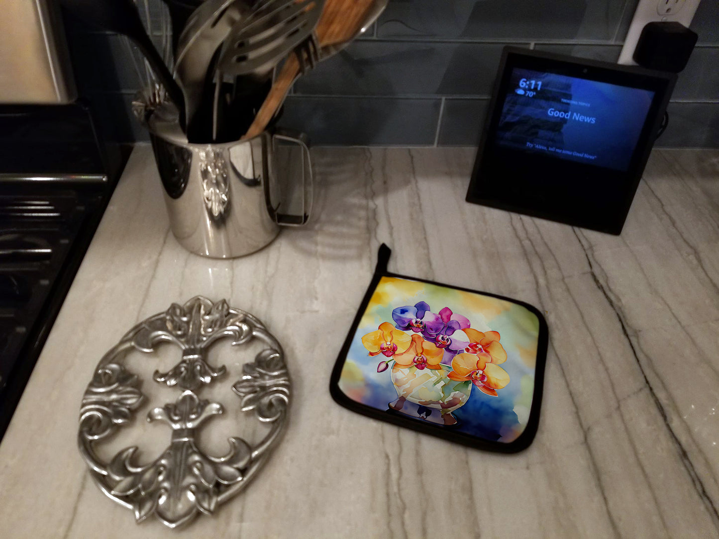 Pair of Pot Holders featuring breed specific Orchids artwork. A Pair of Pot Holders to match your kitchen decor. Made in the USA these are thick and functional. Full color artwork decorates the front polyester fabric of the hot pad and accented by a black trim. Use these at as a trivet for your Thanksgiving or Christmas tablescape. Filled with insulated fabric and quilted for durability. These colorful pot holders will make a great gift for your favorite home cook or executive chef. Each pot holder measures approximately 7 1/2 inches by 7 1/2 inches. A hanging tab is included.
