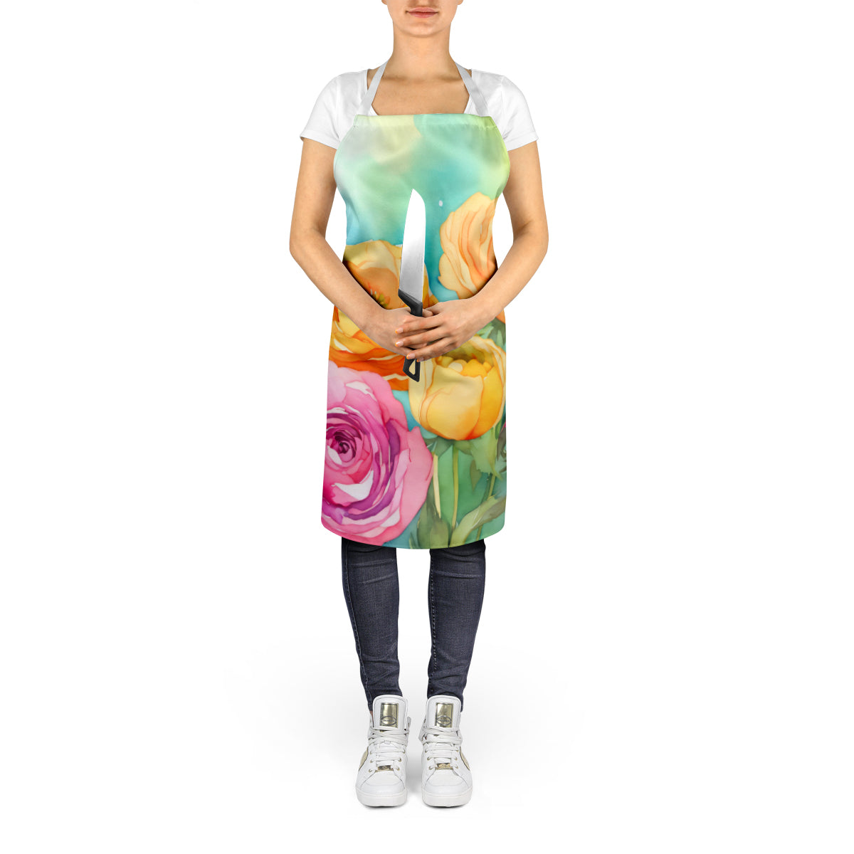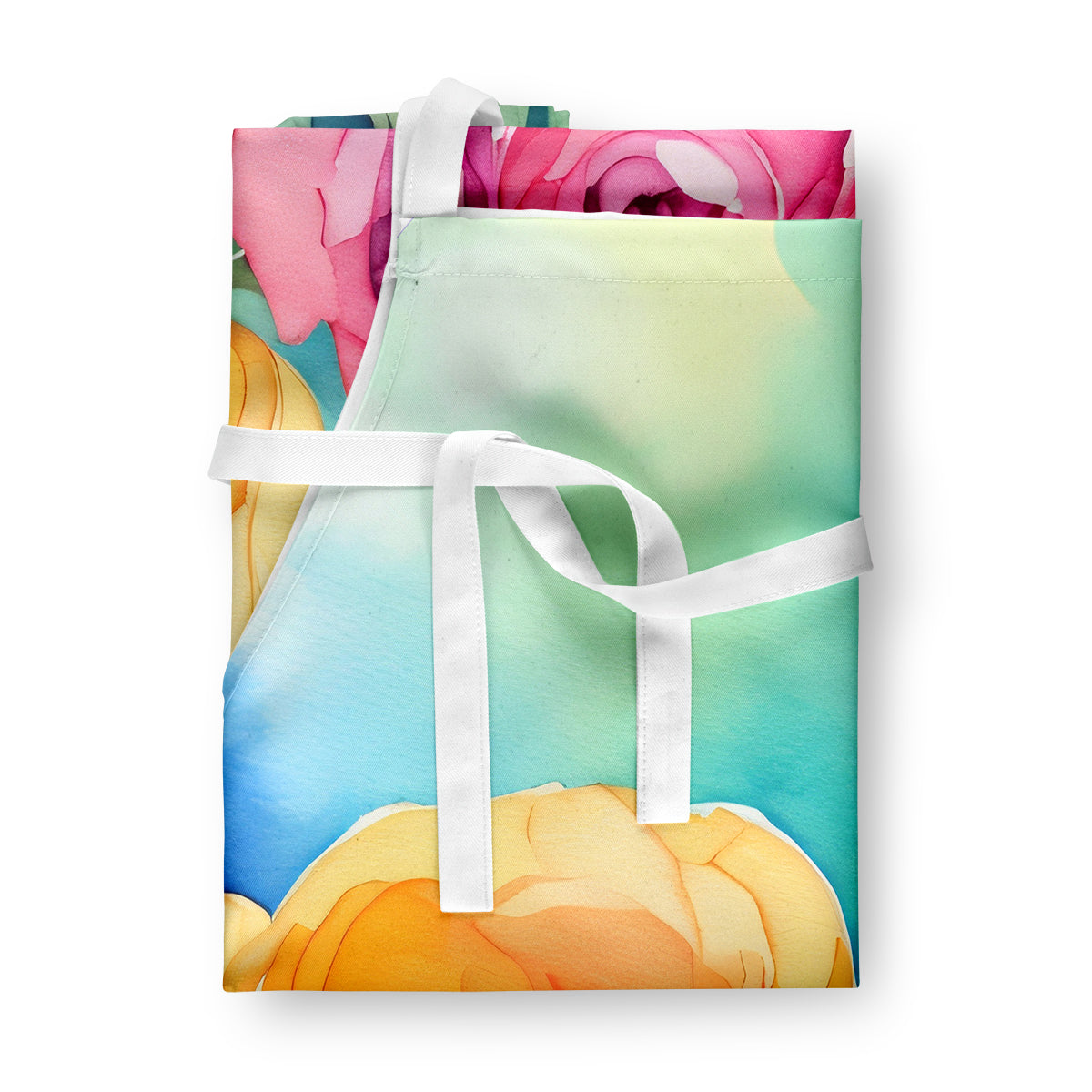 Apron featuring breed specific Ranunculus artwork. Elevate your cooking, baking, and grilling experiences with our versatile Kitchen or BBQ Apron. This Bib Style apron isn't just limited to culinary activities - it also serves as an excellent baking apron, artist apron, server apron, gardening apron, or even a dog grooming apron. The apron showcases vibrant full-color artwork contributed by one of our talented artists, bringing a dash of style to your daily tasks. With dimensions of approximately 27"W x 30"H, it provides ample coverage to protect your clothing from spills and splashes. Our apron is meticulously crafted from 100% Ultra Spun Polyester, known for its durability and lightweight nature. The apron comes with white tie straps, ensuring a comfortable and adjustable fit for all. It's a perfect choice for kitchen apron enthusiasts, whether you are a woman or a man. Designed for easy maintenance, this apron is fully machine washable. The quick-drying polyester material actively reduces staining, keeping your apron looking fresh and new for longer. Our beautifully designed apron isn't just a functional kitchen accessory - it's a fashion statement in the culinary world!