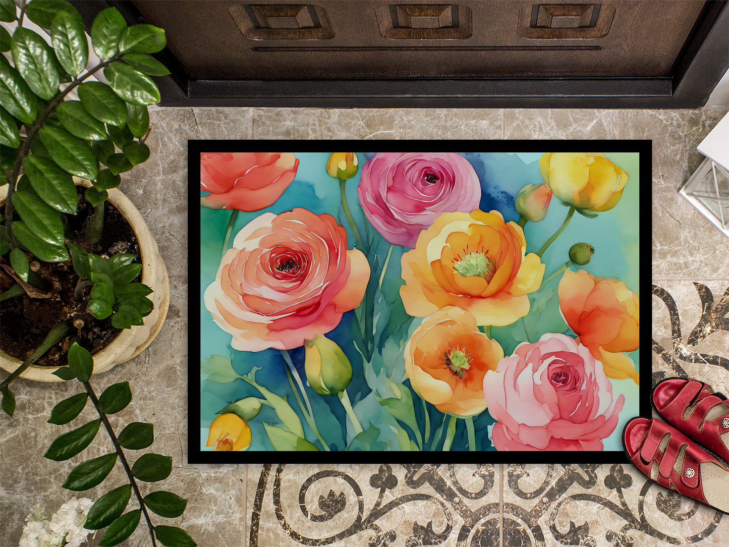 Doormat featuring breed specific Ranunculus artwork. Welcome your guests in style with our Artwork Door Mat, designed to withstand almost any weather condition. This mat, measuring approximately 24 by 36 inches, is held together by durable black binding tape. Its top layer, composed of polyester felt, is dyed with the eye-catching image you see on the mat. A few layers below provide the mat with stability, while its rubber bottom is stamped to help prevent slipping and ensures safety. Our mat works wonderfully as both an indoor or outdoor door mat. For cleaning, simply hose it off with water or use a power washer - no need for any cleaner that produces suds. Avoid scrubbing with a brush, instead, opt for the vacuum on floor setting. Designed manufactured and printed in the USA, this mat is a perfect addition to your porch, outdoor kitchen, entryway, or any indoor space. Its unique design makes it a charming decorative rug that greets your guests and adds a stylish touch to your home decor.