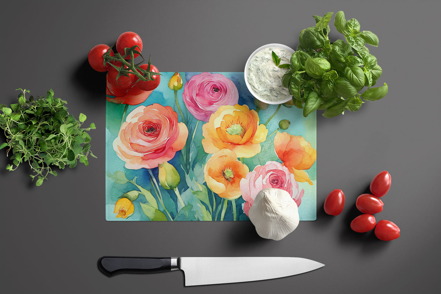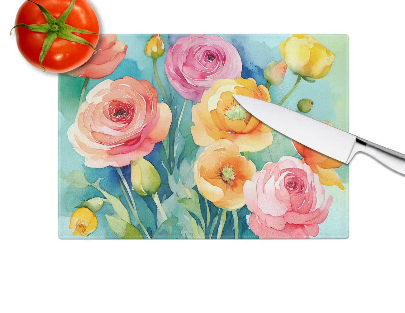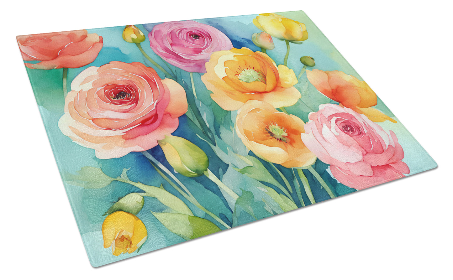 Ranunculus in Watercolor Glass Cutting Board