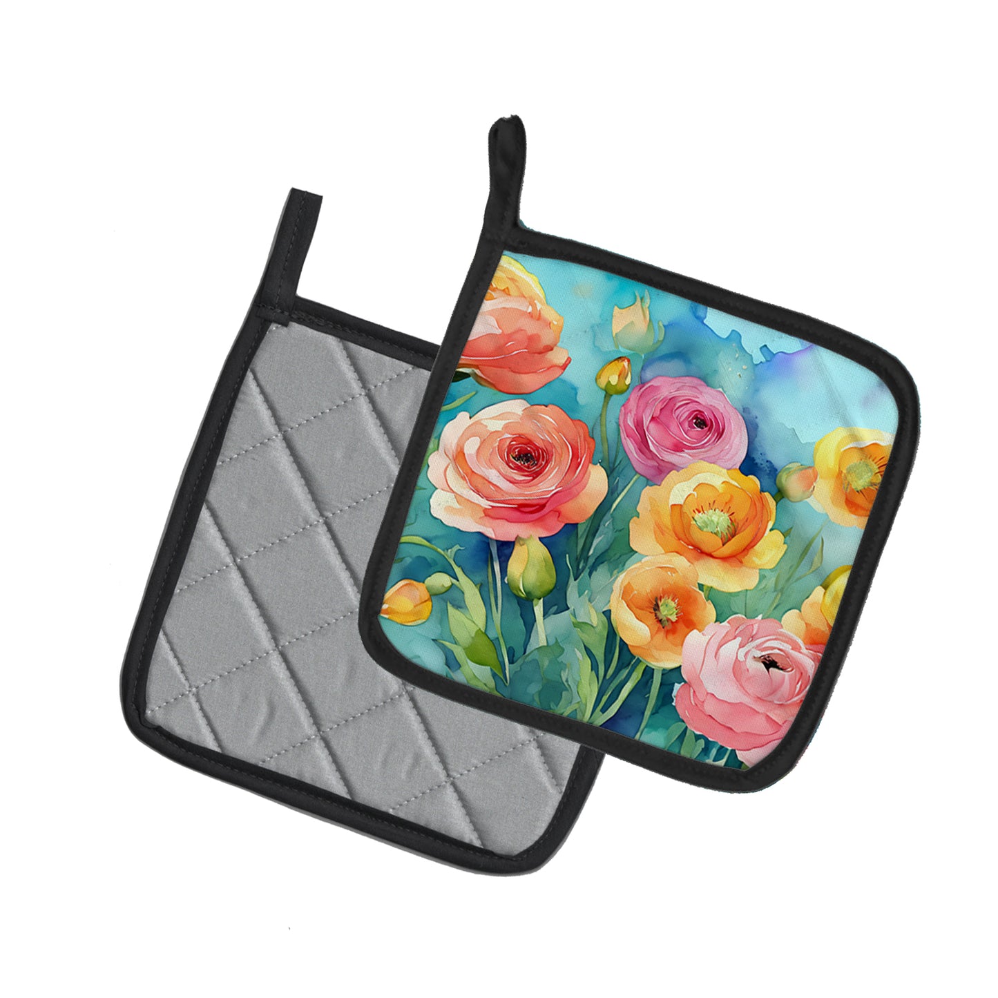 Pair of Pot Holders featuring breed specific Ranunculus artwork. A Pair of Pot Holders to match your kitchen decor. Made in the USA these are thick and functional. Full color artwork decorates the front polyester fabric of the hot pad and accented by a black trim. Use these at as a trivet for your Thanksgiving or Christmas tablescape. Filled with insulated fabric and quilted for durability. These colorful pot holders will make a great gift for your favorite home cook or executive chef. Each pot holder measures approximately 7 1/2 inches by 7 1/2 inches. A hanging tab is included.