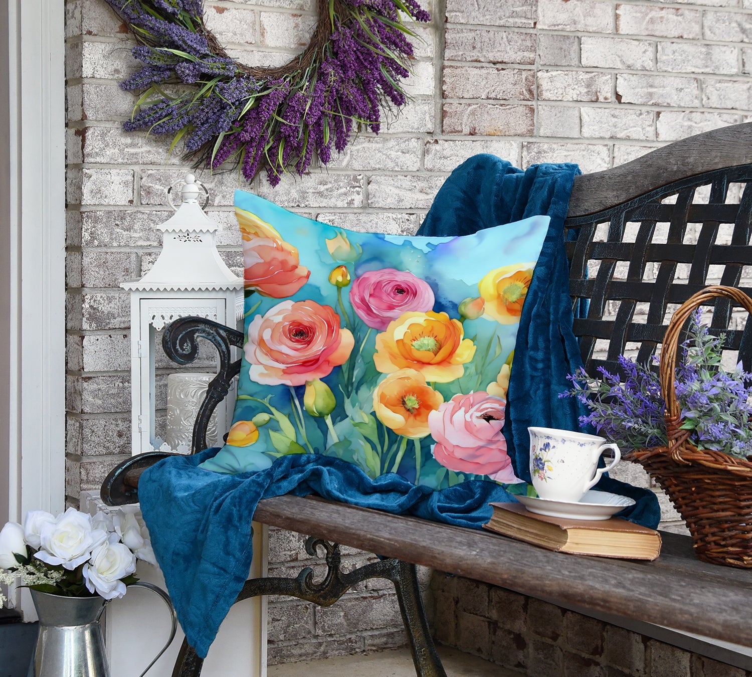 Throw Pillow featuring breed specific Ranunculus artwork. Revitalize your outdoor or indoor living space with Caroline's Treasures 18x18 Fabric Decorative Pillow. With a generously sized dimension of approximately 18 inches by 18 inches, this pillow makes a comfortable and aesthetic addition to any seating area. Made from a unique, water-resistant material developed by Caroline's Treasures, the pillow sham is 100% polyester fabric that's durable and ready to weather any condition. Its vibrant, full-color artwork will not fade over time as it is dyed with color-fast dyes. Whether you place it on your patio furniture, porch, veranda, or indoor couch, its soft canvas fabric ensures a cozy experience. The pillow is handcrafted in the United States, featuring a sham created from three pieces of fabric and a polyester insert for enduring shape and overstuffed comfort. Despite being robustly built to endure the outdoors, it is as soft and snug as your favorite indoor cushions. Please note, as all our pillows are handmade, sizes may vary slightly, adding to the charm of this unique decorative item.