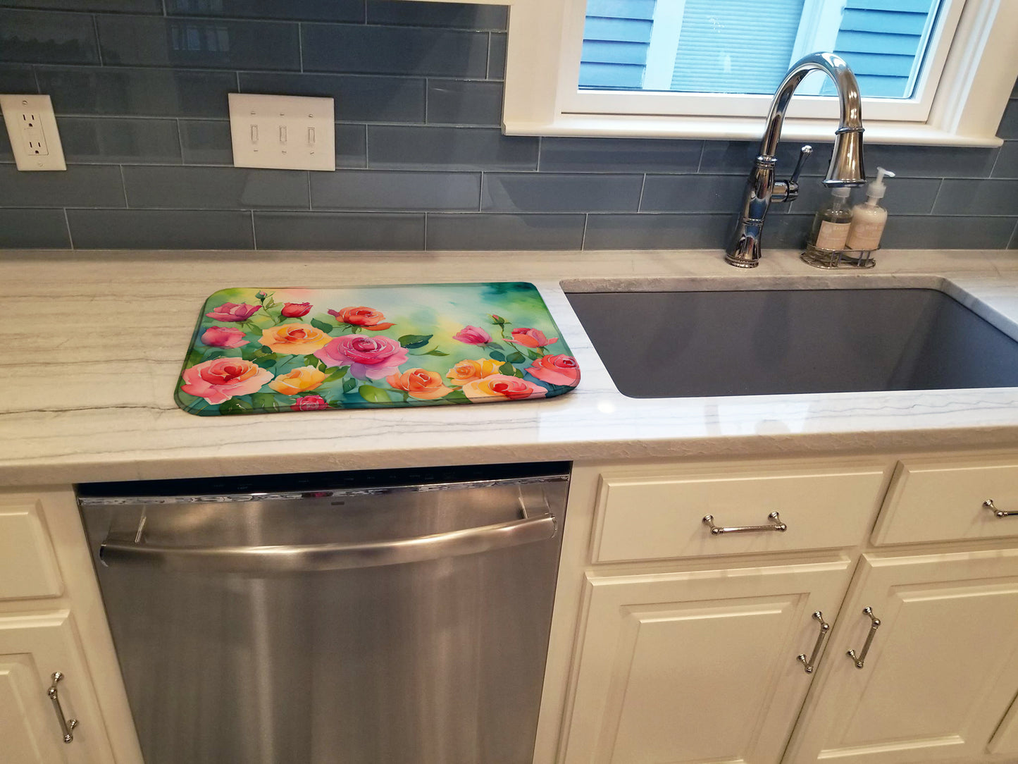 Dish Drying Mat featuring breed specific Roses artwork. Say goodbye to messy countertops and soggy dish towels with our innovative dish drying mat. Our high-quality dish drying pad is designed to keep your countertops dry while offering a stylish and efficient solution. Whether you're air drying dishes, glasses, stemware, silverware, pots, pans, bottles, or even fruits and vegetables, our dish mat is the perfect choice. The 14 inches x 22 inches size fits most counters and dish drying racks, and the non-slip design ensures stability. Made with water-absorbent polyester and a polyurethane foam insert, our dish drying mat is not only functional but also durable. It's machine washable and printed in the USA for long-lasting use. The beautiful artwork adds flair to your kitchen decor, making it a perfect housewarming gift or present for any occasion. Upgrade your kitchen experience with our absorbent and versatile dish drying mat.