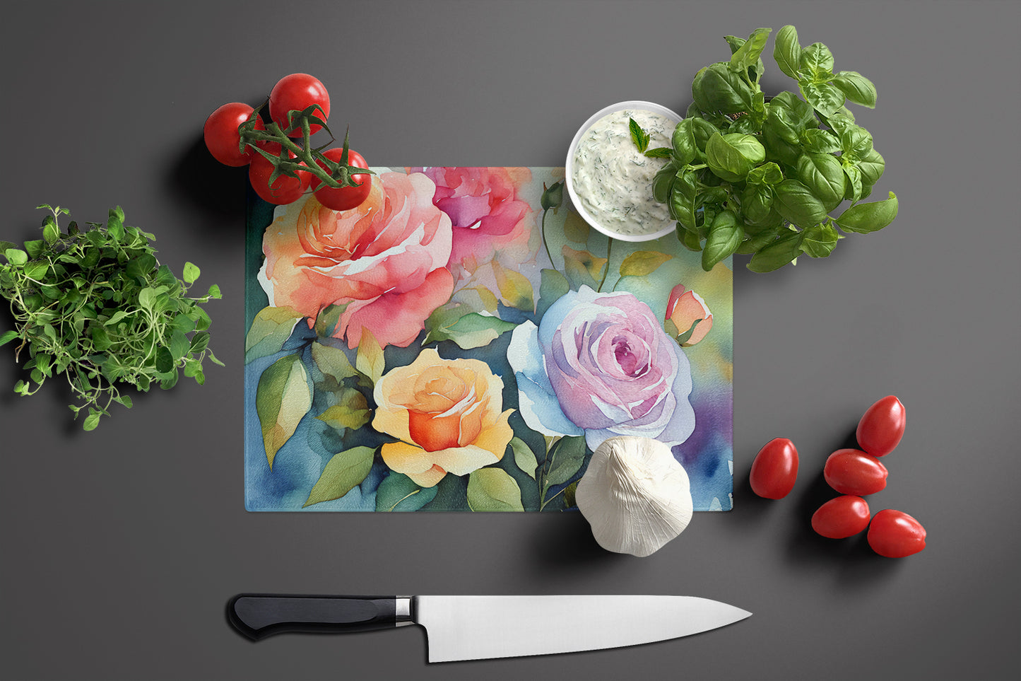 Glass Cutting Board featuring breed specific Roses artwork. Introduce your kitchen to the vibrant, large Decorative Glass Cutting Board from Caroline's Treasures. Crafted from resilient tempered glass, this board is not only a utilitarian necessity but also a colorful art piece. With its generous dimensions of 15 inches in height and 12 inches in length, it offers ample space for all your cutting needs. Every piece showcases captivating artwork from distinguished artists, bringing an aesthetic edge to your kitchen. Beyond its attractive design, this cutting board ensures your countertop stays pristine and unscathed, owing to its heat-resistant properties. Engineered with user convenience in mind, it features non-skid feet for stability, and rounded corners for additional safety. Its robust construction renders it virtually unbreakable, guaranteeing longevity. The board comes with protective feet bumpers, maintaining its position during use. This product is recommended to be hand washed only. Proudly printed and assembled in the United States, this cutting board exemplifies superior craftsmanship. With Caroline's Treasures' Decorative Glass Cutting Board, you're investing in a blend of functionality and artistic flair.