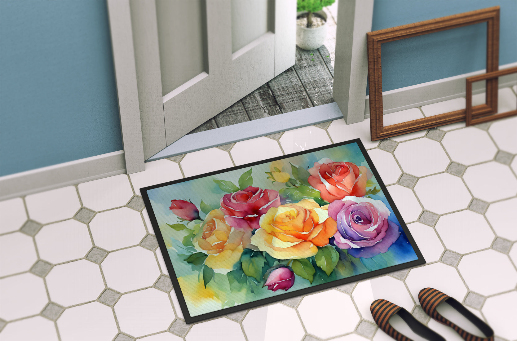 Doormat featuring breed specific Roses artwork. Welcome your guests in style with our Artwork Door Mat, designed to withstand almost any weather condition. This mat, measuring approximately 18 by 27 inches, is held together by durable black binding tape. Its top layer, composed of polyester felt, is dyed with the eye-catching image you see on the mat. A few layers below provide the mat with stability, while its rubber bottom is stamped to help prevent slipping and ensures safety. Our mat works wonderfully as both an indoor or outdoor door mat. For cleaning, simply hose it off with water or use a power washer - no need for any cleaner that produces suds. Avoid scrubbing with a brush, instead, opt for the vacuum on floor setting. Designed manufactured and printed in the USA, this mat is a perfect addition to your porch, outdoor kitchen, entryway, or any indoor space. Its unique design makes it a charming decorative rug that greets your guests and adds a stylish touch to your home decor.