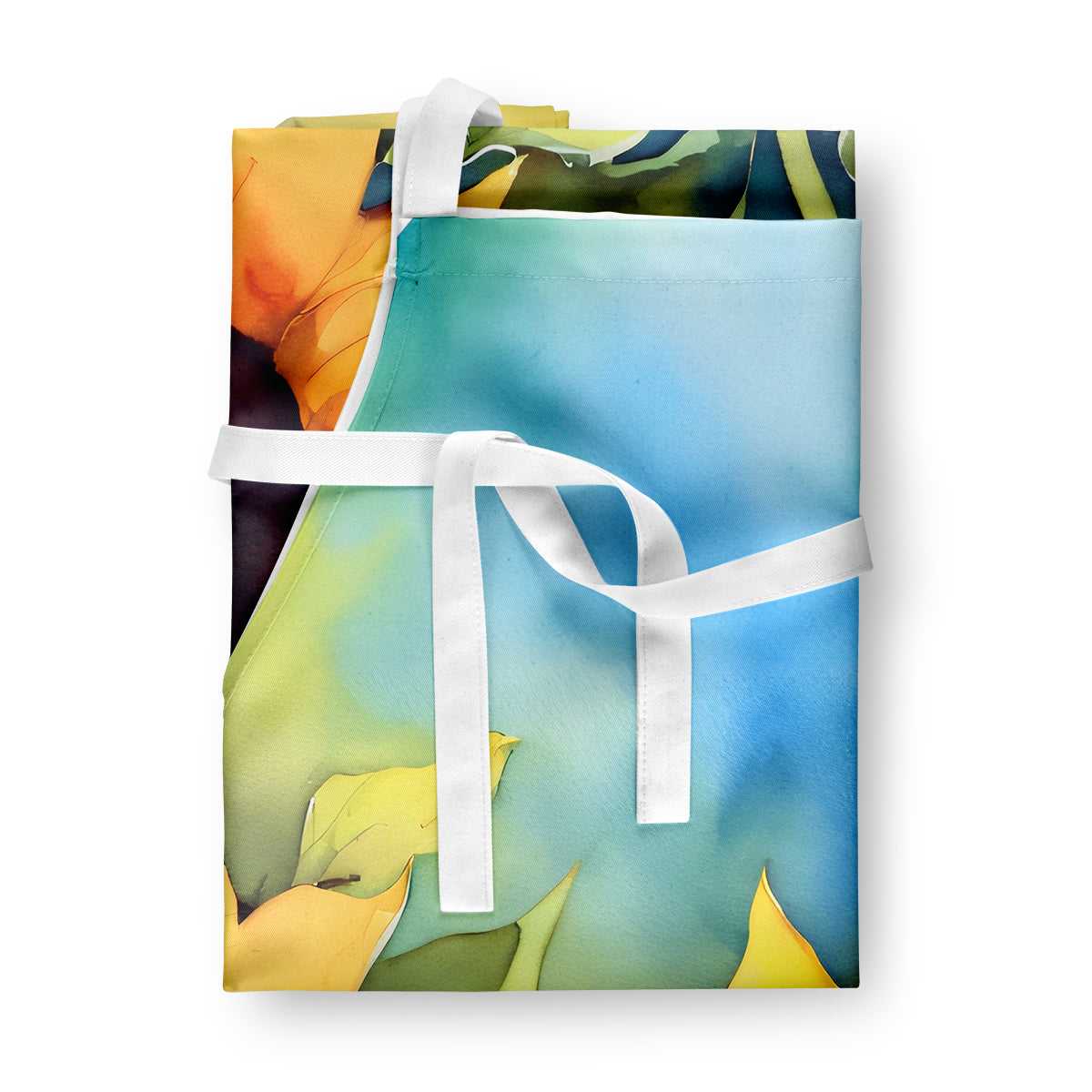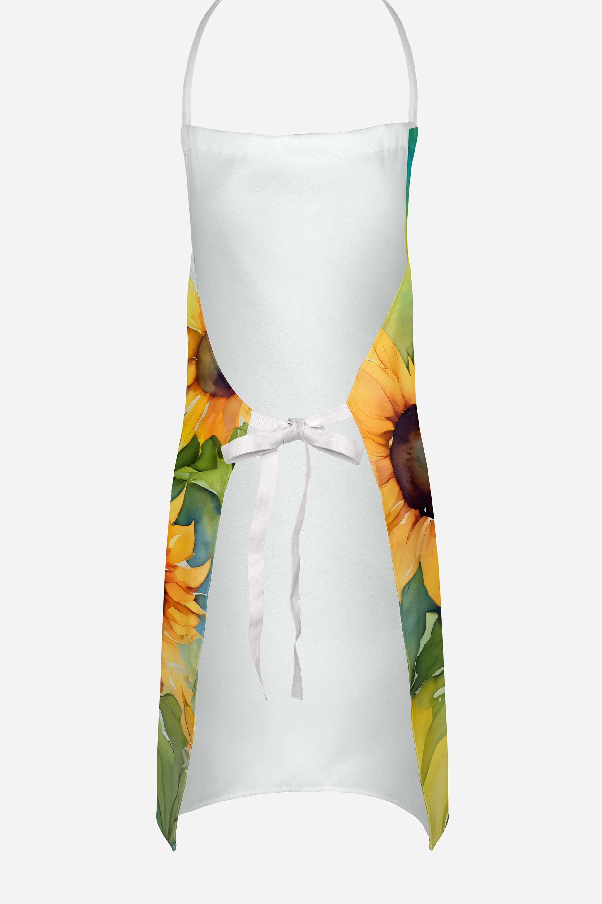 Apron featuring breed specific Sunflowers artwork. Elevate your cooking, baking, and grilling experiences with our versatile Kitchen or BBQ Apron. This Bib Style apron isn't just limited to culinary activities - it also serves as an excellent baking apron, artist apron, server apron, gardening apron, or even a dog grooming apron. The apron showcases vibrant full-color artwork contributed by one of our talented artists, bringing a dash of style to your daily tasks. With dimensions of approximately 27"W x 30"H, it provides ample coverage to protect your clothing from spills and splashes. Our apron is meticulously crafted from 100% Ultra Spun Polyester, known for its durability and lightweight nature. The apron comes with white tie straps, ensuring a comfortable and adjustable fit for all. It's a perfect choice for kitchen apron enthusiasts, whether you are a woman or a man. Designed for easy maintenance, this apron is fully machine washable. The quick-drying polyester material actively reduces staining, keeping your apron looking fresh and new for longer. Our beautifully designed apron isn't just a functional kitchen accessory - it's a fashion statement in the culinary world!