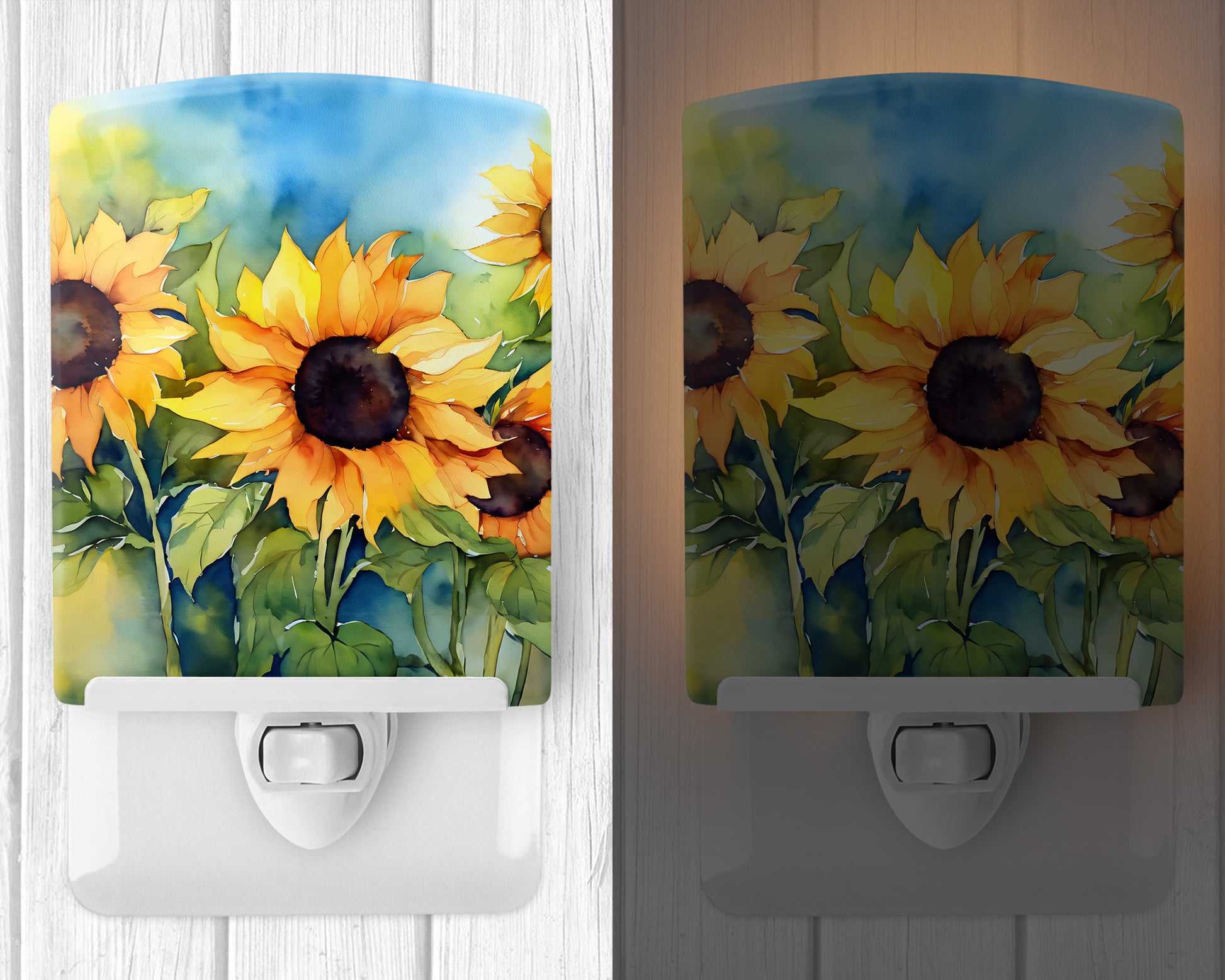 Ceramic Night Light featuring breed specific Sunflowers artwork. Introduce a splash of artistic flair and subtle illumination to your space with the Decorative Ceramic Night Light from Caroline's Treasures. Perfect for any room, this night light seamlessly blends functionality with an aesthetic appeal, offering a stylish solution to brighten up dark corners of your home or office. Boasting a six-inch high by four-inch wide ceramic tile at the front, it showcases vivid, full-color artwork from distinguished artists, transforming a simple utility into a vibrant art piece. The artwork is securely encased in a robust metal holder, ensuring durability and longevity. Two screws are provided to firmly affix the tile into the holder. The holder extends three inches deep, housing an included bulb that emits a soft, welcoming glow. This product meets all safety standards, as evidenced by its UL approval. Proudly made in the United States from imported components, this Decorative Ceramic Night Light is not just a functional device; it's a statement piece that enhances the ambiance of your surroundings.