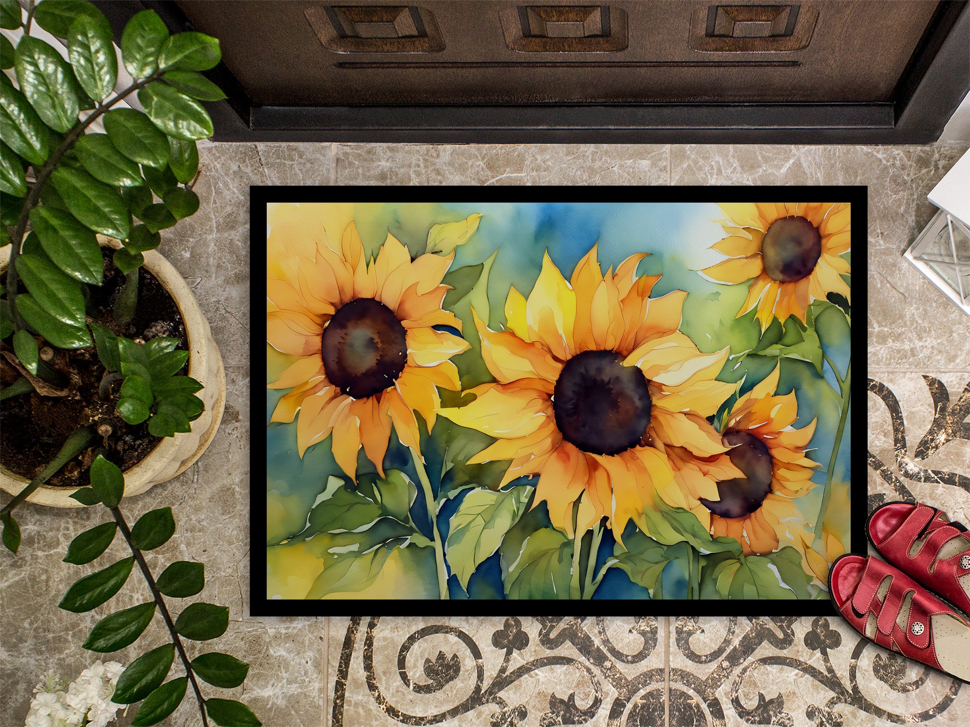 Doormat featuring breed specific Sunflowers artwork. Welcome your guests in style with our Artwork Door Mat, designed to withstand almost any weather condition. This mat, measuring approximately 24 by 36 inches, is held together by durable black binding tape. Its top layer, composed of polyester felt, is dyed with the eye-catching image you see on the mat. A few layers below provide the mat with stability, while its rubber bottom is stamped to help prevent slipping and ensures safety. Our mat works wonderfully as both an indoor or outdoor door mat. For cleaning, simply hose it off with water or use a power washer - no need for any cleaner that produces suds. Avoid scrubbing with a brush, instead, opt for the vacuum on floor setting. Designed manufactured and printed in the USA, this mat is a perfect addition to your porch, outdoor kitchen, entryway, or any indoor space. Its unique design makes it a charming decorative rug that greets your guests and adds a stylish touch to your home decor.