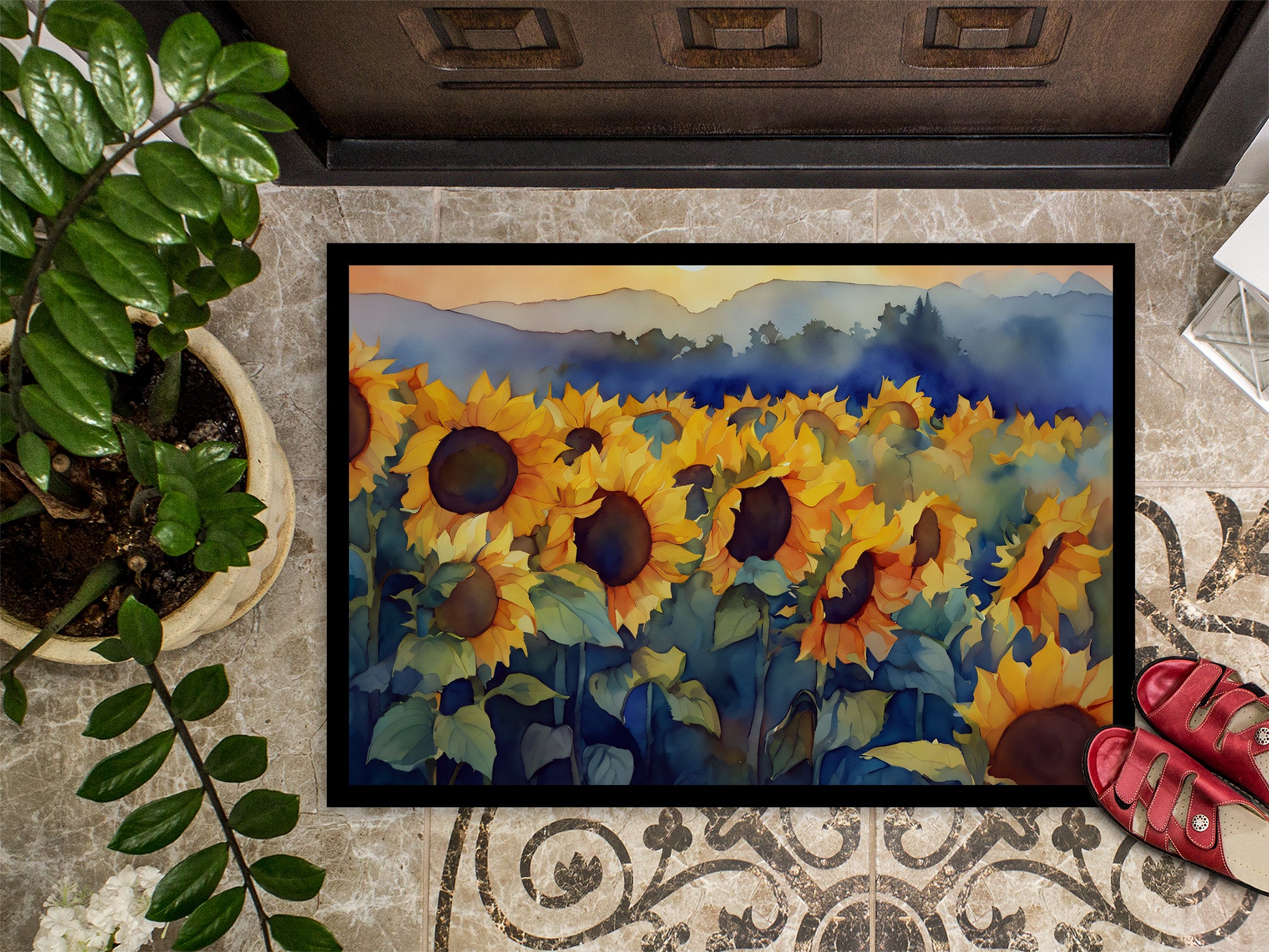 Doormat featuring breed specific Sunflowers artwork. Welcome your guests in style with our Artwork Door Mat, designed to withstand almost any weather condition. This mat, measuring approximately 24 by 36 inches, is held together by durable black binding tape. Its top layer, composed of polyester felt, is dyed with the eye-catching image you see on the mat. A few layers below provide the mat with stability, while its rubber bottom is stamped to help prevent slipping and ensures safety. Our mat works wonderfully as both an indoor or outdoor door mat. For cleaning, simply hose it off with water or use a power washer - no need for any cleaner that produces suds. Avoid scrubbing with a brush, instead, opt for the vacuum on floor setting. Designed manufactured and printed in the USA, this mat is a perfect addition to your porch, outdoor kitchen, entryway, or any indoor space. Its unique design makes it a charming decorative rug that greets your guests and adds a stylish touch to your home decor.