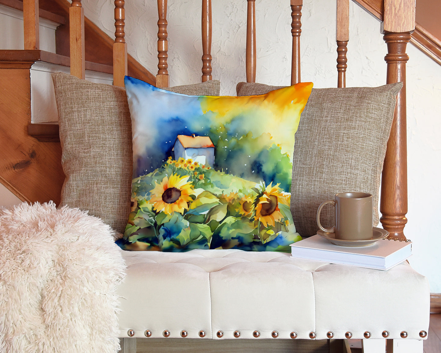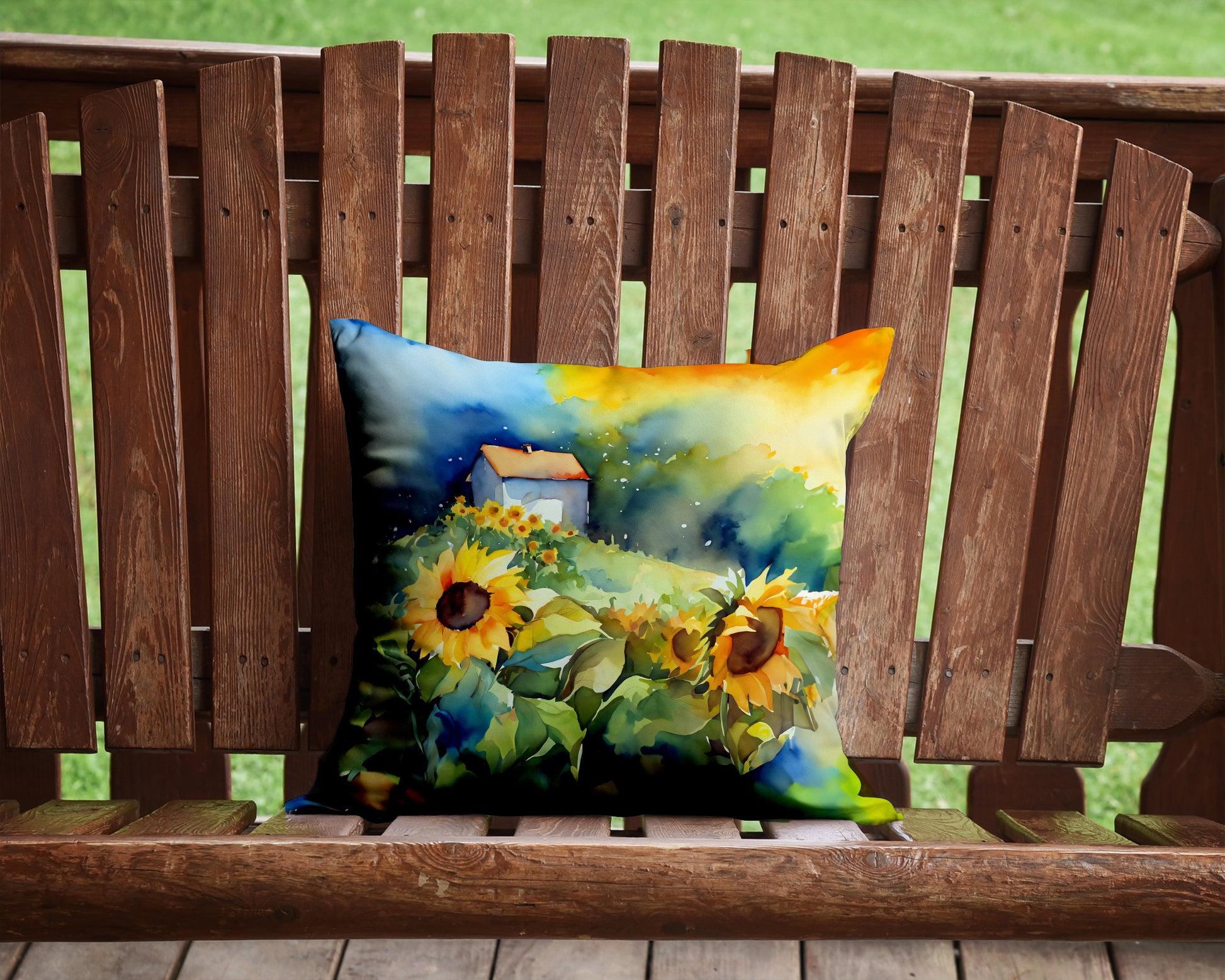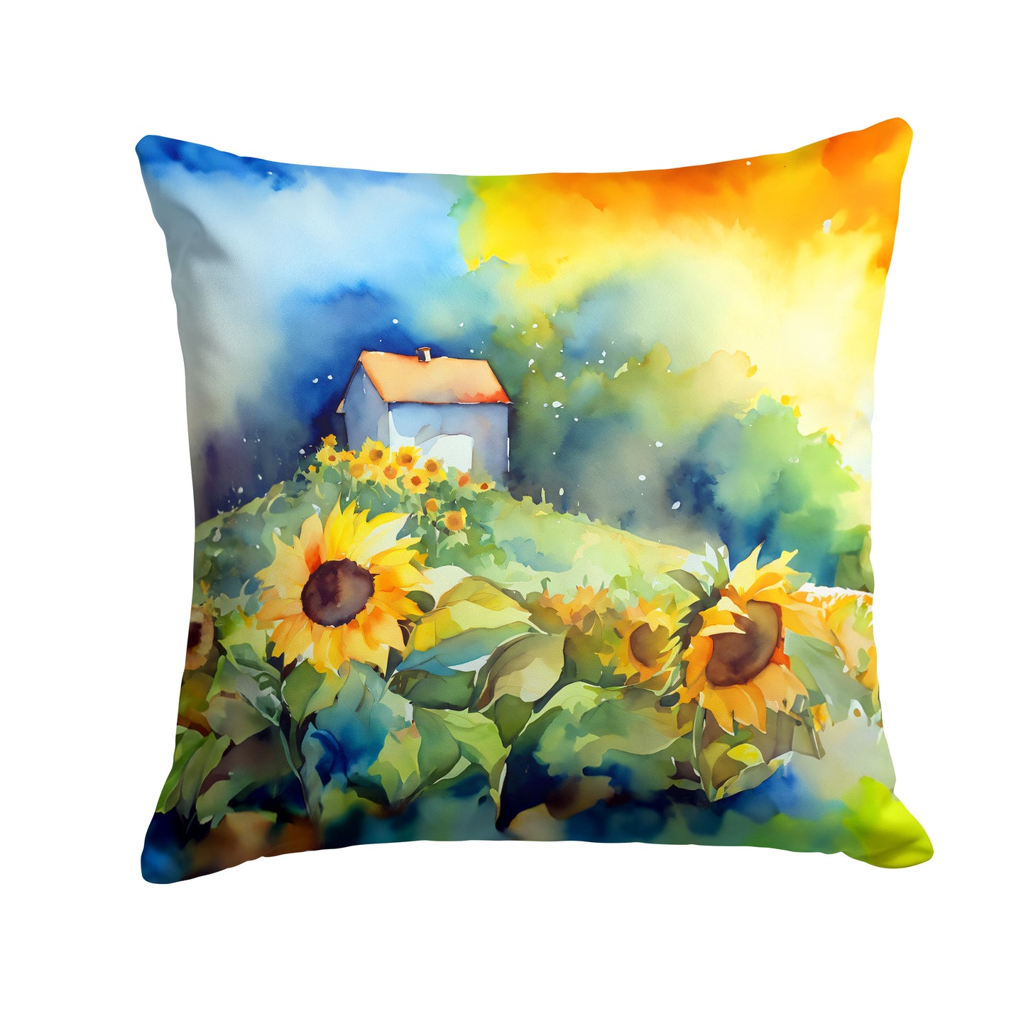 Throw Pillow featuring breed specific Sunflowers artwork. Add a touch of vibrancy and comfort to your outdoor seating with Caroline's Treasures Fabric Decorative Pillow. Measuring approximately 14 inches by 14 inches, this outdoor pillow is crafted to elevate the appeal of your patio furniture, infusing it with vivid color and artistic flair. The pillow includes a 100% Polyester Fabric sham filled with a quality pillow form to provide superior comfort. Innovatively made from our brand new material, specifically woven for its water resistance, this pillow is designed for durability. The soft canvas fabric offers versatility in use, fit for your indoor couch or your outdoor patio, porch, or veranda. The fabric is dyed with colorfast dyes built for resilience against weather conditions, ensuring the pillow retains its beauty over time. Constructed by sewing three fabric pieces to create a sham, the polyester insert is then nestled inside to form the pillow, resulting in an overstuffed pillow that maintains its shape. Both the sham and the pillow insert are proudly made in the United States. As the pillows are handcrafted, there may be minor variations in size, further enhancing their unique charm. Experience comfort in style with Caroline's Treasures Fabric Decorative Pillow.